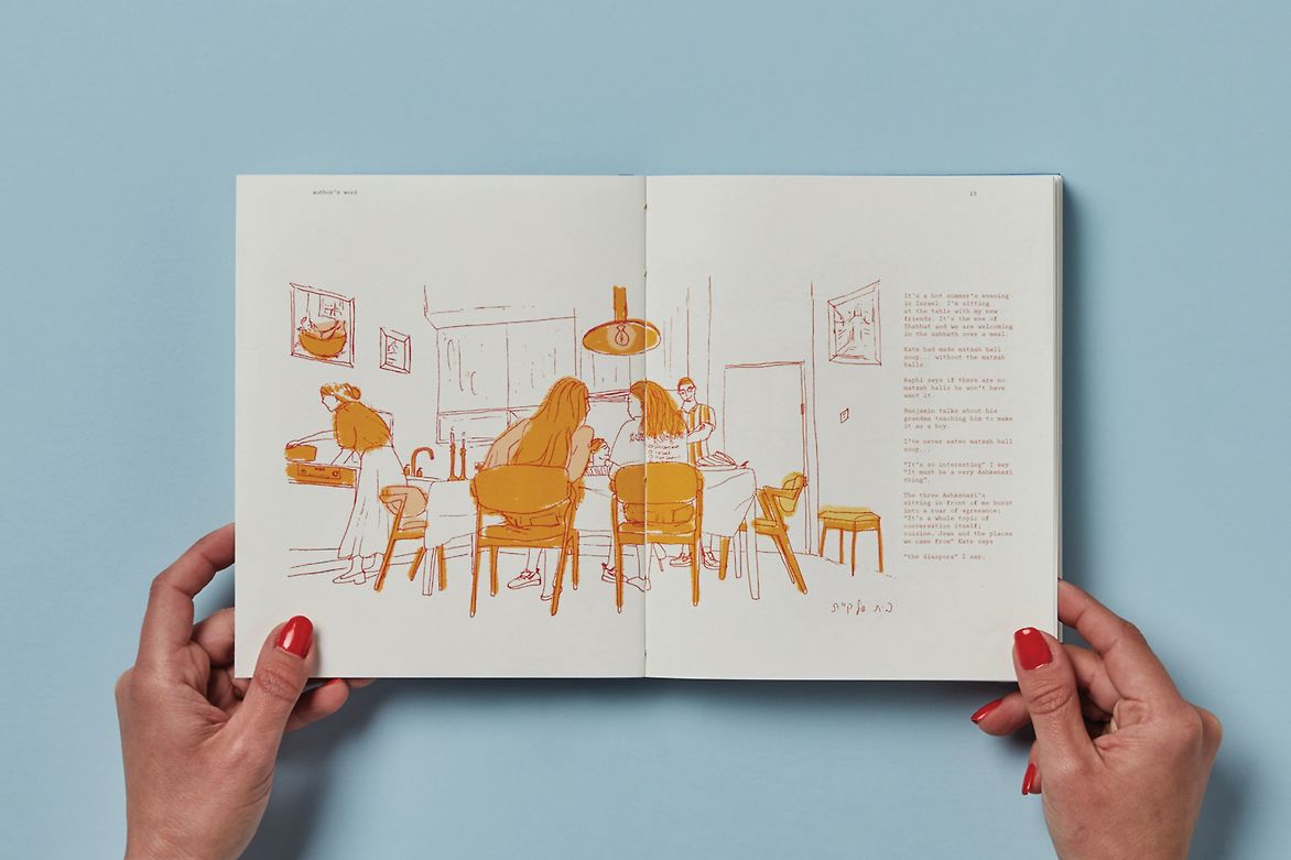The experience of entering a Jewish family’s house for Friday night Shabbat dinner is unique from family to family but also universal amongst Jews in its customary identifying features and traditions. I wanted this publication to reflect this experience. The bulk of the visual elements in this publication are hand illustrated drawings by myself, done on paper in my journal. Part of the reason for my largely analogue process in generating these illustrations, is to keep the integrity and lived experiences of my own, flowing through the movement of my pen on paper. Many of the drawings are inspired or based on old photographs of Jews and places Jews inhabited in the diaspora pre Israel gaining independence in 1948. I felt this helped advance the sincerity of the content and the realness of what happened to us as Jews without needing such explicit or literal depictions. The design choices and use of illustrations, colour palettes, typography, and layout emphasise alignment with the project's core purpose and strategy. By employing design elements that reflect Jewish identity and cultural motifs, the project seeks to evoke emotional connections and convey historical narratives visually.