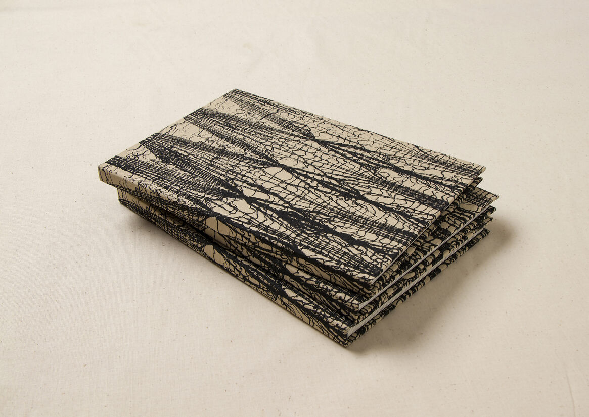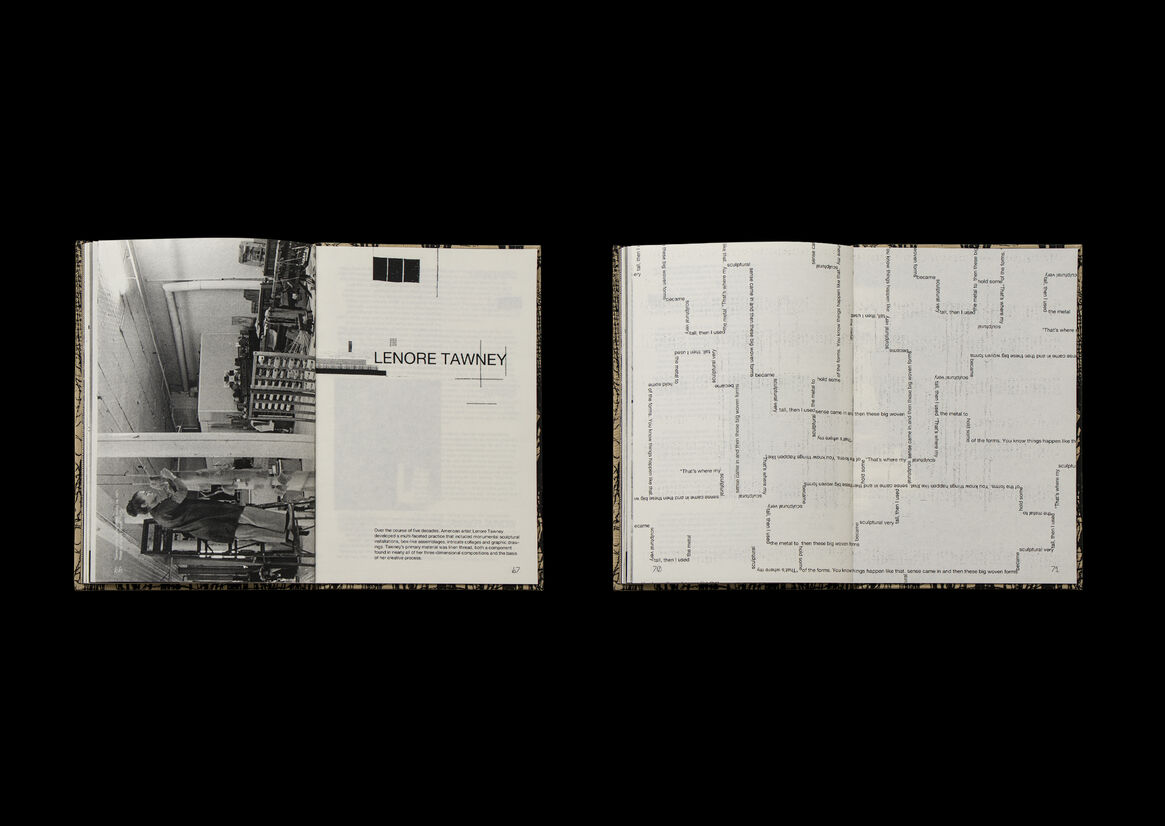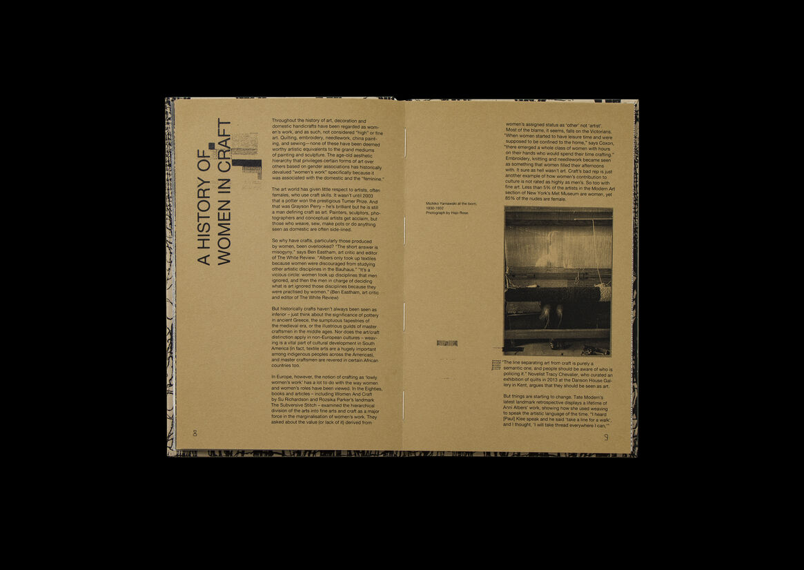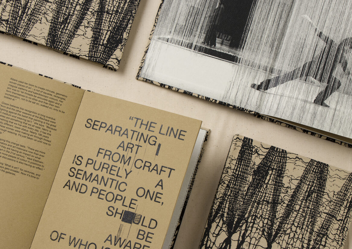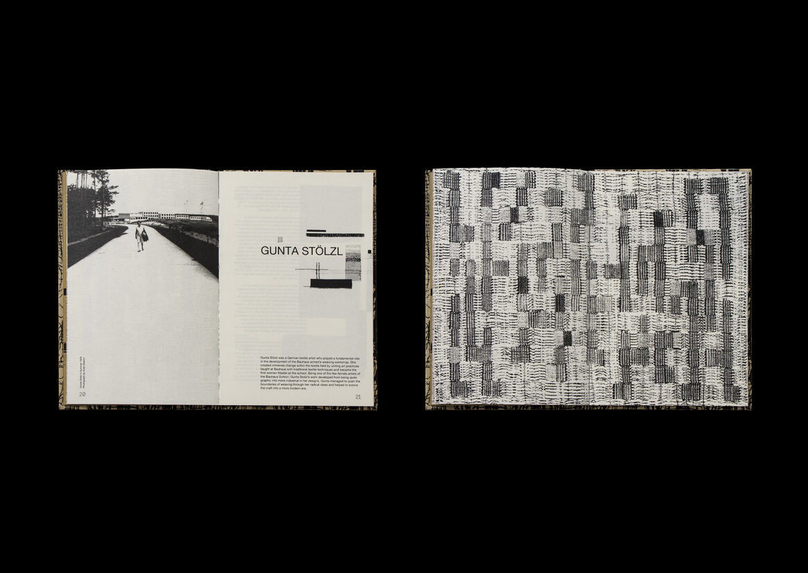 The sewn section binding in the publication reveals lines of threads which play into the concept of tactility, from which the design is heavily influenced. The hardbound cover cloth has been screen-printed with a texture extracted from a textile sample by Anni Albers who was a pioneer textile artist and printmaker, credited with blurring the lines between craft and art.