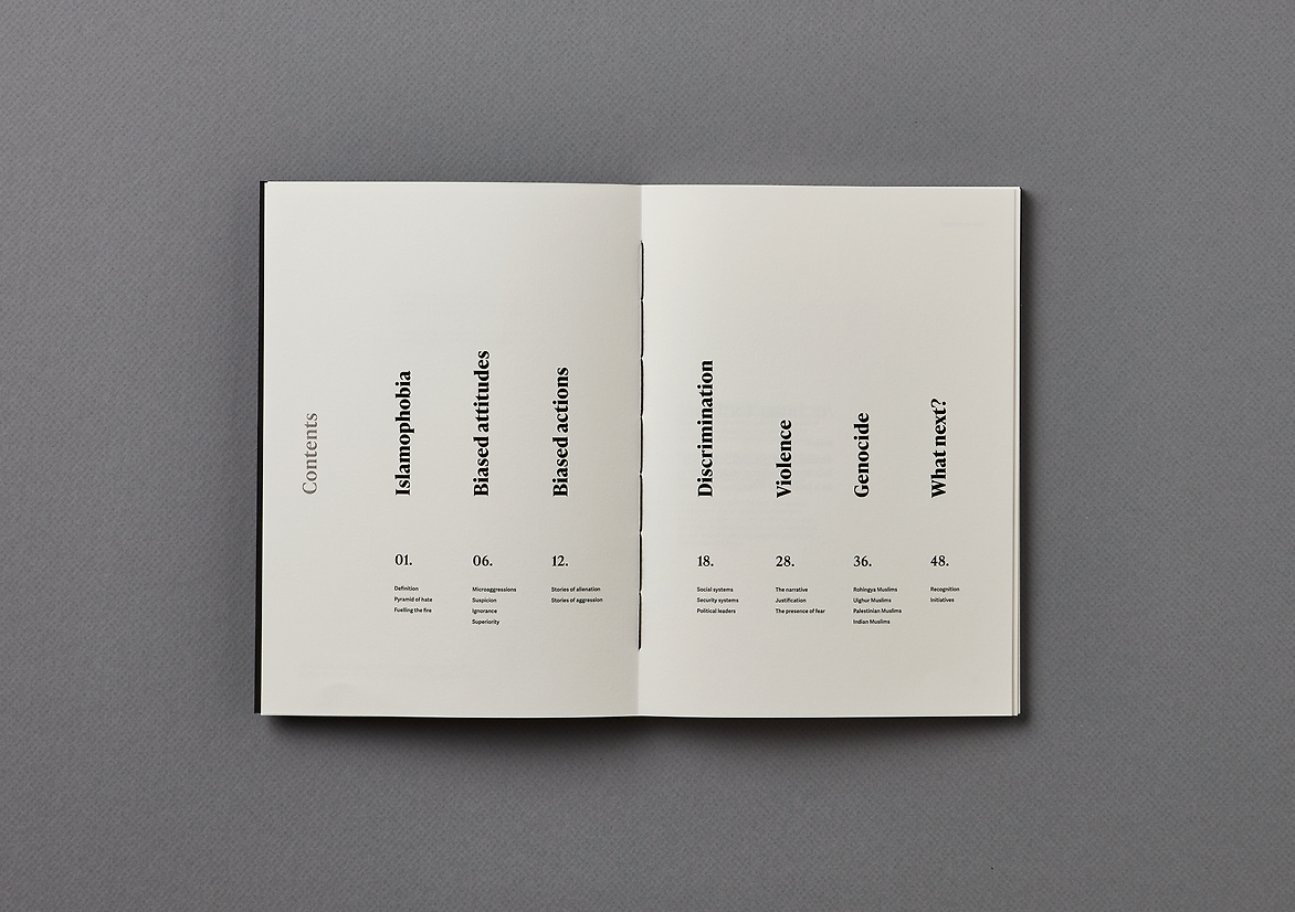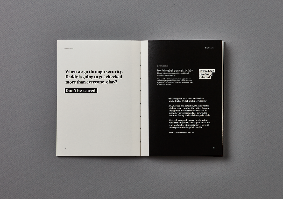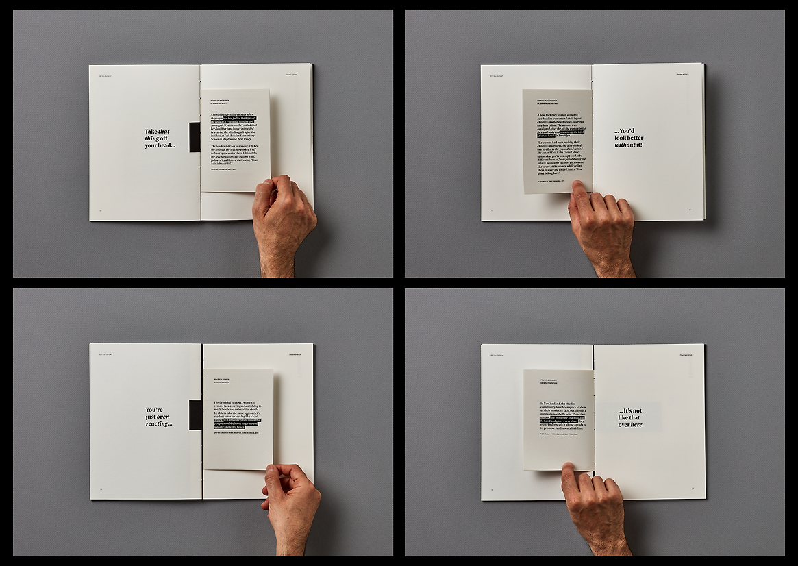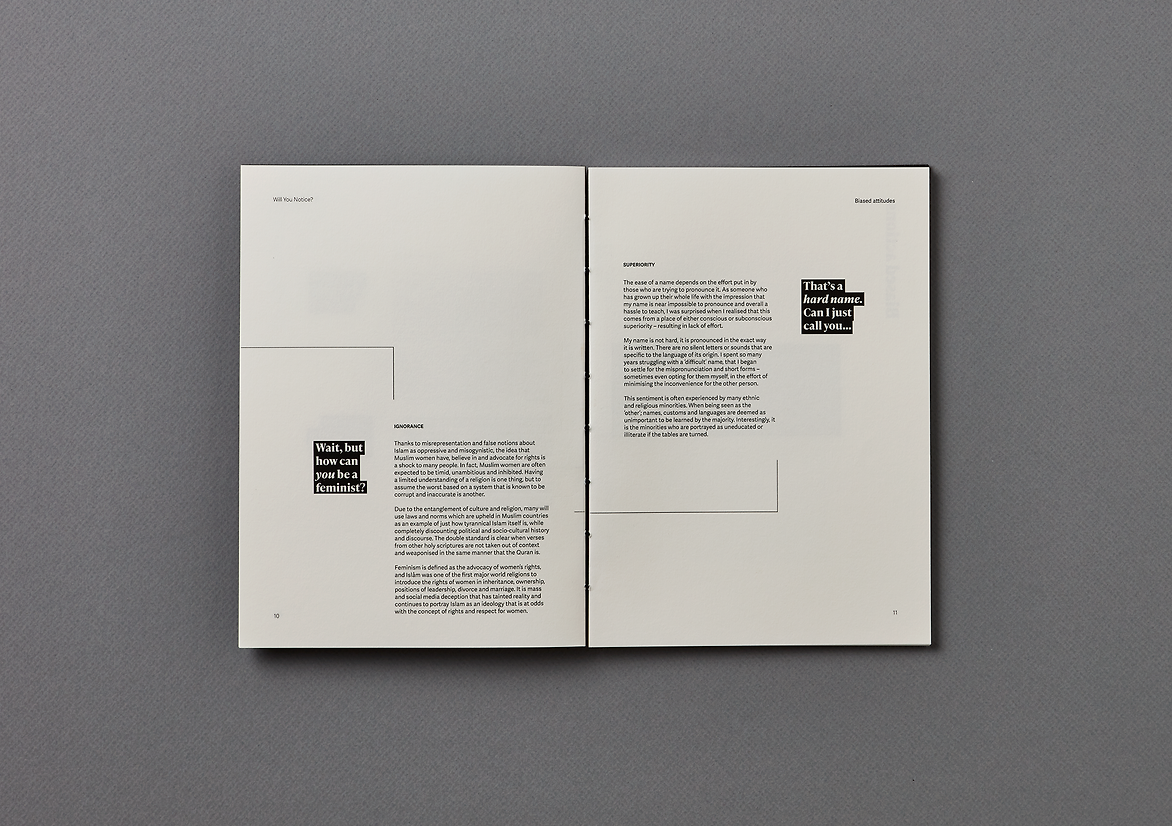 The publication at the centre of this project is a combination of self-authored and compiled information to educate and create awareness amongst readers about the various levels at which Islamophobia is present in society. The publication was printed, collated, screen-printed, debossed, and hand-bound by the designer. The project is presented with a monochromatic palette of black and white. As the two colours (or absence thereof) exist as opposites, strong contrasts and dualities are communicated in the design. The use of black rectangular shapes acting as redactions are used to highlight certain bodies of text throughout the project. This is also represented through the black flaps with bold white text, which reveal hidden meanings and intentions behind the Islamophobic phrases that are presented. Copies are hand-stitched by Coptic binding with an exposed spine. This is intentional as the content within works to also ‘expose’ a social issue which is often dismissed, and also to show that the work contains several layers and components of information. These production methods cause the reader to pause and explore the flaps and inserts of the sewn-in panels.