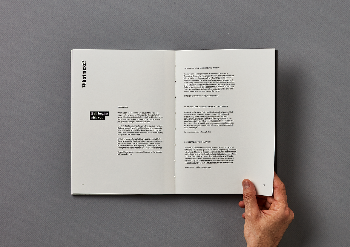 This project uses communication design to impact, encourage and influence social awareness around Islamophobia through printed and digital resources. Design activism is employed to address negative behaviours and attitudes, to create change by catalysing a sense of empathy with victims and heightening responsibility and accountability within viewers.