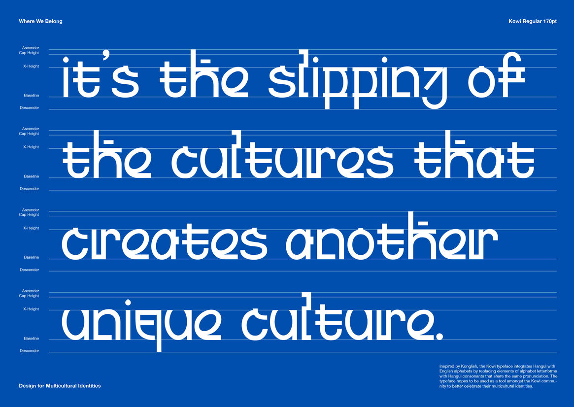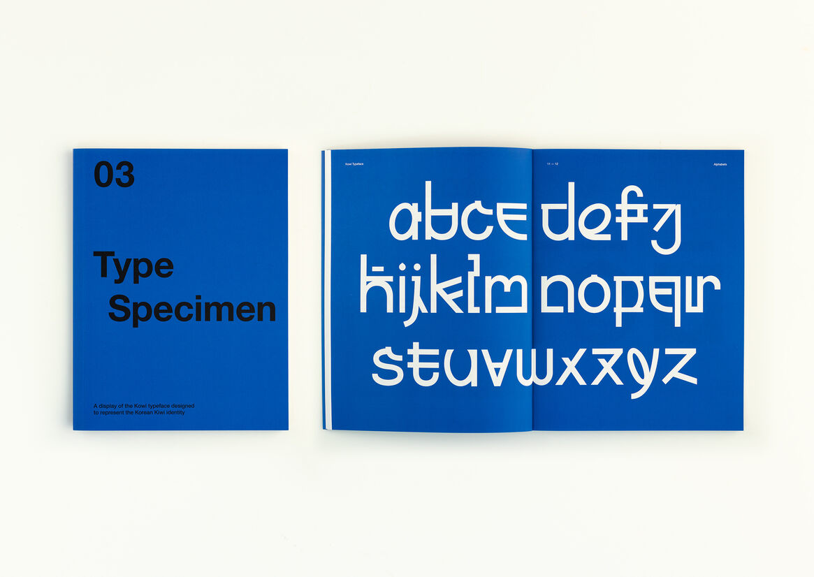 As a part of the project, I have created the Kowi typeface, a multilingual typeface that hopes to help the Korean Kiwi (Kowi) community better celebrate and appreciate their unique identities. The Kowi typeface challenges integrating both Korean and English languages, based on my influences as a tauiwi of Korean descent, to reflect the multilingual characteristic of a multicultural identity. A unique language pattern called Konglish (Korean + English), commonly and comfortably used amongst Kowis, was used as a tool to visualise both English and Korean within a single typeface. The typeface integrates Hangul with English alphabets by replacing elements of alphabet letterforms with Hangul consonants that share the same pronunciation. The Kowi typeface strives to be a celebration and a representation of the Korean Kiwi language and be freely and appropriately utilised by the Kowi community as part of their identity.