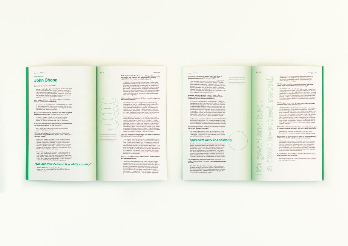 Alongside the research, the project also includes a collection of interviews with young Korean Kiwi adults to amplify their voices as a community of a minor ethnic group and emerge both positive and negative everyday experiences people with multicultural identities may undergo in a melting pot like Auckland. The interviews mainly question their sense of belonging within the Korean Kiwi community and anecdotes about their identity crisis.