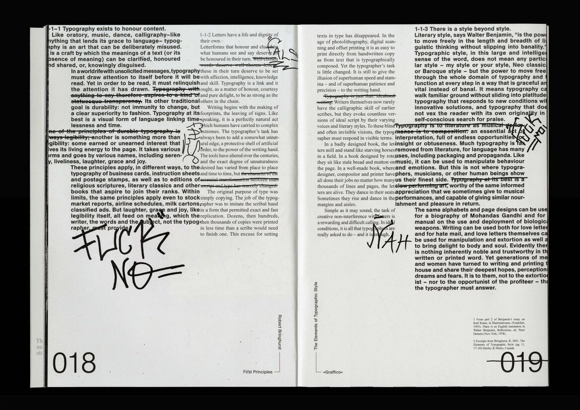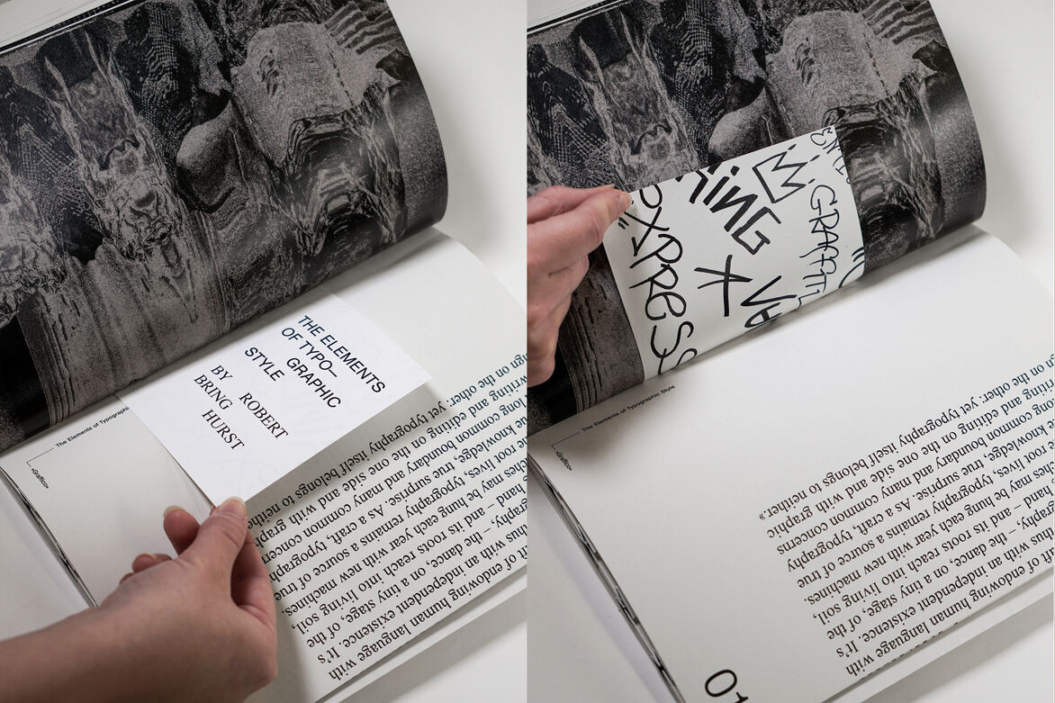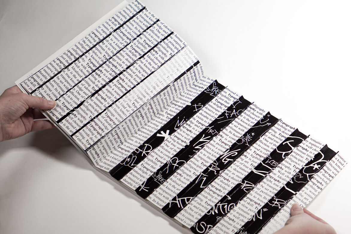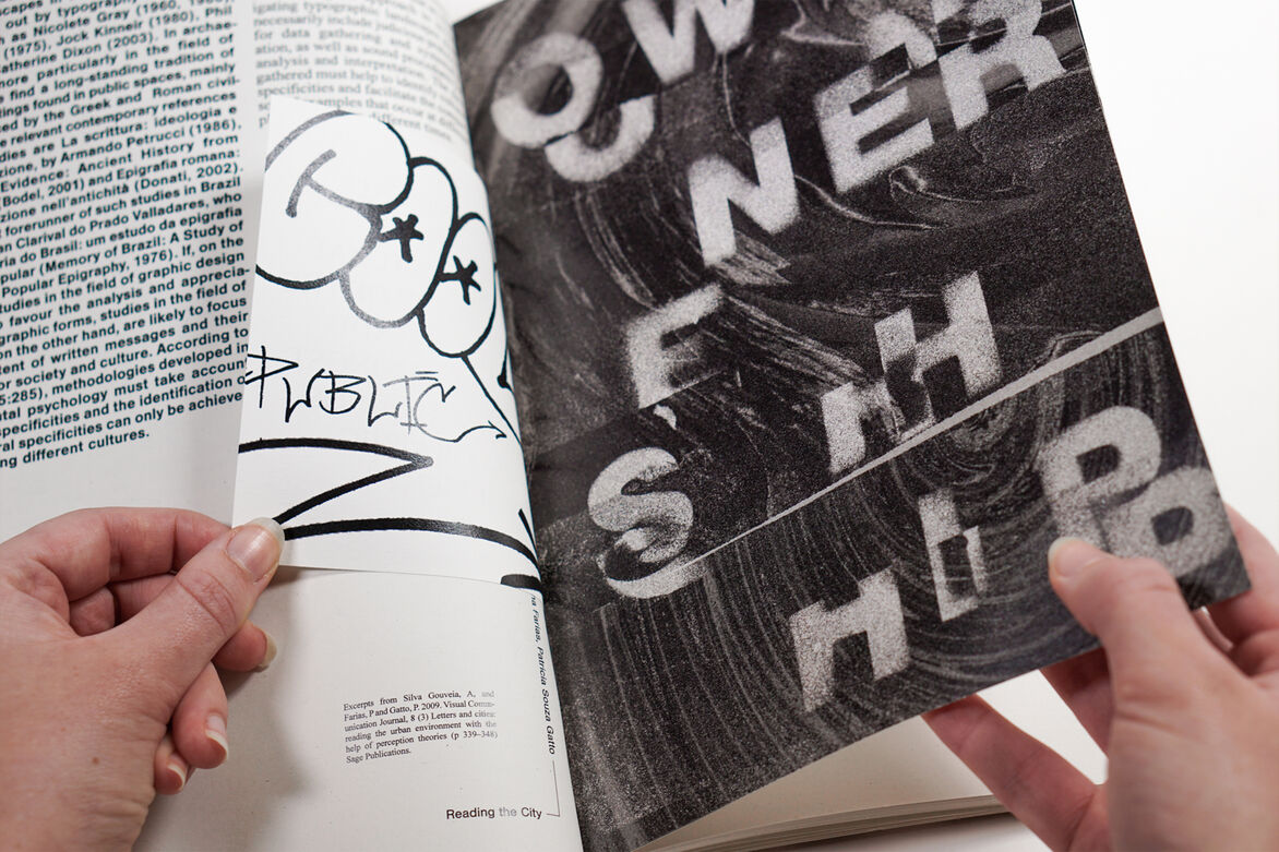 The typographic element I chose to highlight within this publication was graffiti tags and their implicit suggestion of territorial ownership through complex, often hidden, layers of meaning. Notions of vandalism and defiance dominate the publication through typographic detailing and experimental explorations of hand-generated type and image. Specific examples include contrasting traditional serif and contemporary sans serif typefaces, text that appears to disobey conventional page margins and gutters, and concealed elements of vandalism on inserts and fold-outs. These inclusions contravene traditional publishing formats imparting the lawless turbulence of graffiti.