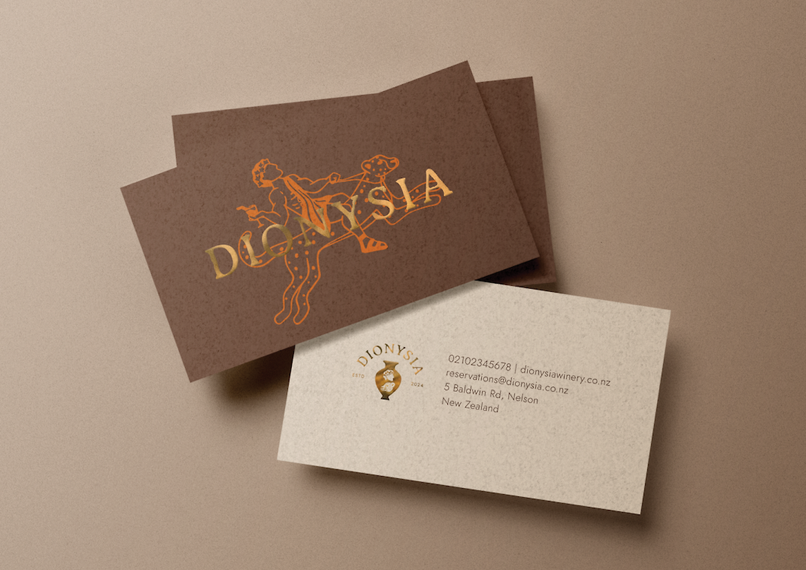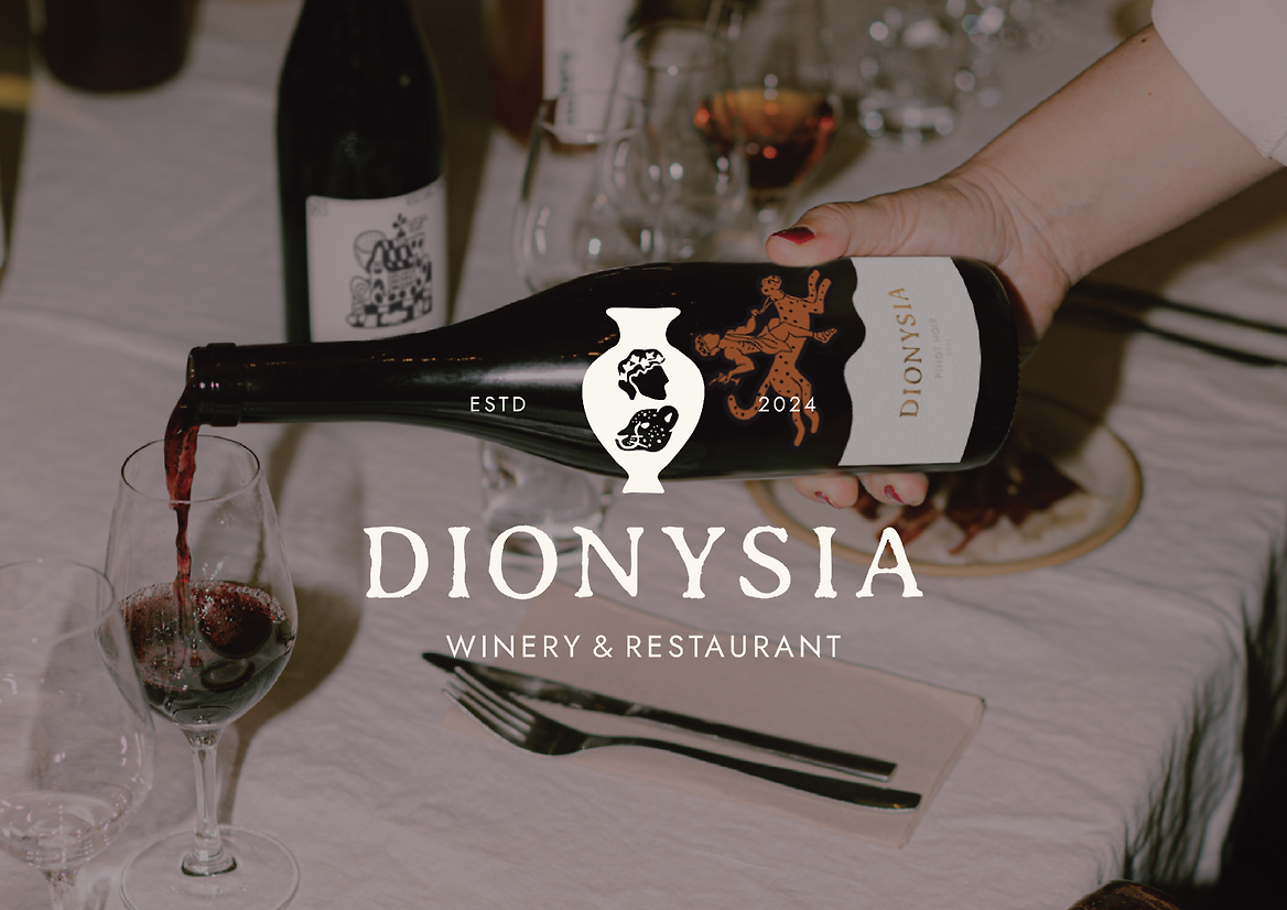 Dionysia brings mythology to life through carefully considered design. The wine label itself draws inspiration from classic Greek art, featuring an illustration of Dionysus riding a leopard. The depictions of Dionysus climbing, leaping, and prancing add a dynamic sense of movement across the bottles, reflecting his role as the wandering god of wine and revelry. The colour palette takes inspiration from Ancient Greek terracotta vases, while the typography is reminiscent of Ancient Greek inscriptions, grounding the design in historical authenticity while maintaining a clean, contemporary feel.