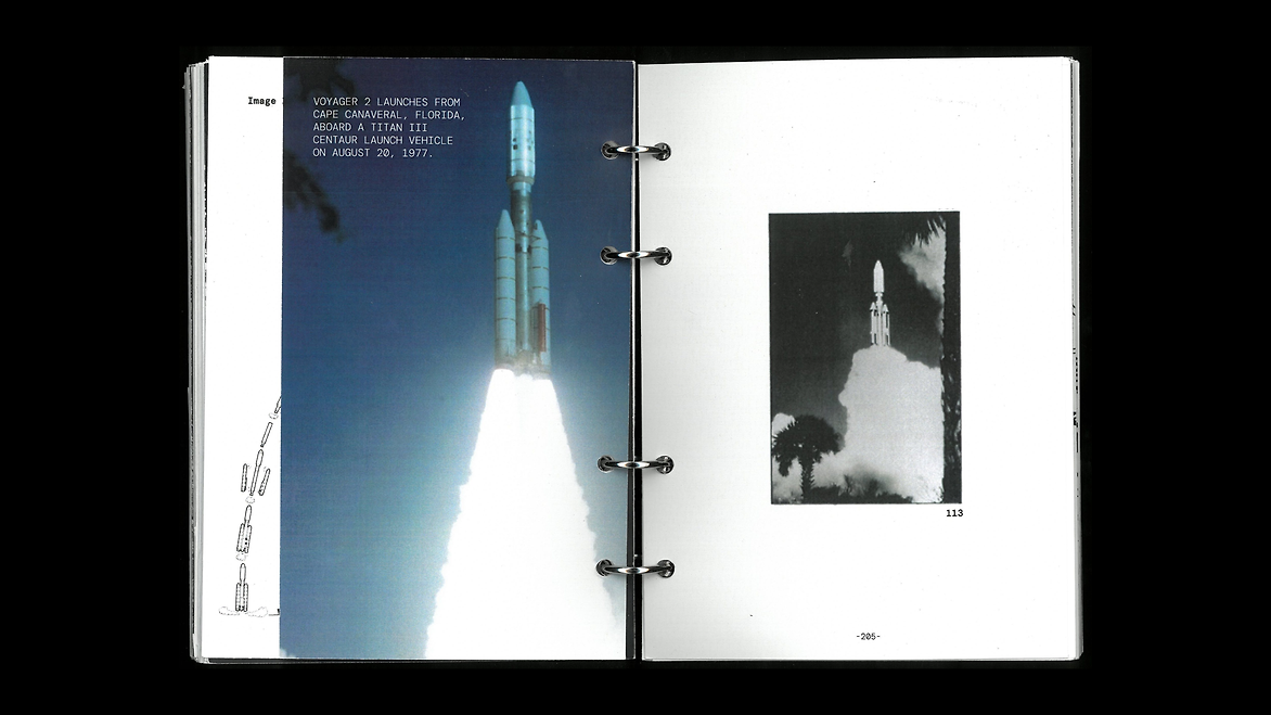 A key feature of the design is its ring binding, referencing NASA’s utilitarian documentation style while allowing the publication to evolve. Sections can be reordered or added over time, making space for future reflections, annotations, or newly uncovered materials. Low-resolution images from the Golden Records are retained in their original form to preserve authenticity, while supporting imagery is styled to look scanned and archival, reinforcing the tactile, documentary feel.