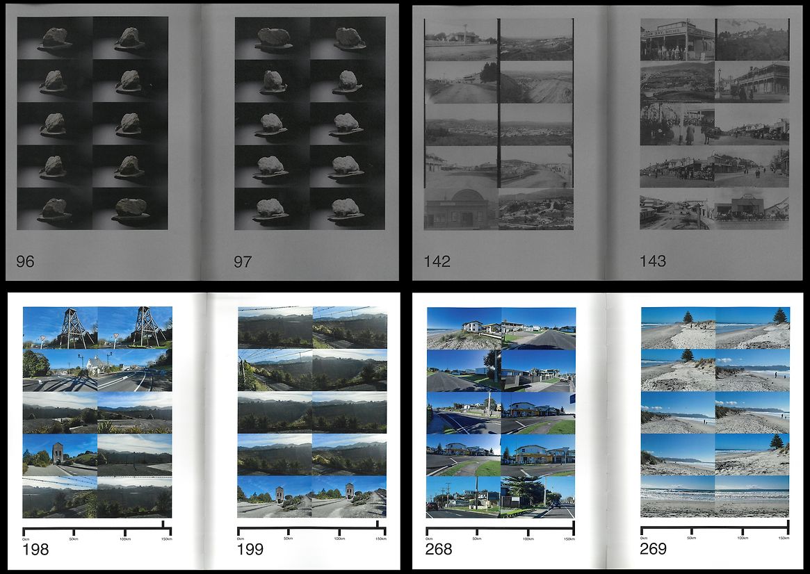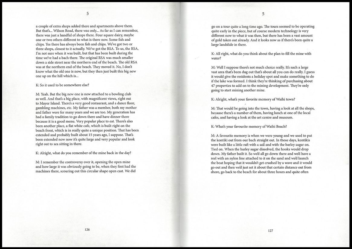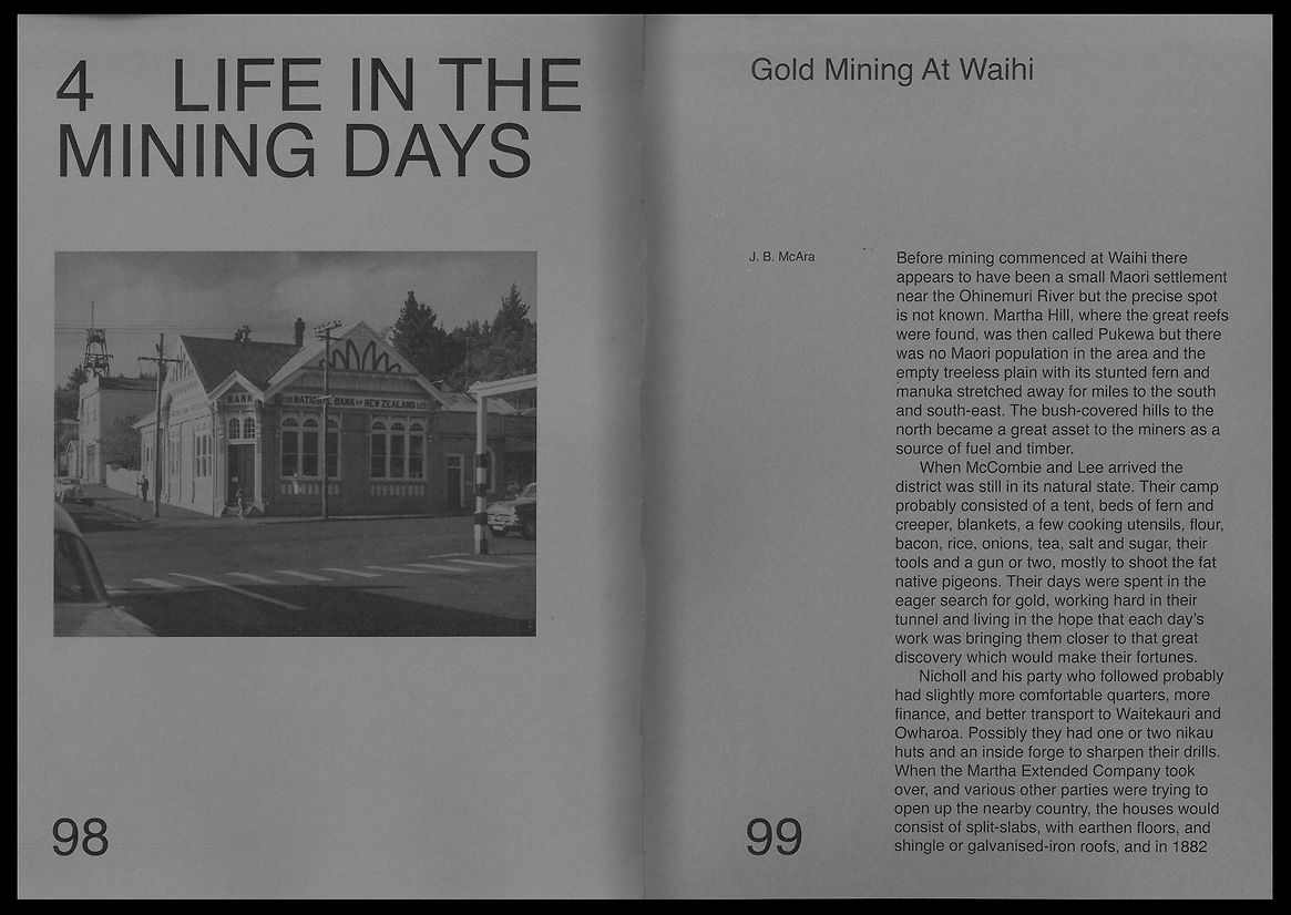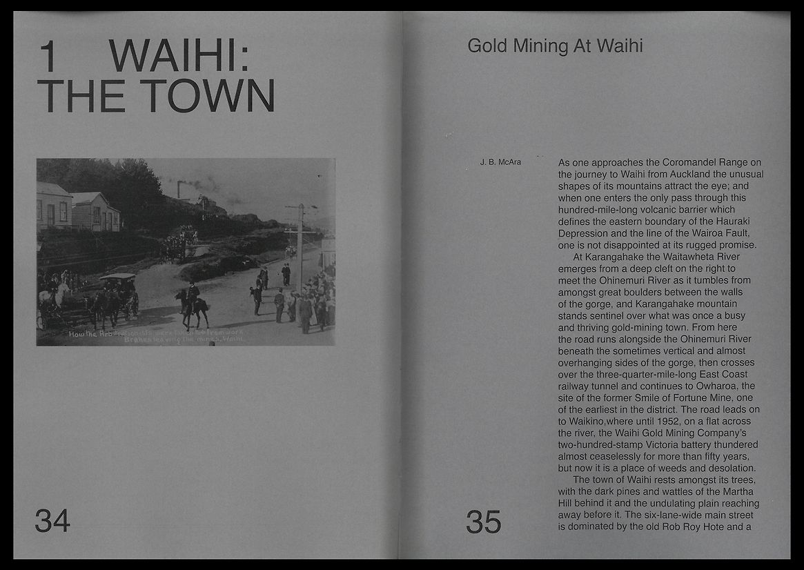 More content: The history of gold mining in the area was of course always going to be a focus, and hence the 3-D cut hole indicating the topographic profile of the Martha Mine that dominates Waihi township; I interviewed my mum for the book, because she has been going down to Waihi and the beach for a long time and has seen them change dramatically; the image sequence pages of Seddon Street shops are a somewhat tongue-in-cheek reference to Robert Venturi, Denise Scott Brown and Steven Izenour's book "Learning from Las Vegas".