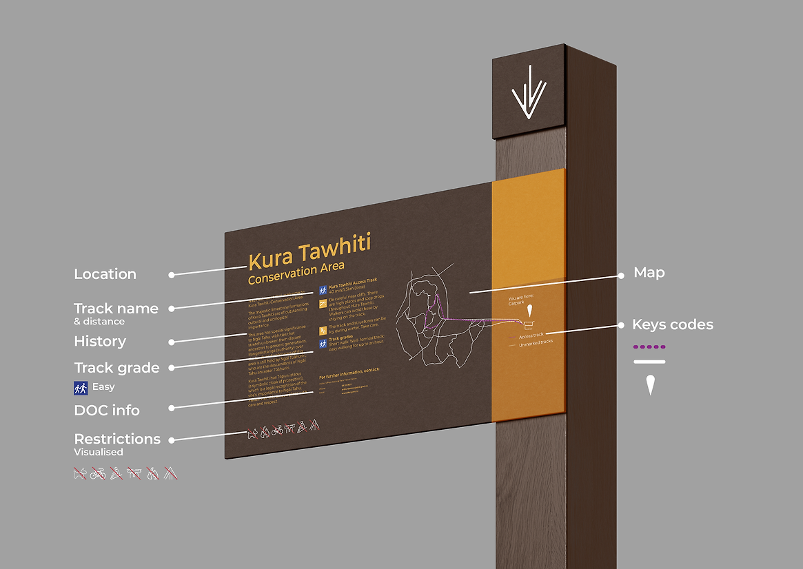 The environmental graphics were created for the design to directly reflect the landscape it’s in. People can come and enjoy the beauty of Kura Tawhiti while correctly respecting its Tōpuni status and rich history. Our sacred landscapes deserve to be respected and enjoyed by many.