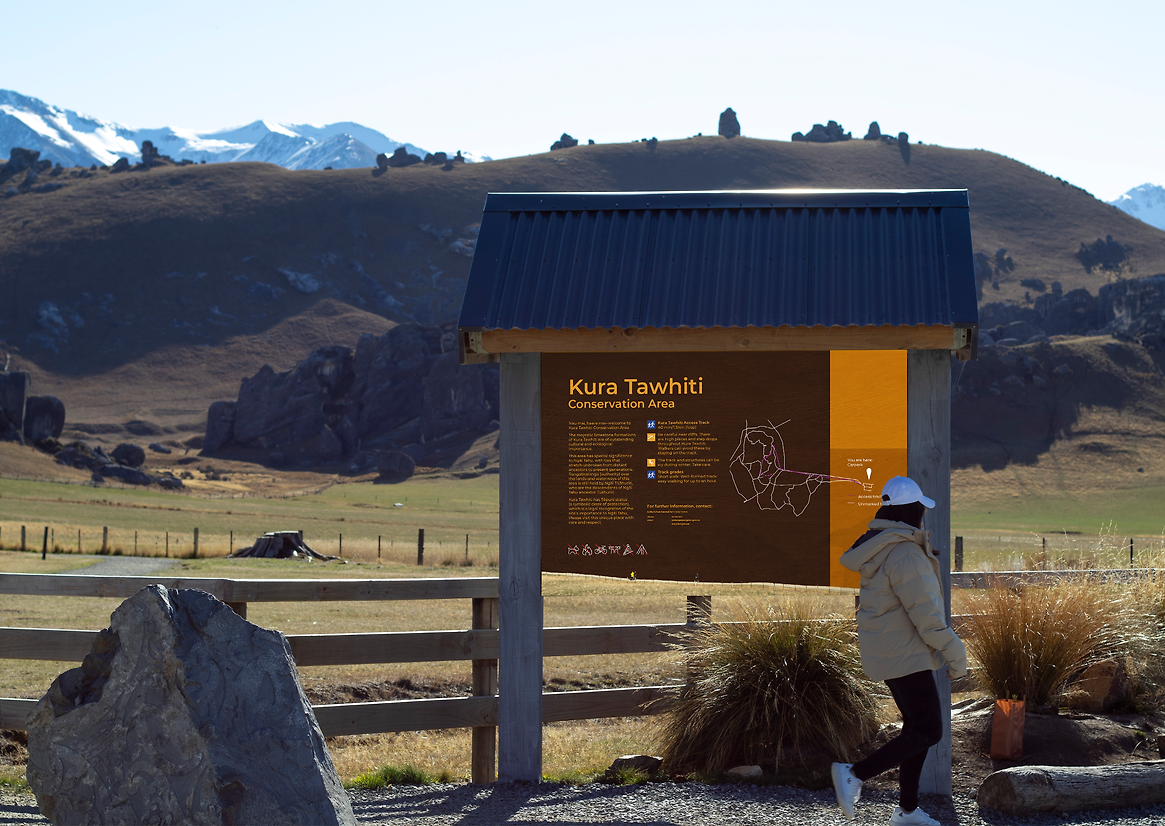 Up Close takes information from the landscape to create a design identity that reflects its surroundings. You can see that the colour pallet is reflective of plants sacred to Kura Tawhiti, such as the Castle Hill Butter Cup (Ranunculus paucifolius). Throughout the design identity, you can see elements inspired by the carvings at the entrance to Kura Tawhiti; these are carried through in the chosen typeface, brand identity, and iconography for Kura Tawhiti. Every part of the design draws you back to Kura Tawhiti, to its beautiful landscape and limestone formations. The environmental graphics were created for the design to directly reflect the landscape it’s in. People can come and enjoy the beauty of Kura Tawhiti while correctly respecting its Tōpuni status and rich history. Our sacred landscapes deserve to be respected and enjoyed by many.