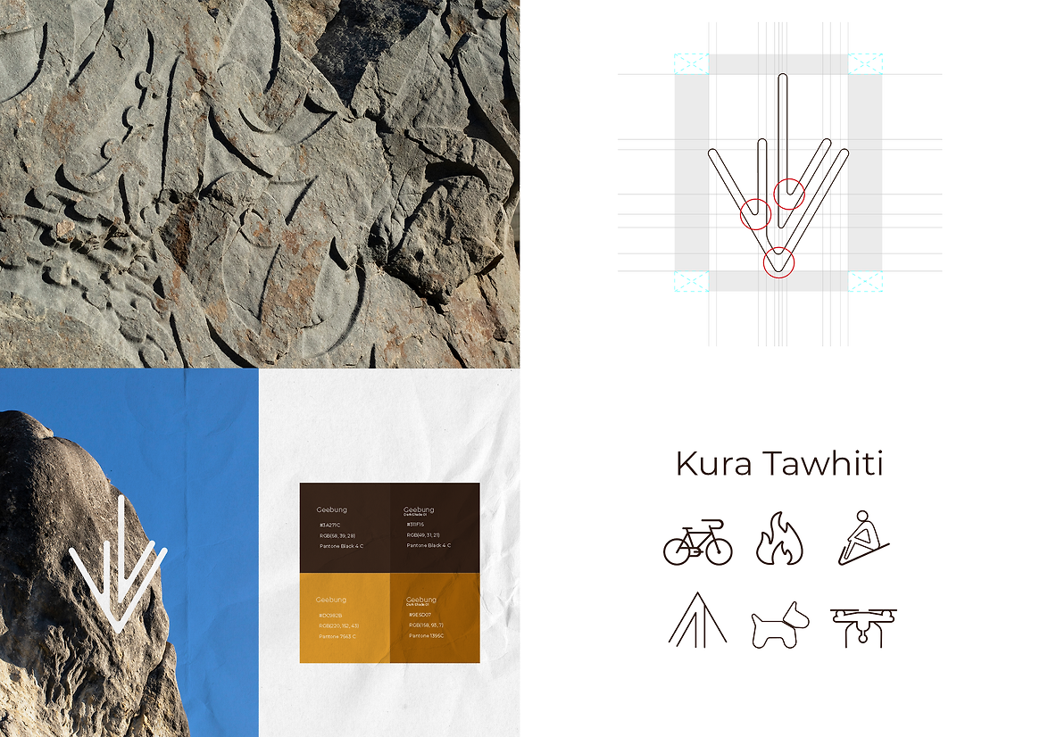 Up Close takes information from the landscape to create a design identity that reflects its surroundings. You can see that the colour pallet is reflective of plants sacred to Kura Tawhiti, such as the Castle Hill Butter Cup (Ranunculus paucifolius). Throughout the design identity, you can see elements inspired by the carvings at the entrance to Kura Tawhiti; these are carried through in the chosen typeface, brand identity, and iconography for Kura Tawhiti. Every part of the design draws you back to Kura Tawhiti, to its beautiful landscape and limestone formations.