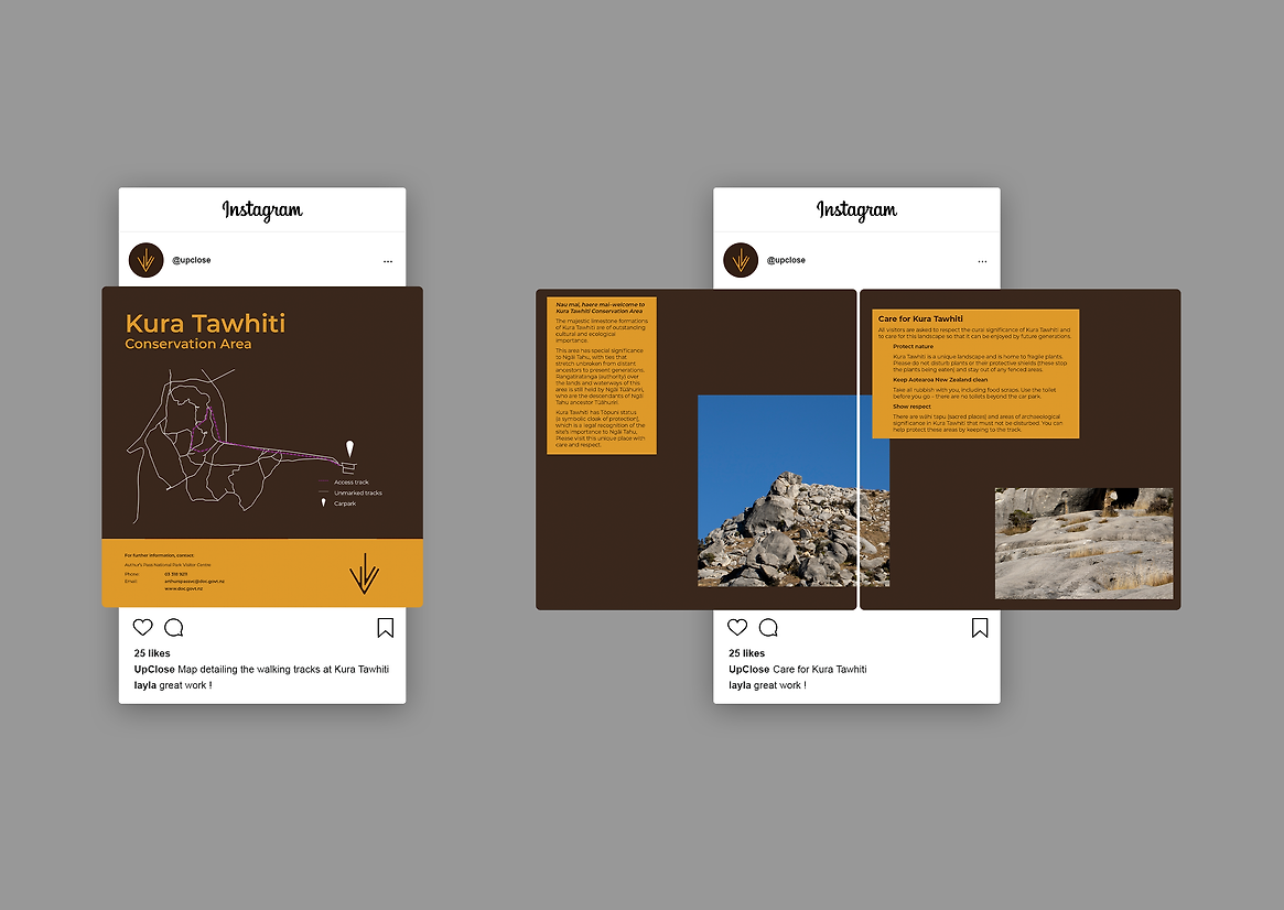 Up Close has the potential to influence the way the public engages with our land and to offer education around the dos and don’ts of walking and hiking tracks. With proper guidance and involvement from local Iwi and the Department of Conservation, Up Close would have the ability to thrive. Offering clear and educational environmental graphics is incredibly important, especially when tracks cross over tapū. This directly affects the environmental preservation and conservation of our land.