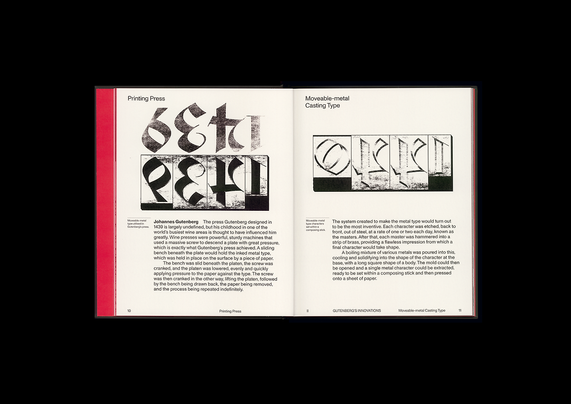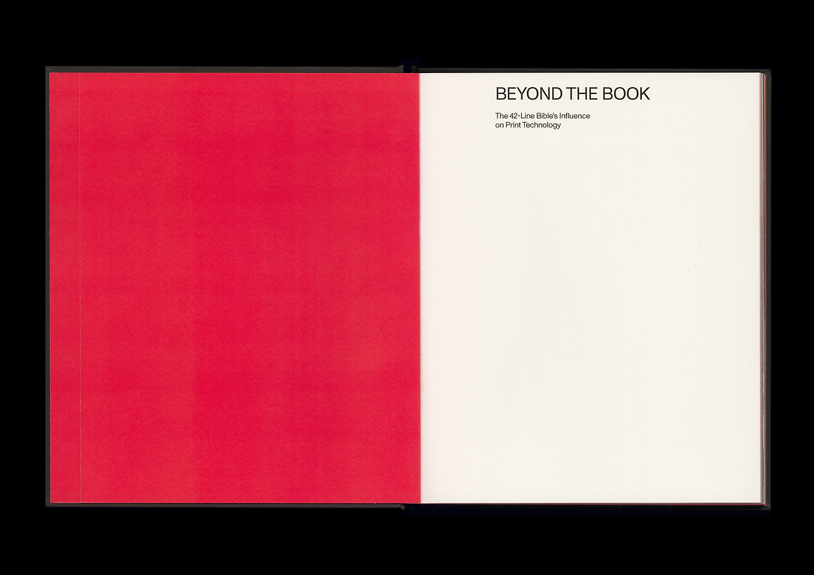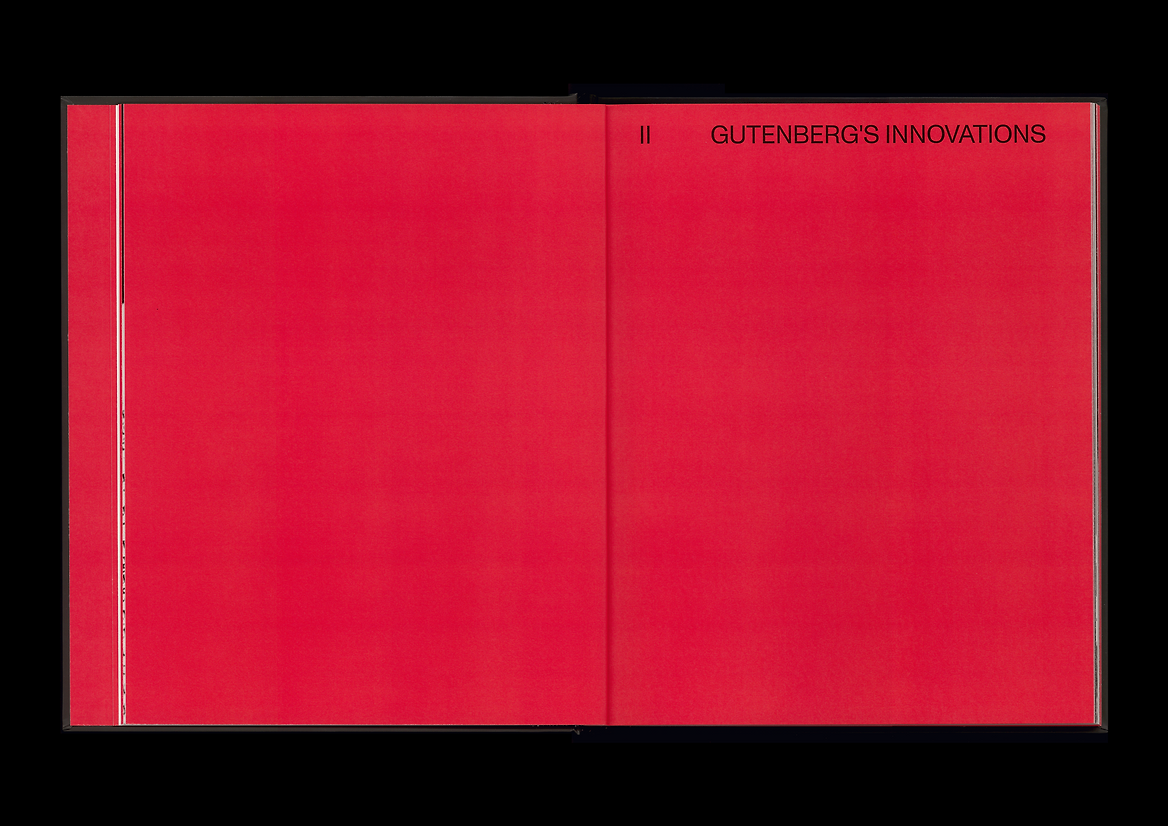 The publication’s large format is a reference to the sheer size of the 42-Line Bibles, which were printed on royal, 508x630mm. The setting of margins and gutters, express the Bible’s optimisation of negative space. The colours black and cinnabar red reference Gutenberg's Lamp-black ink innovation and decorative cinnabar red calligraphed aspects seen in the 42-Line Bible.