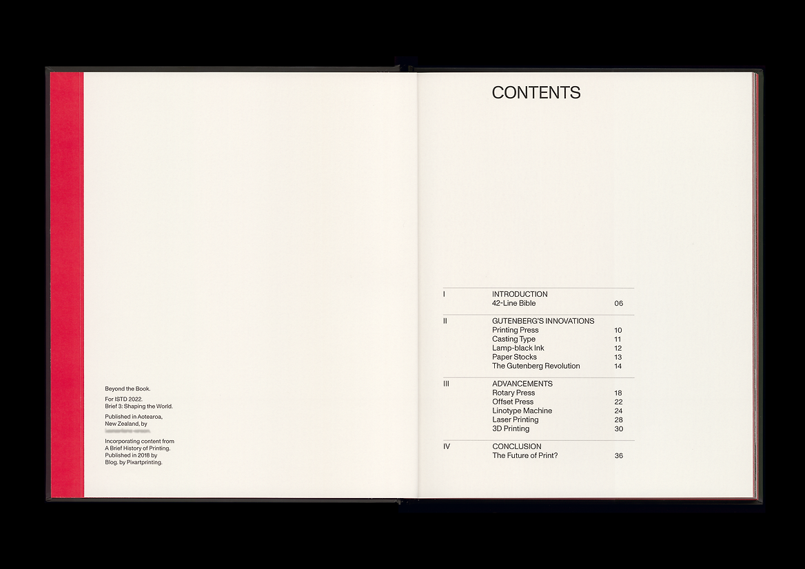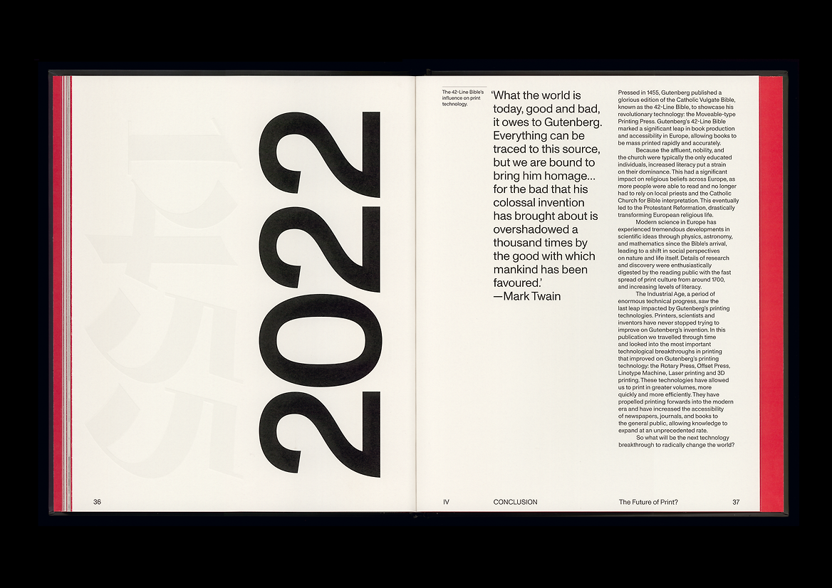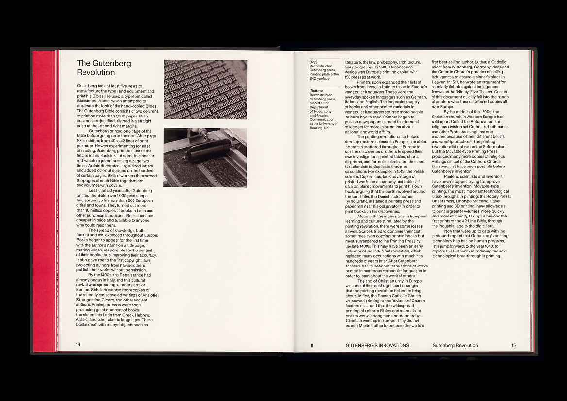 The narrative is split into three sections by way of roman numerals, referencing the numeral system that remained the usual way of writing numbers throughout Europe well into the 1500s. Section I, the Introduction, summarises the 42-Line Bible and its impact on human progress. Section II outlines Gutenberg's technologies, from ink creations, paper sampling, to his Moveable-type Printing Press. Section III, the Advancements, presents the technological breakthroughs devised by printers, scientists and inventors over time. I used a contemporary Swiss sans-serif typeface for a modern portrayal of the original publication that used solely blackletter of one weight. Indents have been used as an alternative to paragraph spacing to reference traditional writing techniques. I have displayed the dates that the print technology was invented in using contemporary interpretations of typefaces associated with these eras to create a timeline of print history. Along with typefaces that reflect the era of the technology, I drew on research into how each works in order to resemble each technology through manipulating or adding features to the dates.