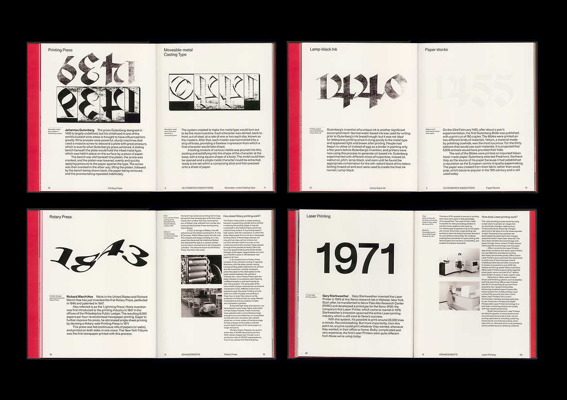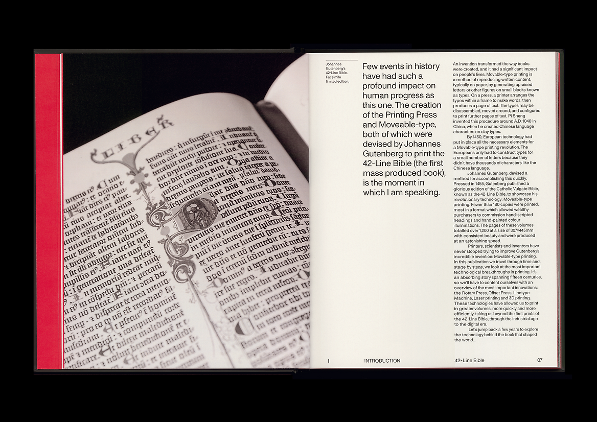 This publication is a travel through time and stage by stage, it looks at the most important technological breakthroughs in printing: Gutenberg's Innovations; the Rotary Press; Offset Press; Linotype Machine; Laser printing; and 3D printing. The aim of the publication is to create an engaging timeline of print history, allowing print lovers to understand how each technology works, and most importantly, where it came from: paying homage to Johannes Gutenberg's 42-Line Bible.