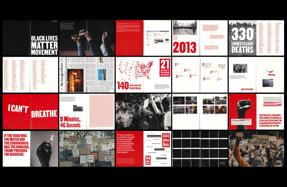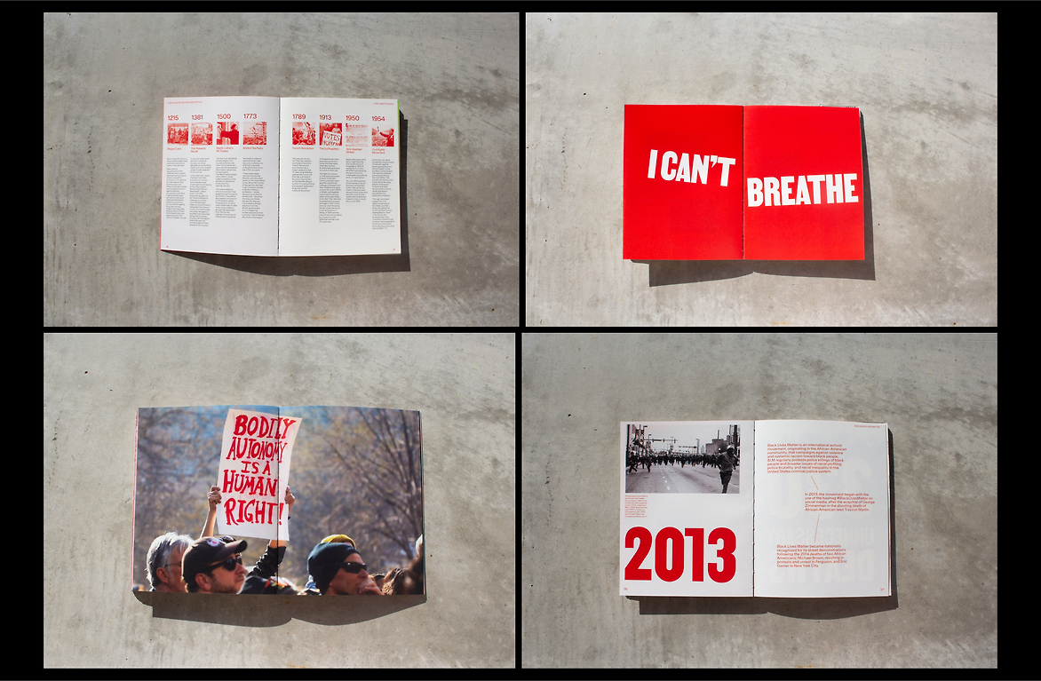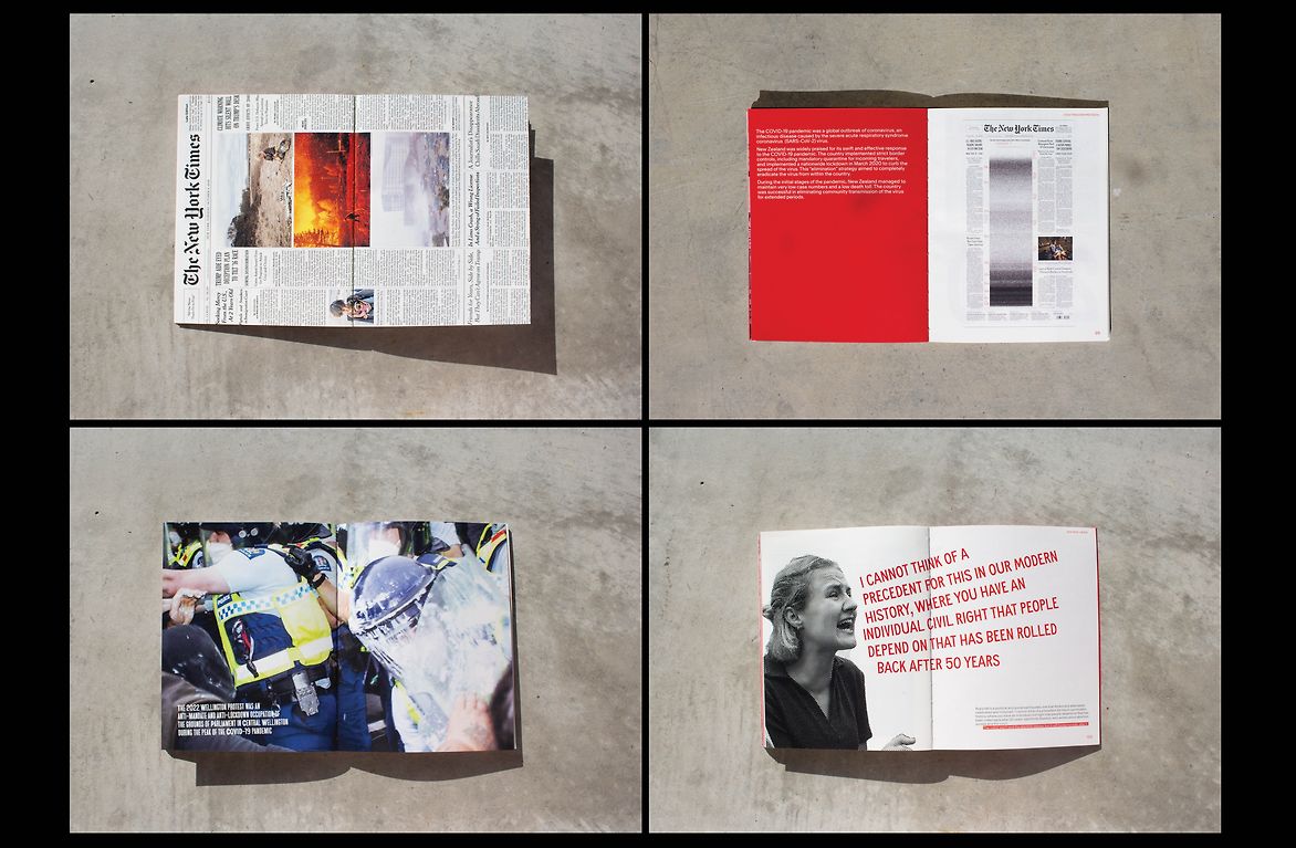 The project aims to delve into the surge of modern activism over the past five years, recognizing its significance amidst societal changes and technological advancements. Rooted in the understanding that protests are inherent to democracy, the project seeks to document and analyse major protests like the 2019 Climate Strikes, the 2020 Black Lives Matter Protest, the 2022 New Zealand Parliament Occupation, and the 2022 Roe v Wade protests. This exploration is driven by a personal connection to activism and a desire to contribute to the ongoing dialogue for change. The strategy revolves around creating an informative and visually engaging book that serves as a comprehensive resource on modern protests. Divided into five sections, including a historical overview of protest movements, the book follows a chronological narrative to provide context and insight into each protest. Each section meticulously details the events, key figures, statistics, and media influences surrounding the chosen protests, aiming to inspire and inform readers about the power of collective action. In terms of design, the project adopts a bold and innovative approach, drawing inspiration from both traditional protest literature and modernist design principles. Utilizing red as a dominant color to symbolize passion and activism, the design incorporates distinct section openers and infographics to enhance readability and flow. Typeface selection plays a crucial role, with each section featuring a unique display font inspired by the respective protest or cause, such as the 'climate crisis' font developed by Helsingin Sanomat and the 'Martin' typeface honoring Martin Luther King Jr.'s legacy. The crafting process further emphasizes the grassroots nature of activism, with the book meticulously hand-bound using red thread to symbolize solidarity and connection among protestors. The choice of materials, including natural paper and red cardstock, reflects a commitment to sustainability and aesthetic coherence. Overall, the project embodies a thoughtful blend of storytelling, design innovation, and craftsmanship, aiming to spark conversation and action around pressing social issues.