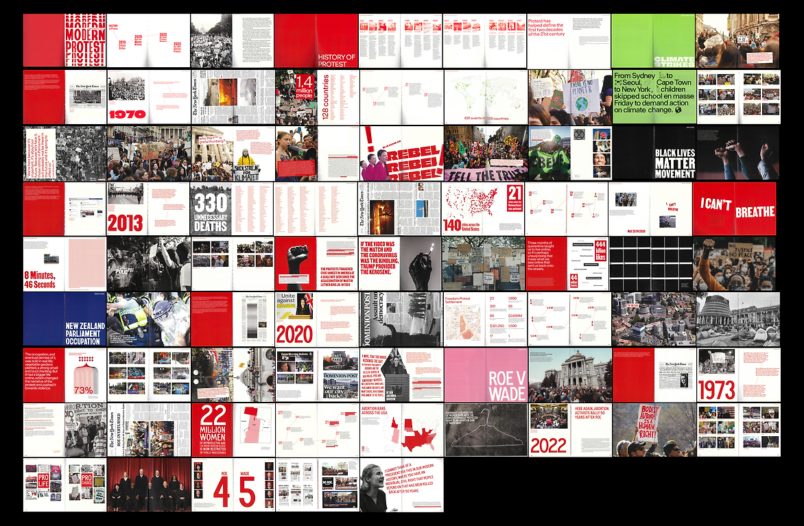 In terms of design, the project adopts a bold and innovative approach, drawing inspiration from both traditional protest literature and modernist design principles. Utilizing red as a dominant color to symbolize passion and activism, the design incorporates distinct section openers and infographics to enhance readability and flow. Typeface selection plays a crucial role, with each section featuring a unique display font inspired by the respective protest or cause, such as the 'climate crisis' font developed by Helsingin Sanomat and the 'Martin' typeface honoring Martin Luther King Jr.'s legacy.