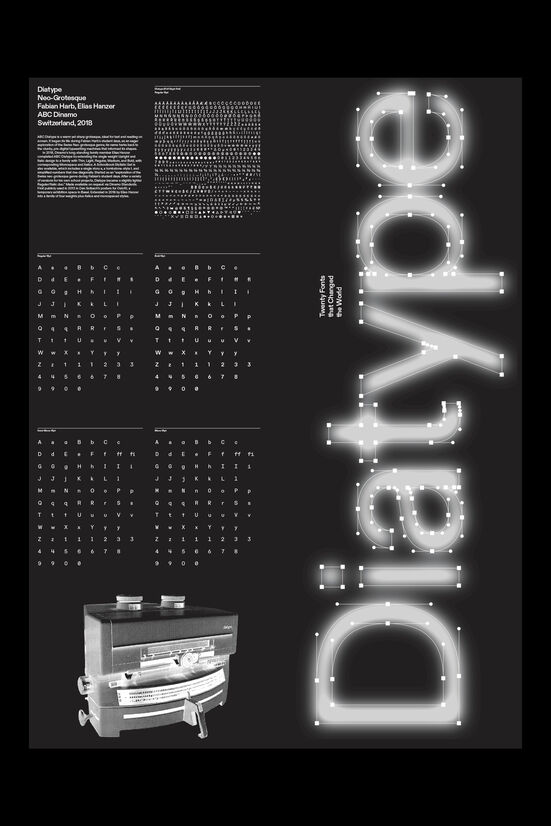 For the final contemporary font I chose to use ‘Diatype’ (2020) by Swiss font foundry ABC Dinamo. The typeface traces the mediums of typographic production that came before digitalisation of fonts. ‘Designing Programmes’ (1964) by Karl Gerstner used mid-century ‘Diatype’ phototypesetting machine to influence the detailed proportions of Berthold’s Akzidenz Grotesk (1898) and adapt it into modern technology. Designer Fabian Harb, as part of a University project, began to adapt Gerstner’s proportional typographic experiments into a digital revival. Diatype has a warm yet contemporary form compared to many ‘Neo-Grotesque’ fonts. The specimen for Diatype works as a poster and a dust jacket for the book, it’s lamination lending towards ideas light and reflection. Used throughout the book, graphic and layout elements depict the historical and contemporary adaptation of classic and modern modes of typographic production such as moveable type, phototypesetting and digital typography. Diatype’s extended glyph set includes Open Type Features which allows for alternative character sets. It is suited for a contemporary context because of its versatility across a huge family that is dynamic in style and utility. Dinamo offers digital tools for font production to allow designers to explore the full interpolation of different style axis that can contrast the form from italicised, thin too bold and more recently proportional to mono. "
