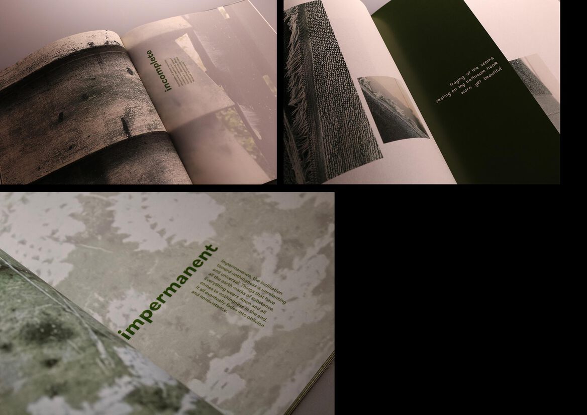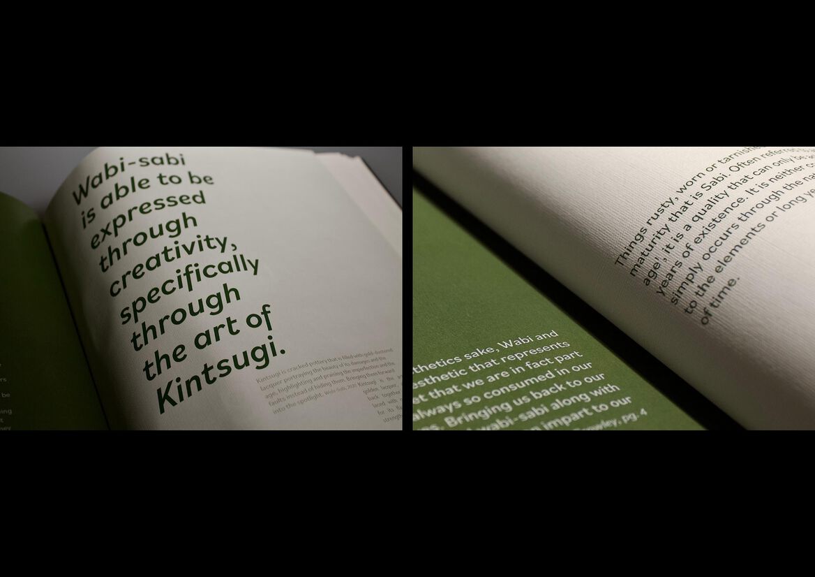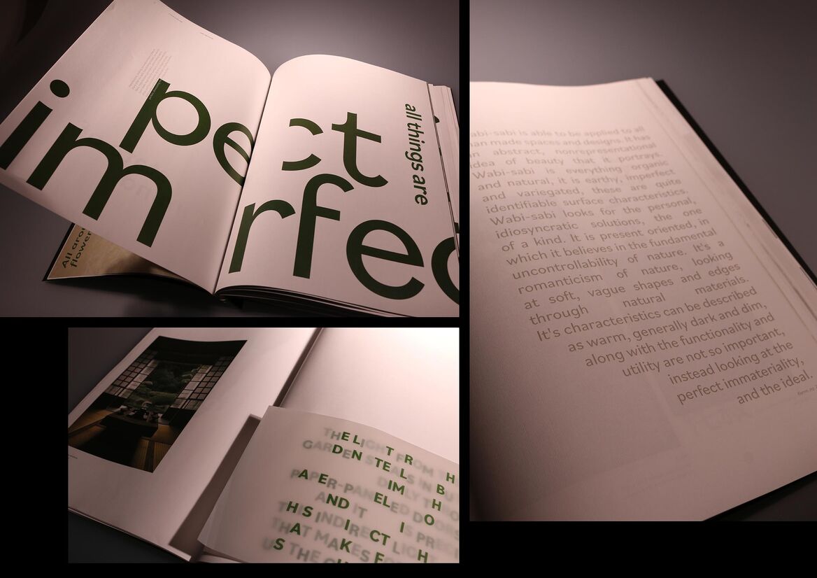 Three of the main wabi-sabi characteristics that I have showcased throughout are irregular, intimate and unpretentious. Each page is different from the last so the reader doesn’t know what to expect. Typographically the content fits with the concept of wabi-sabi in terms of there being justified text, rotated text and different paragraph alignments. The paper selection has a natural, organic feel. Each book is Japanese stab noble bound, personally punched and hand-stitched. A physical publication allows for the books to age and weather over time bringing the appreciation of materials that can evolve and adapt.