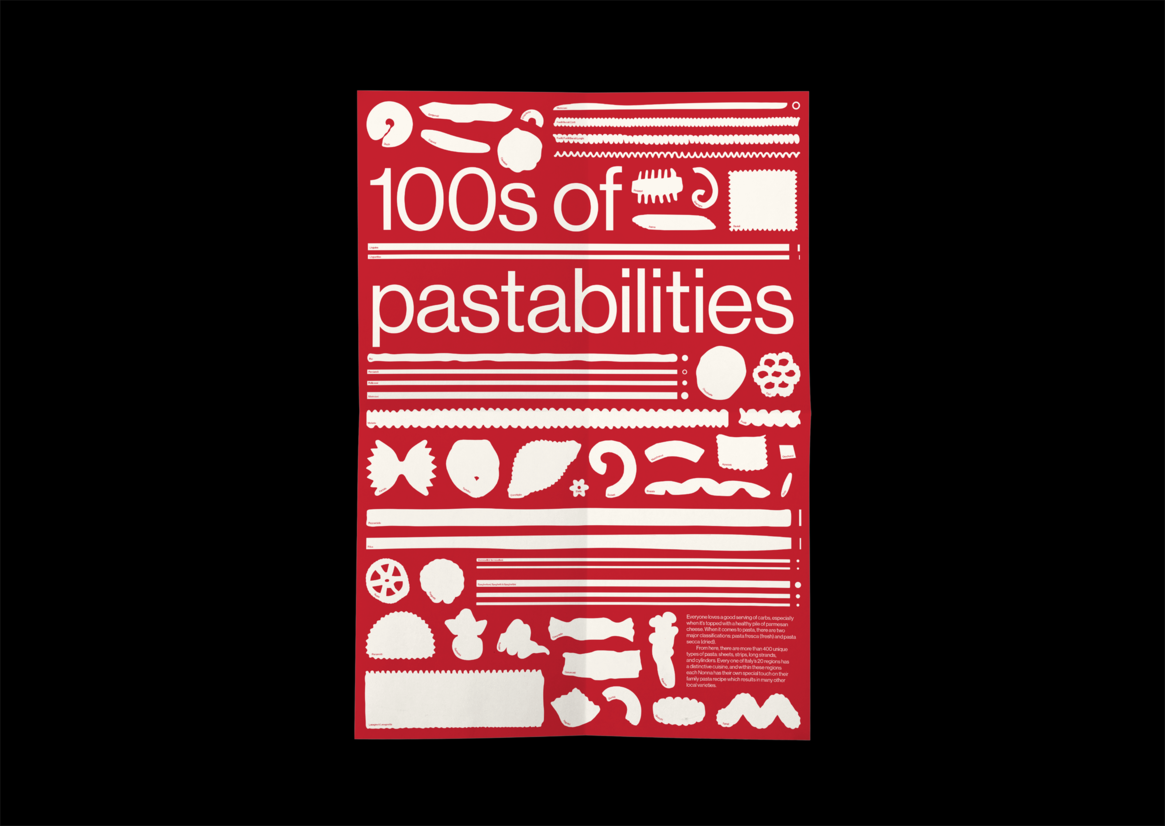 ‘Hundreds of Pastabilities’ is a response to the ISTD Putting Things In Order brief that asked participants to organise, sort or classify a topic. Pasta can be categorised by shape; cut; ingredient; dish; which region it came from; the cheese; sauce; vegetable and herb combinations; which wines pair best with each type of dish; and finally; how to cook; serve; and even which order to eat it within a course! The possibilities are seemingly endless. To visualise this vast range of information, I used Suisse Int’l for my body copy as it is a clean, legible neo-grotesque sans serif. As I progressed with the project, I introduced Suisse Works – the counterpart serif to Suisse Int’l. Set in lowercase italics, Suisse Works added sophistication and a traditional feel to the book. The text is set in a ‘Pomodoro-like’ red which references the San Marzano tomato that is prominent within Italian cuisine, especially in sughi rossi (red pasta sauces). The off-white paper stock is a subtle nod towards the sandy colour of pasta itself. I have used a range of images that are in a red and off-white duotone to be consistent with the rest of the visual system. Anyone who loves pasta can enjoy this poster and book combination as it is sophisticated and light-hearted, but simple, and fun!
