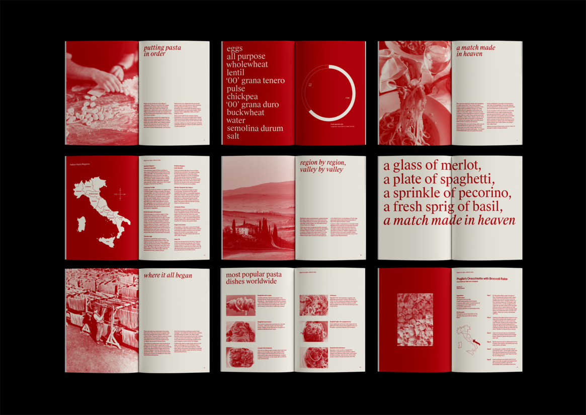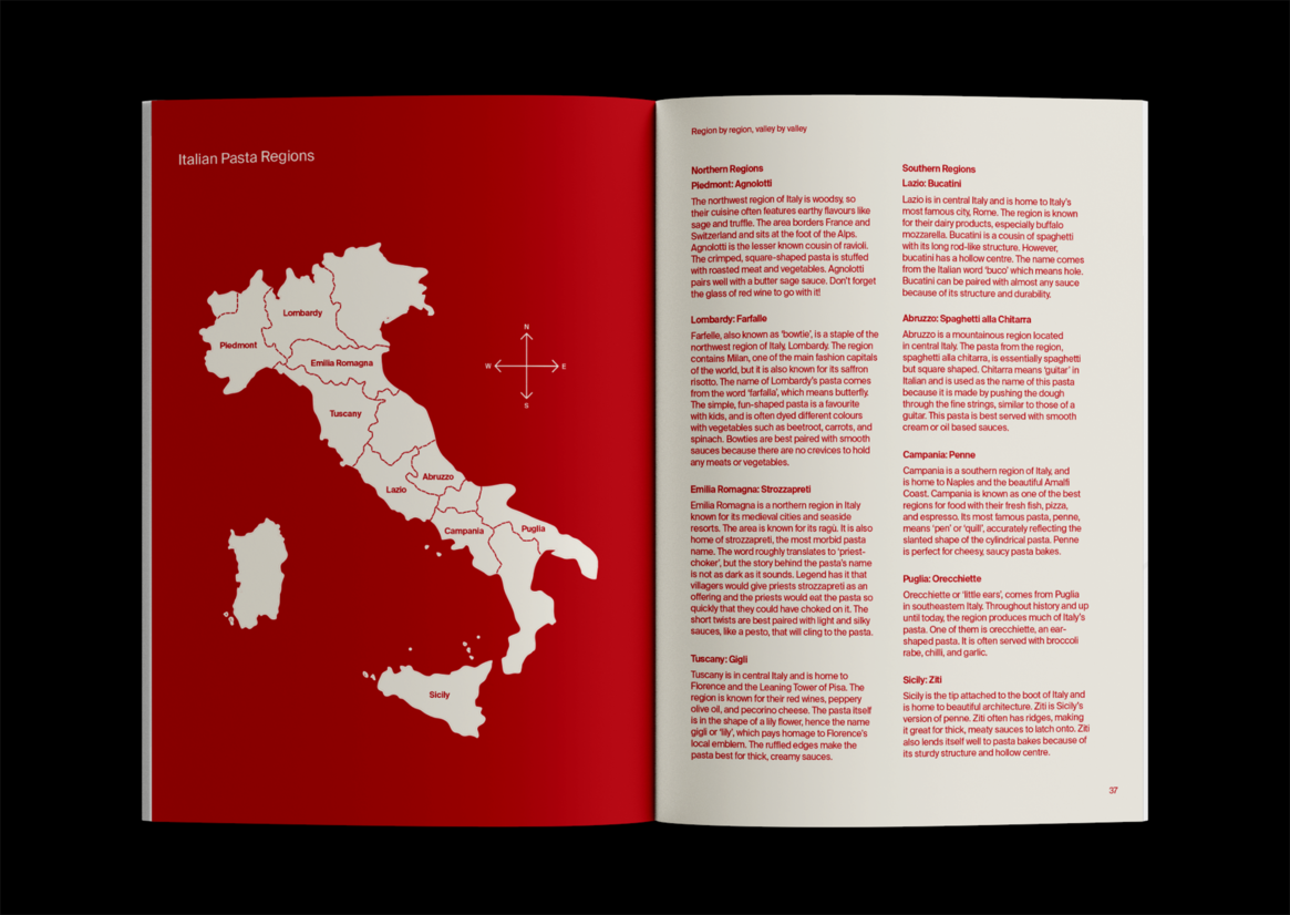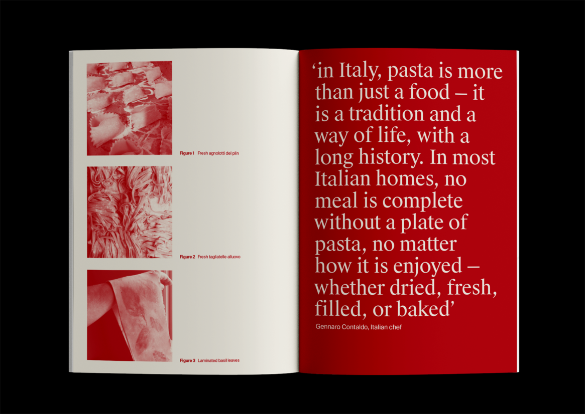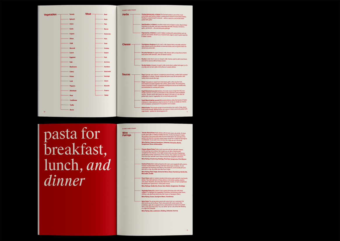 To visualise this vast range of information, I used Suisse Int’l for my body copy as it is a clean, legible neo-grotesque sans serif. As I progressed with the project, I introduced Suisse Works – the counterpart serif to Suisse Int’l. Set in lowercase italics, Suisse Works added sophistication and a traditional feel to the book. The text is set in a ‘Pomodoro-like’ red which references the San Marzano tomato that is prominent within Italian cuisine, especially in sughi rossi (red pasta sauces). The off-white paper stock is a subtle nod towards the sandy colour of pasta itself. I have used a range of images that are in a red and off-white duotone to be consistent with the rest of the visual system. Anyone who loves pasta can enjoy this poster and book combination as it is sophisticated and light-hearted, but simple, and fun!