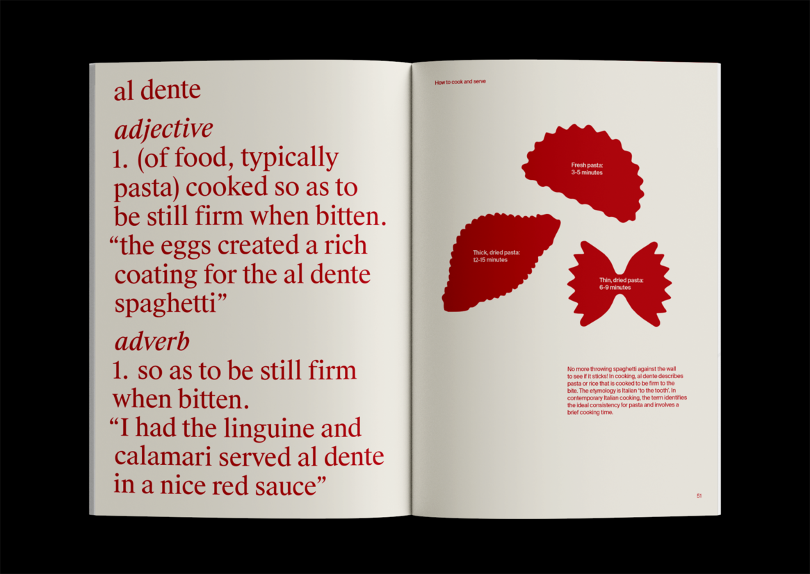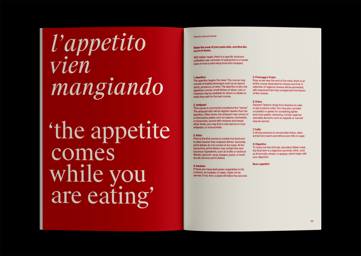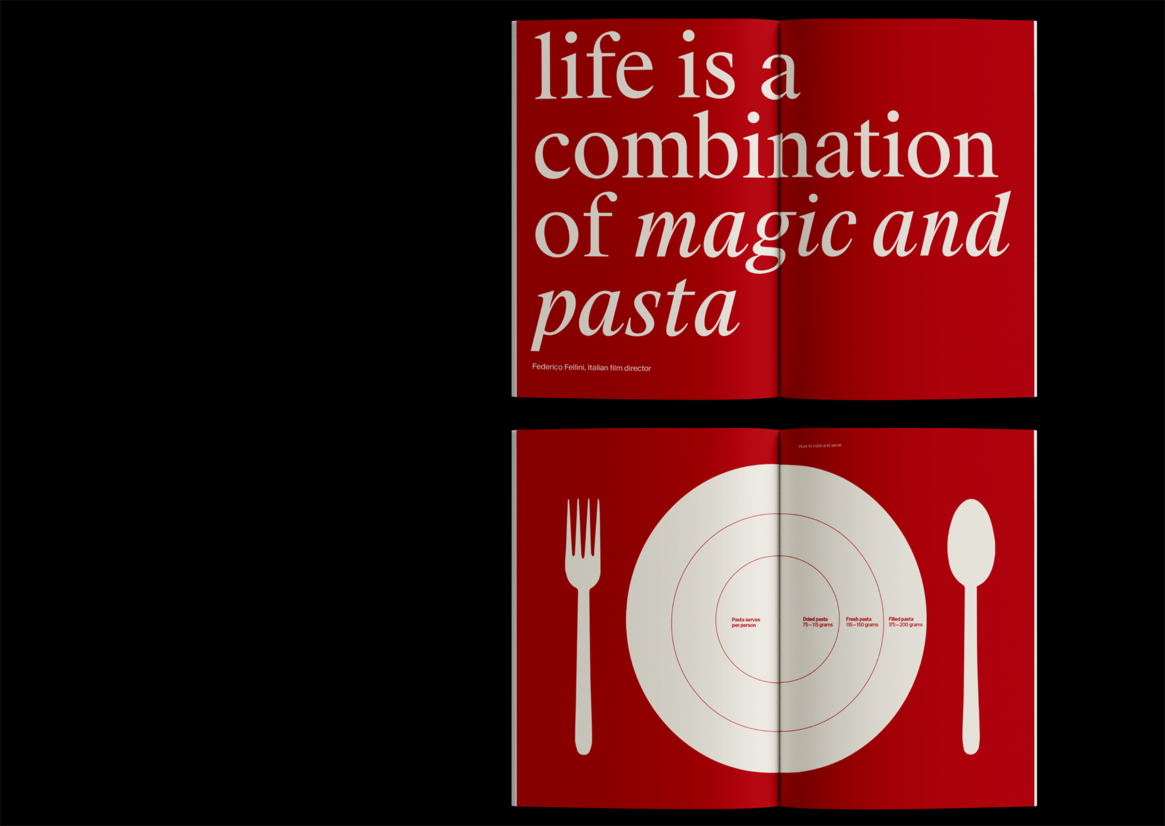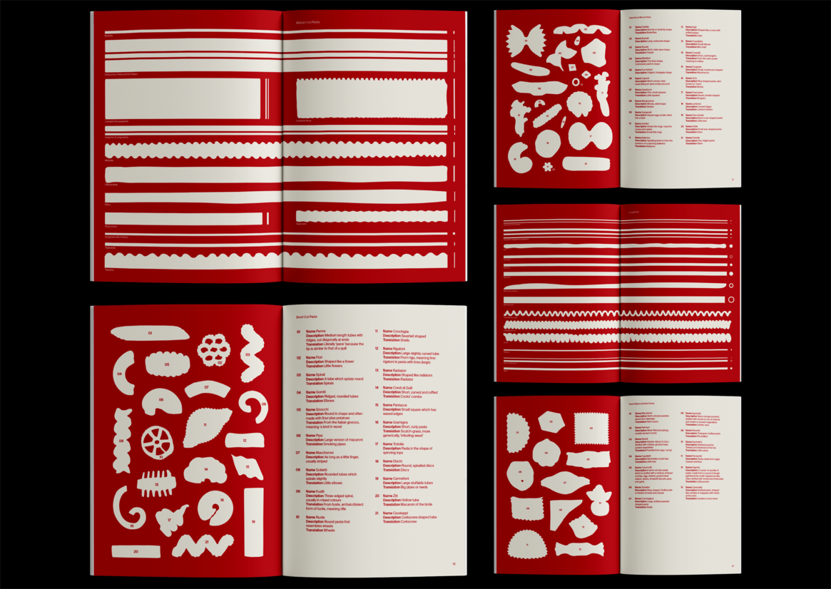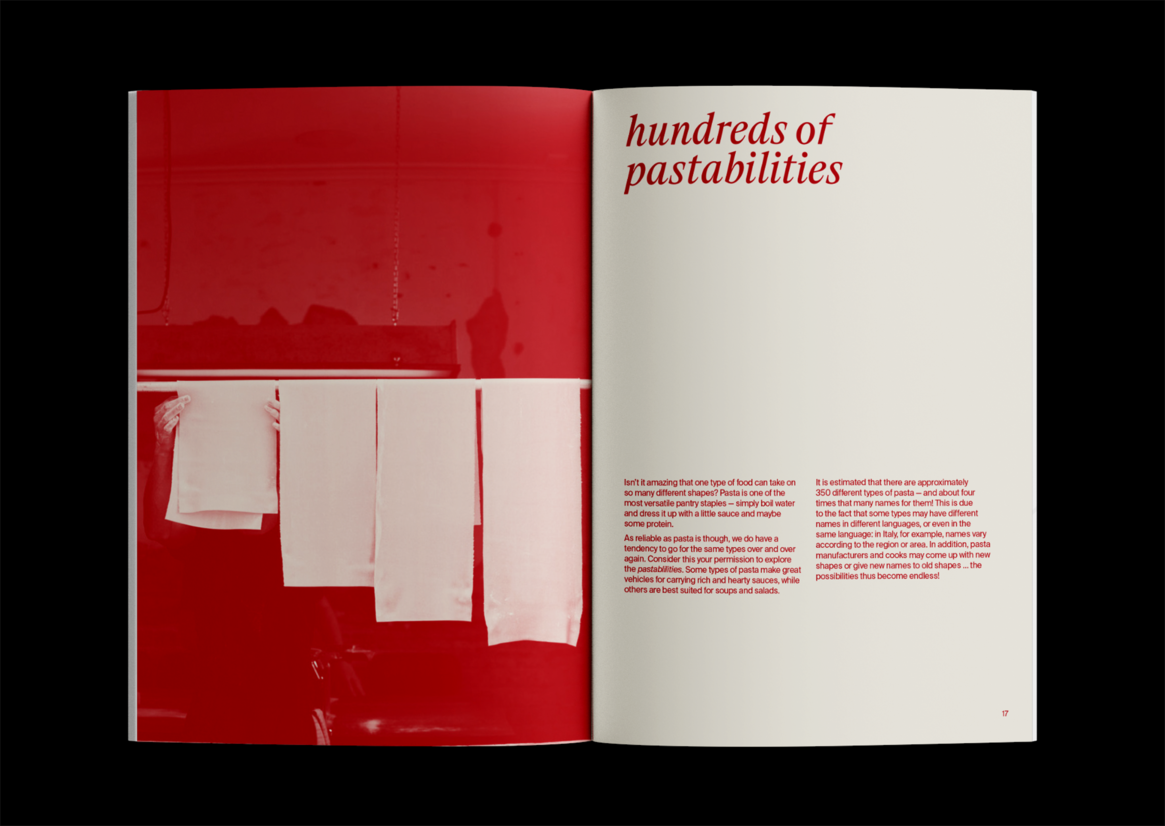 To visualise this vast range of information, I used Suisse Int’l for my body copy as it is a clean, legible neo-grotesque sans serif. As I progressed with the project, I introduced Suisse Works – the counterpart serif to Suisse Int’l. Set in lowercase italics, Suisse Works added sophistication and a traditional feel to the book. The text is set in a ‘Pomodoro-like’ red which references the San Marzano tomato that is prominent within Italian cuisine, especially in sughi rossi (red pasta sauces). The off-white paper stock is a subtle nod towards the sandy colour of pasta itself. I have used a range of images that are in a red and off-white duotone to be consistent with the rest of the visual system. Anyone who loves pasta can enjoy this poster and book combination as it is sophisticated and light-hearted, but simple, and fun!