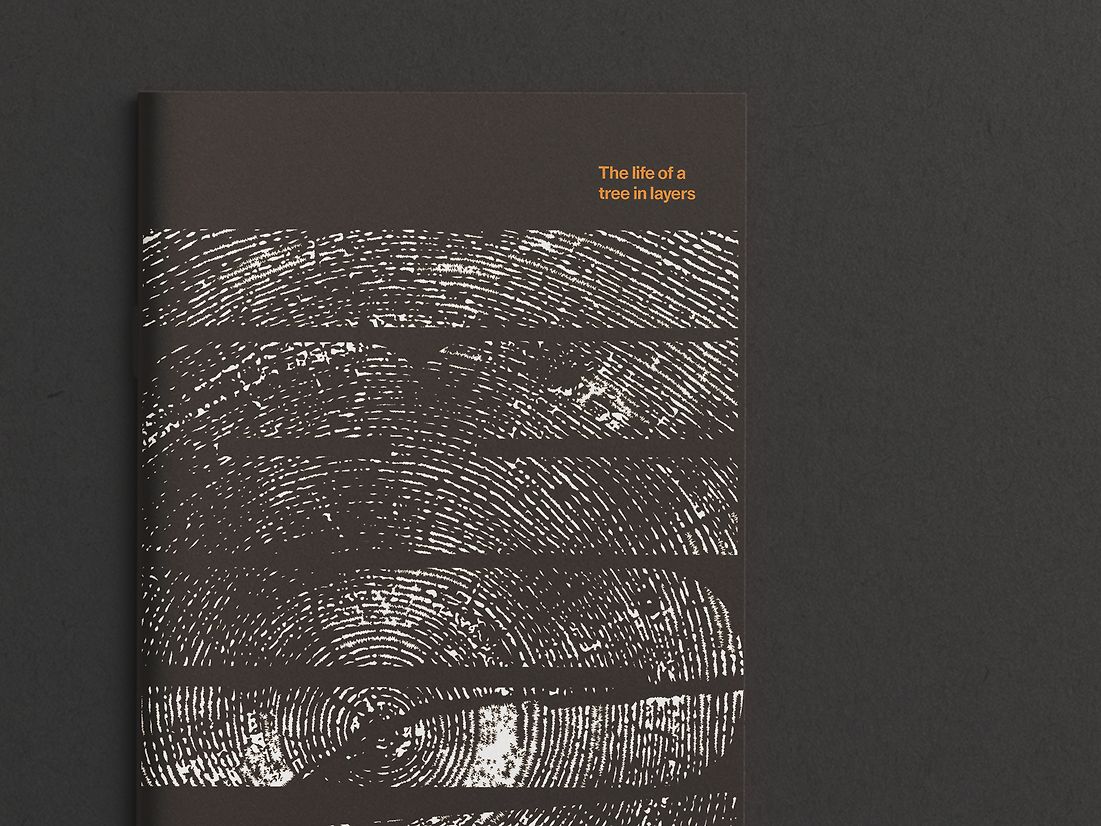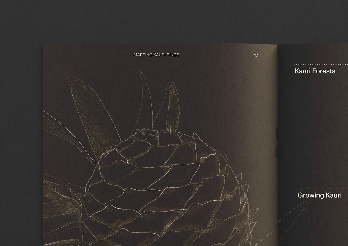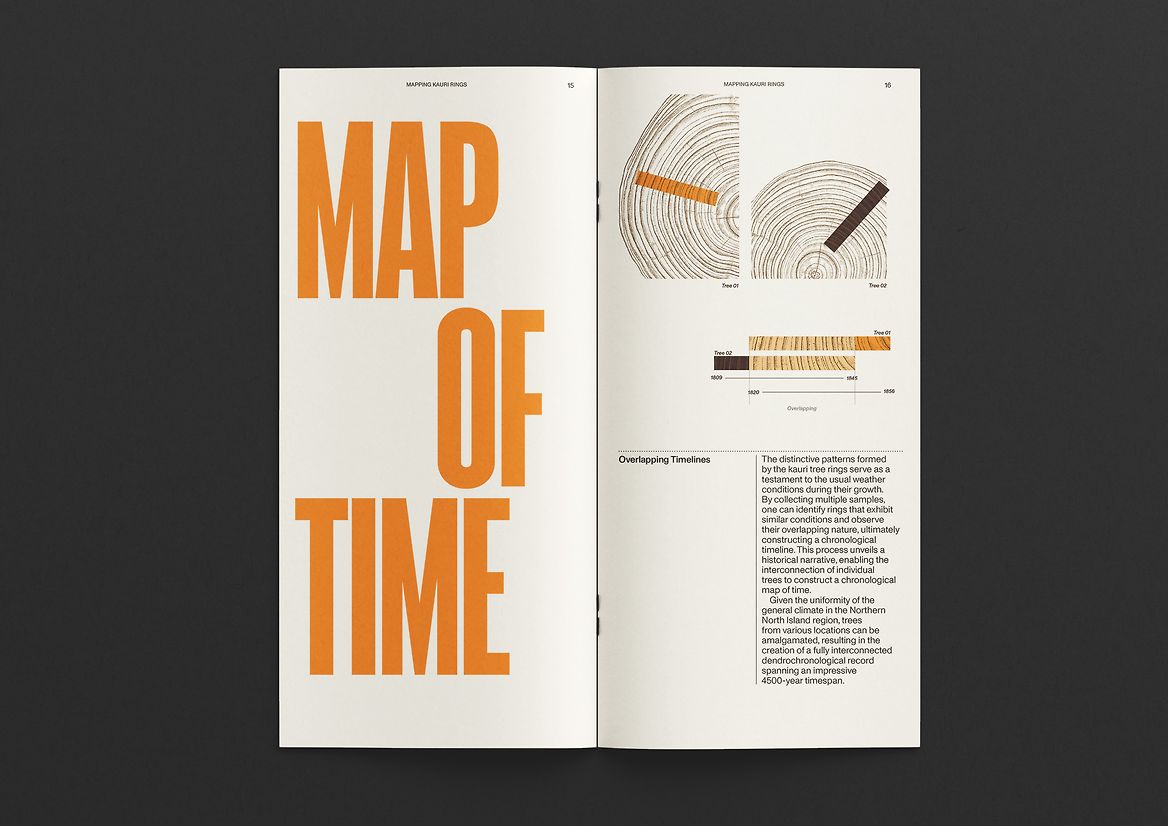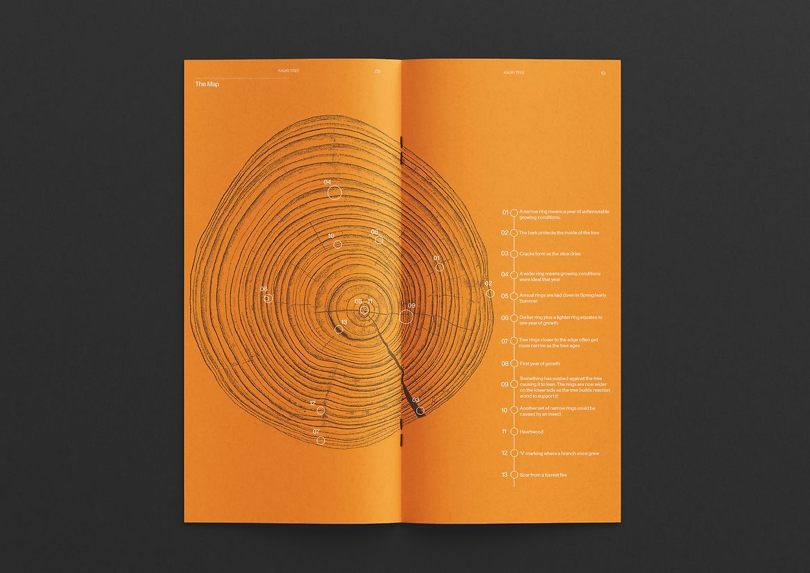 Tree rings trace time. Therefore by tracing their form and integrating the illustration within the header typeface, a striking and expressive display evolves for the cover. This introduces the audience to a visual representation of the idiosyncratic patterns tree growth creates and the map they’re soon to learn about. Through the use of natural materials and thoughtful design, ‘Kauri; The life of a tree in layers’ serves as an educational and accessible resource for all who wish to learn more about this essential aspect of our environment.