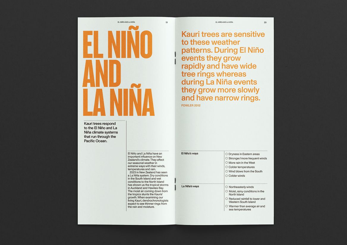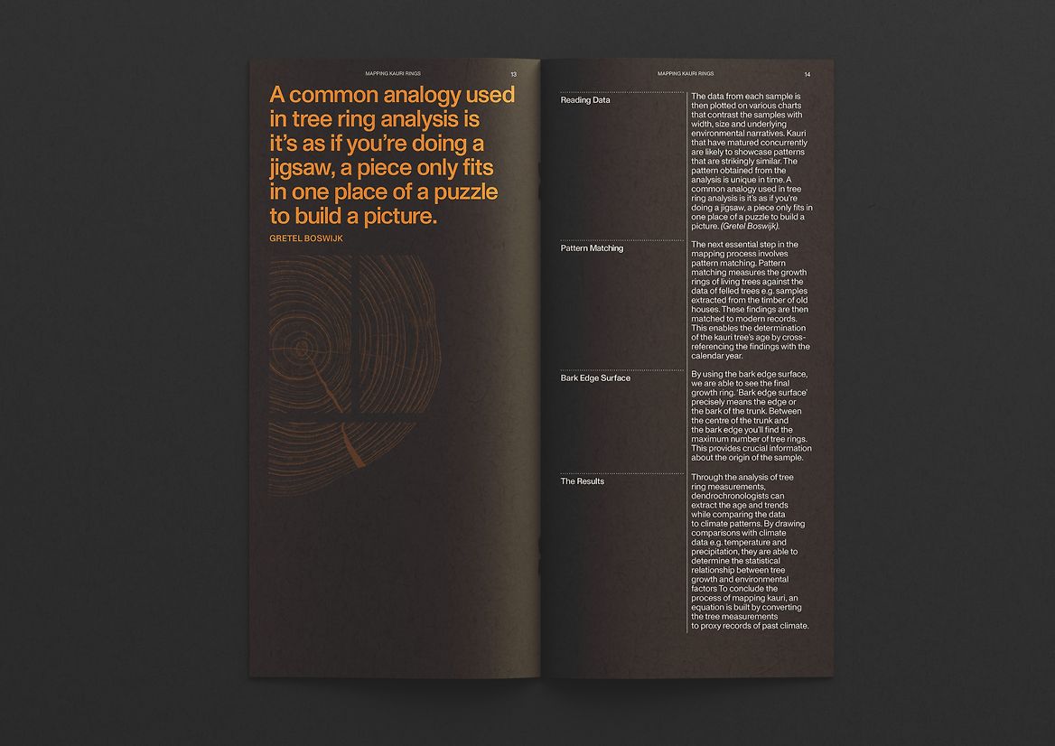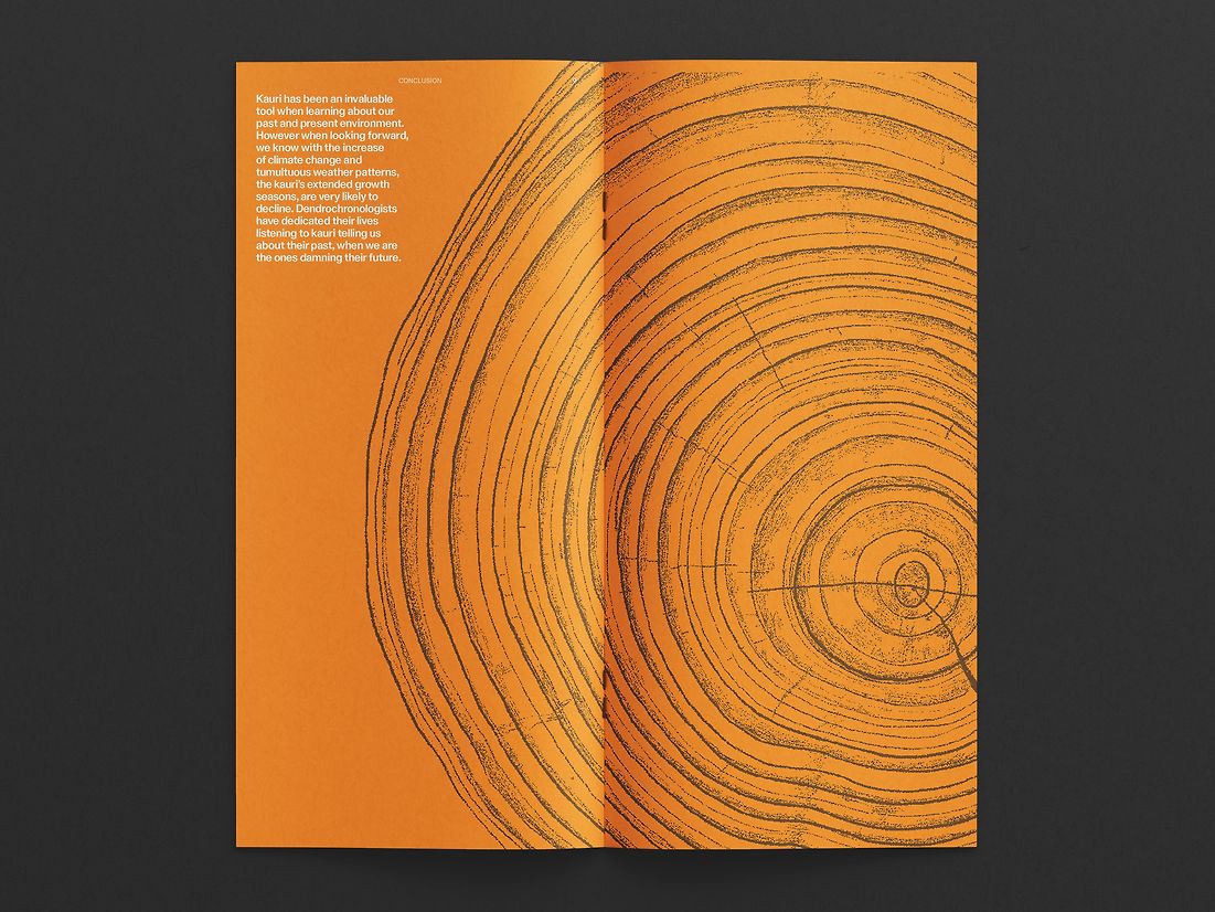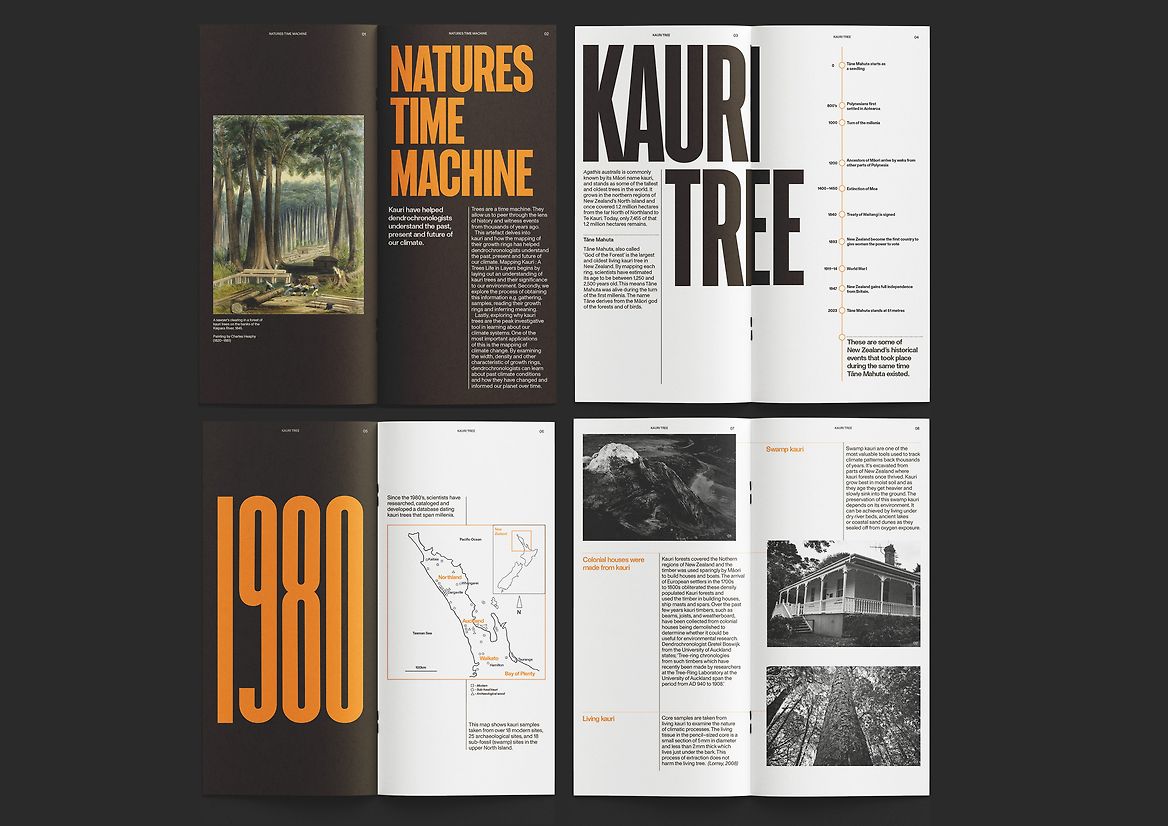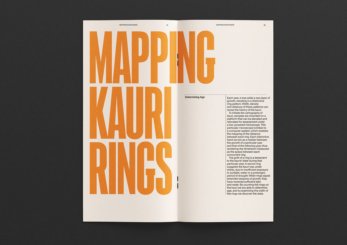 Kauri consist of many shapes, textures and colours. To emulate their essence in this design, long columns are used to hold the body text, mirroring the mightiness and height at which kauri stand among each other. The typeface applied in the headings is F37 Judge. Crafting a bold and tall structure, this typeface ensures each letter is closely hugged by the previous or following letter. This formation imitates kauri’s tree trunks. The primary colour that runs throughout the book is a rich brown which emits earthiness. Secondary to this is orange, an ode to kauri’s bronze foliage.