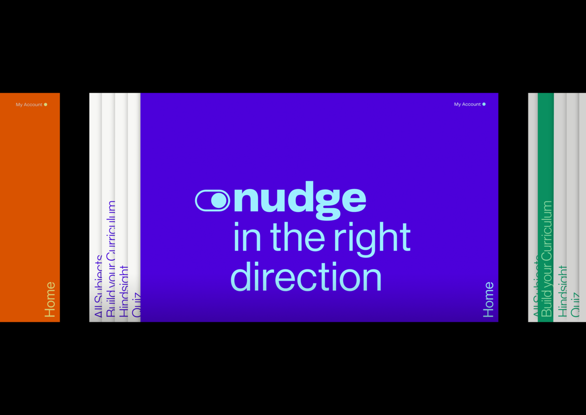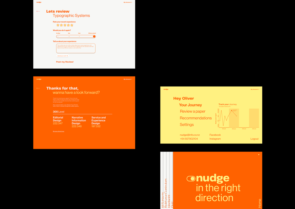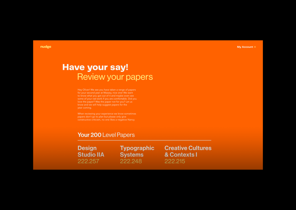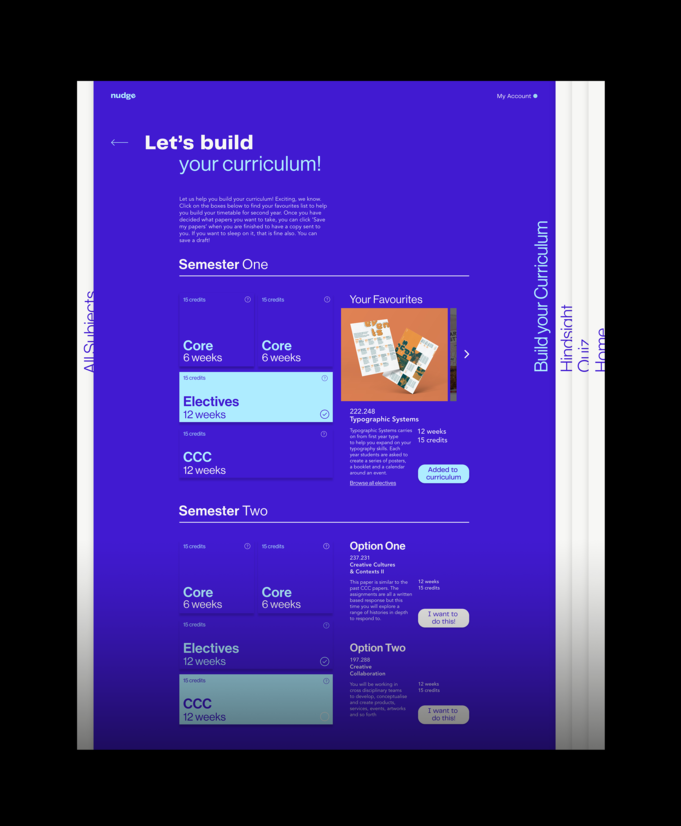 Nudge is designed as an online tool to be accessible to all students, both remote and onsite learners. When designing this platform, there were major tensions between being reliable yet casual, authoritative yet friendly. To combat this, specific design decisions were made. I paired casual everyday sayings like ‘Yeah, Nah’ with official university terminology to help create a casual tone of voice that still felt trustworthy and official. I used bright vibrant colours paired with a clean typographic layout, making it legible yet playful. Each time a student refreshes Nudge, there is a different colour combination hinting to the idea of inclusiveness and the diversity of students. The sliced side panelling links to filing, reiterating the aim to help students organise their curriculum. All decisions were influenced by extensive user testing and the help of my peers, the students. Overall the design method links to my project’s aim, as the style and navigation feels playful yet official, allowing students to still feel confident when picking papers, helping to maximise their time studying.