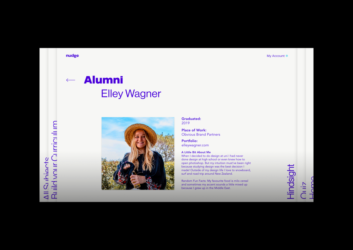 "Each year it is estimated that 1 in 5 university students drop out after their first year of study. After extensive research with past, present and future students, I discovered a common thread. University course descriptions are “fluffy’ and uninformative, therefore there is a lack of radical transparency. This insight informed the foundation of my project, Nudge.