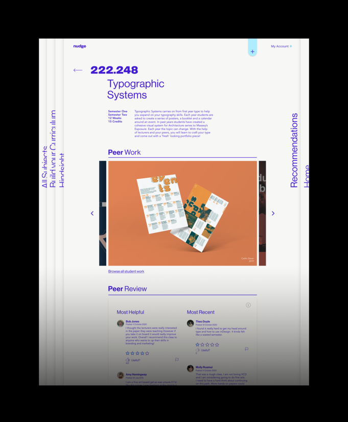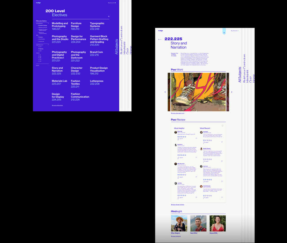 Through research and my own experience, knowing older students can be critical when picking papers, yet many don’t have access to this ‘resource.’ This is where Nudge steps in. Nudge is an online tool that aims to help students within creative fields navigate curriculum through radical transparency, so they can make informed decisions when picking papers. This tool gives students access to student reviews, student work and alumni hindsight, acting as a window into the university experience. Once students have finished a paper, they are able to review their experience and upload any work they want to showcase to their peers. Depending on their review, this will generate suggested papers for the coming year, creating a radically transparent, ongoing and personalised system. By including alumni hindsight, students are able to see how opinions on papers may change overtime, creating nuance and encouraging deeper thinking towards their own future.