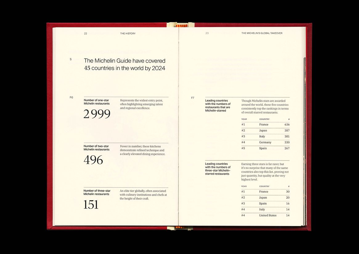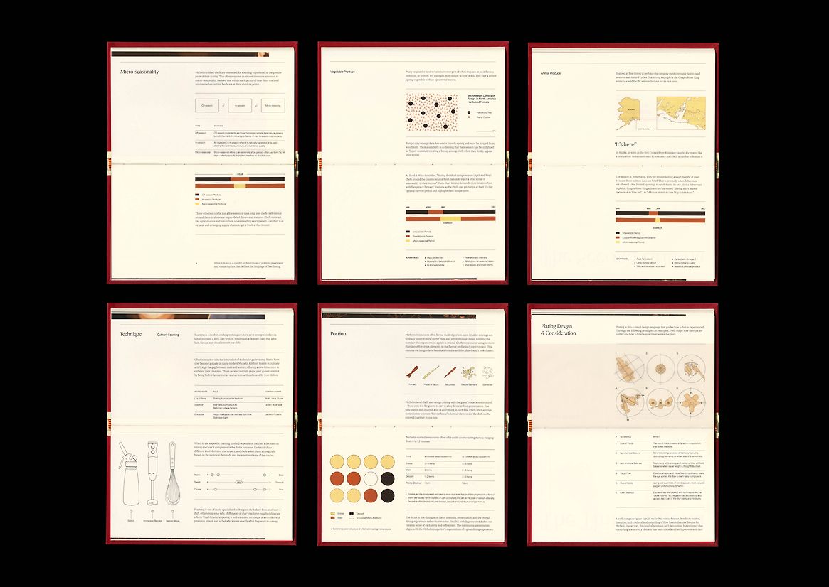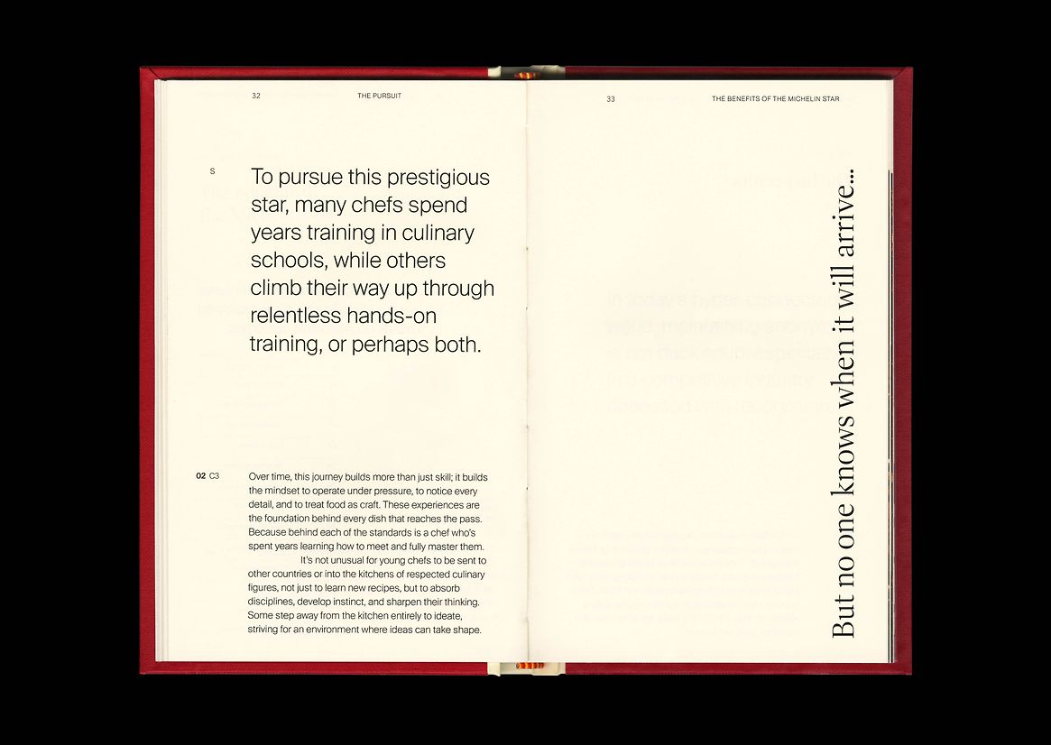 The book opens with a neutral, archival tone that initially positions readers as outsiders observing the Michelin system from a distance. As the narrative unfolds, this tone gradually transforms. The typography becomes increasingly expressive, guiding readers from passive observation toward immersive, personal engagement. Even though a wide range of typefaces was introduced to the publication, their functions and proportions are intent, reflecting the calculated complexity and the harmony found in fine dining dishes collectively.