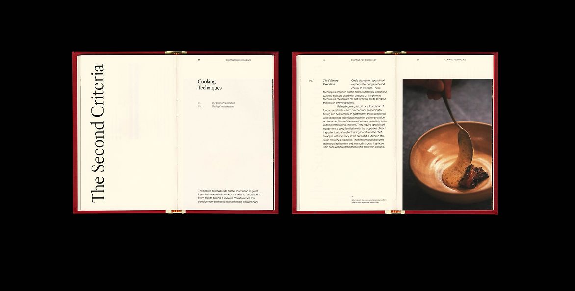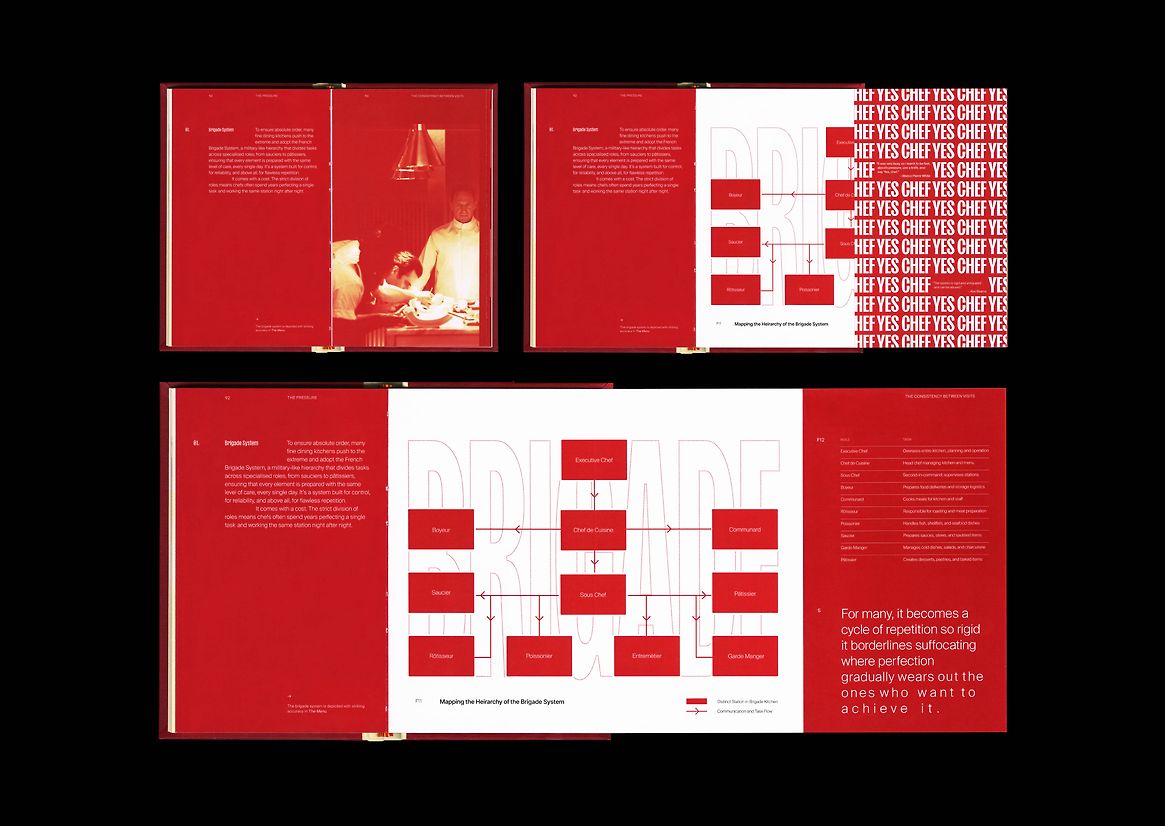 Layout and pacing also play an important role. The Prestige section features more generous white space and balanced arrangements to amplify the distinction and finesse. The Pressure section becomes more compressed and expressive in an orderly sense, which reflects the underlying intensity and emotional strain that often go unnoticed behind the Michelin kitchens. A vertical reading system was also established to bridge these narratives as it introduces an entry that allows readers to put themselves into the thinking process of chefs, in a way that is subtle but heart-felt.