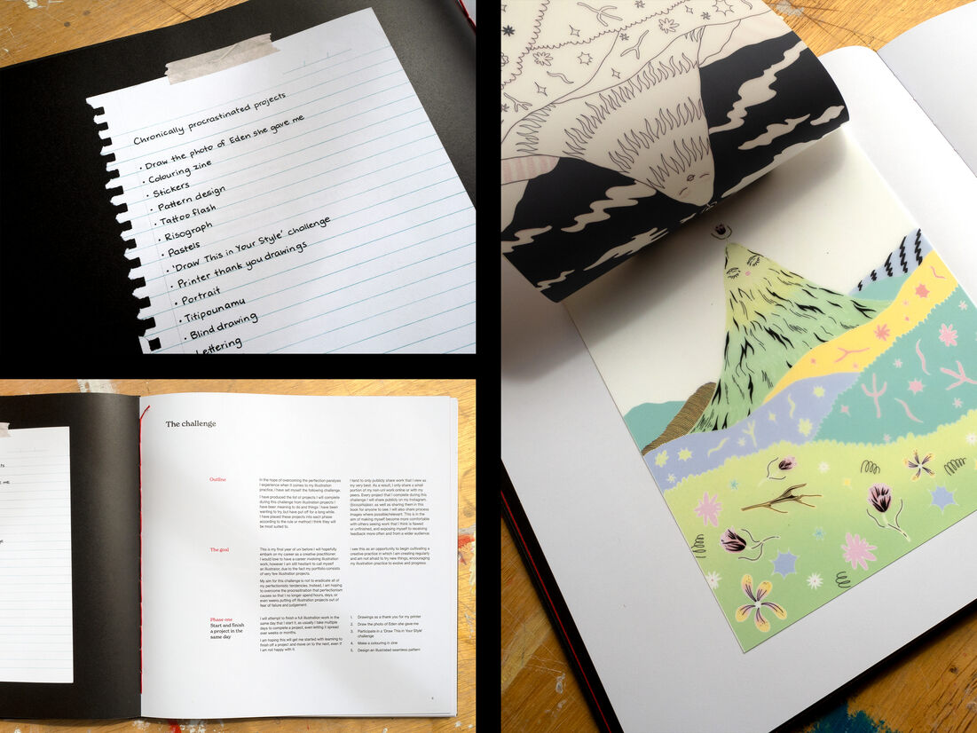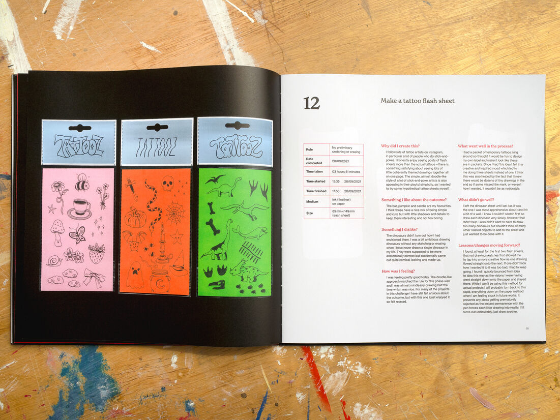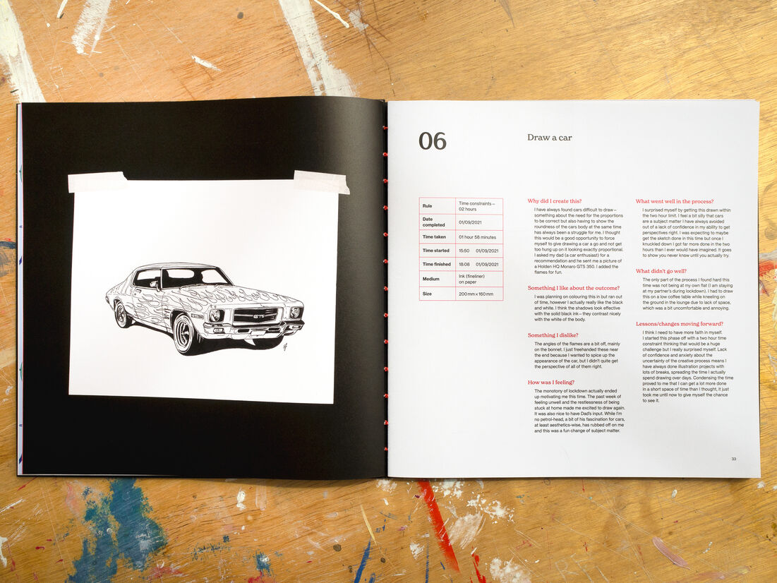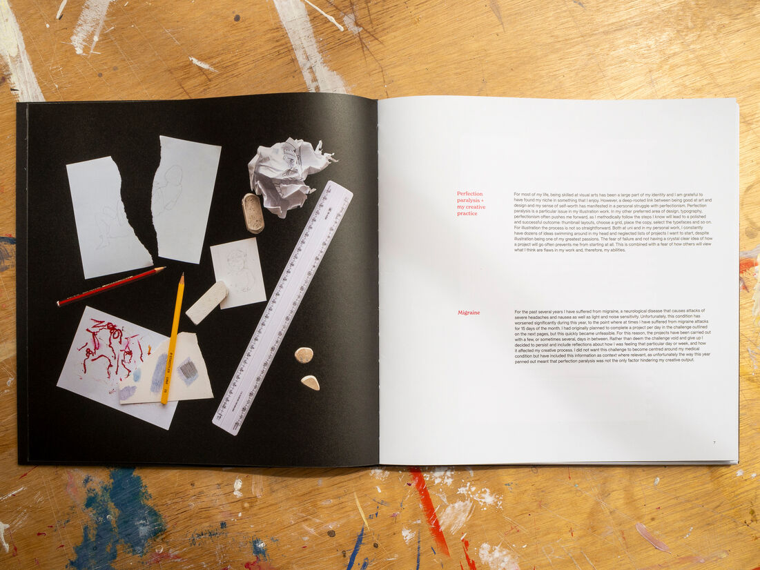 Central to my design approach was the need for the book to feel inviting and accessible. The large, square format lends itself to images of both portrait and landscape orientation, most of which are shown full-size. The images are askew and appear attached by tape to create an intimate scrapbook feel. Process spreads reveal earlier, unrefined stages of projects where relevant. The reflection's layout takes inspiration from logbook entries, making it clear to read and contrasting with the eclectic illustration pages. I created the cover title type myself, inspired by the hand-lettering task I undertook as one of the challenges. Using coptic stitching I have bound the book myself, matching the essence of the project by trying yet another new skill and giving the book an authentic, artistic appearance.