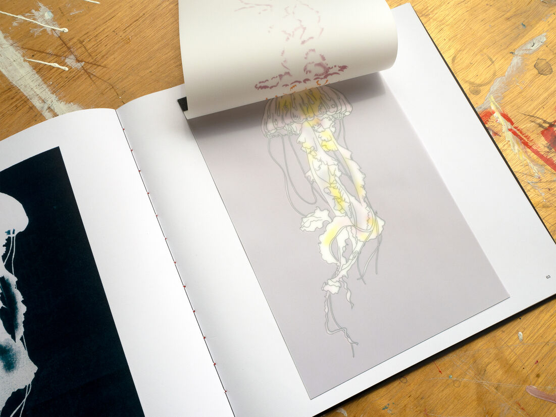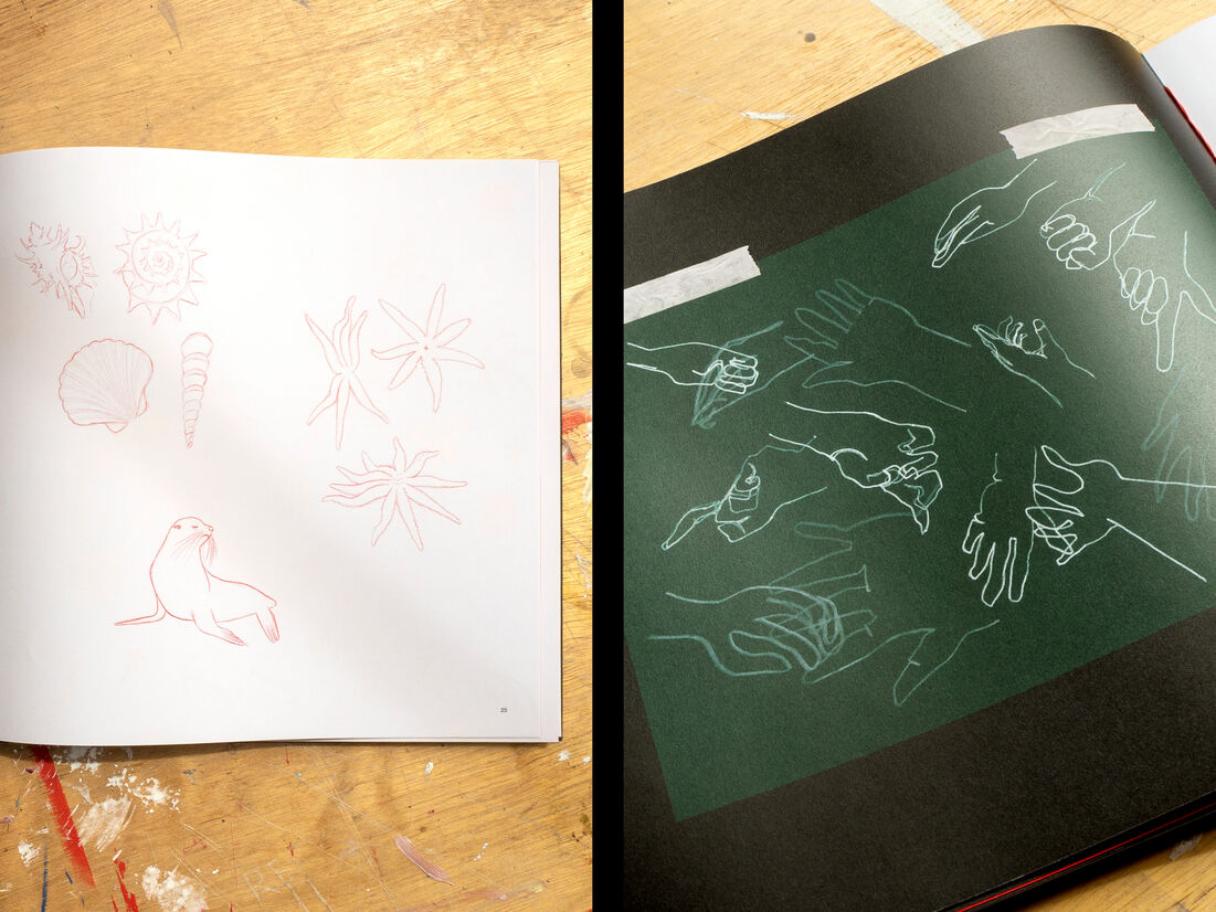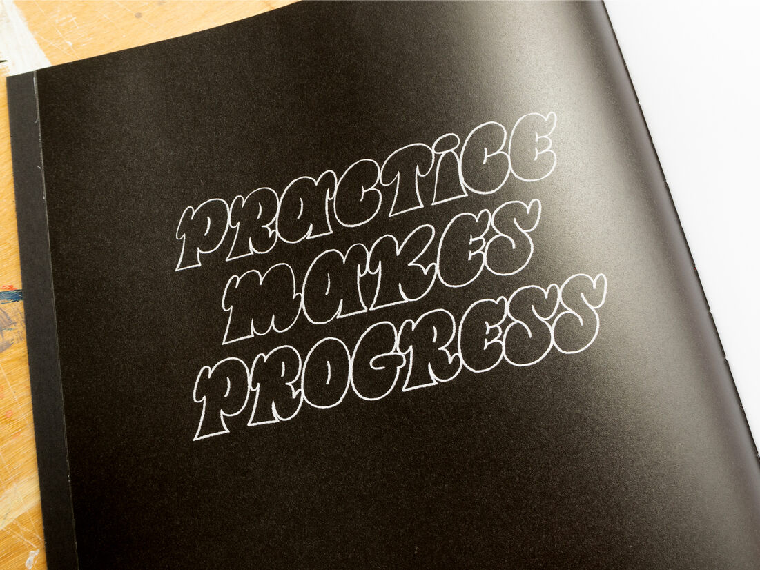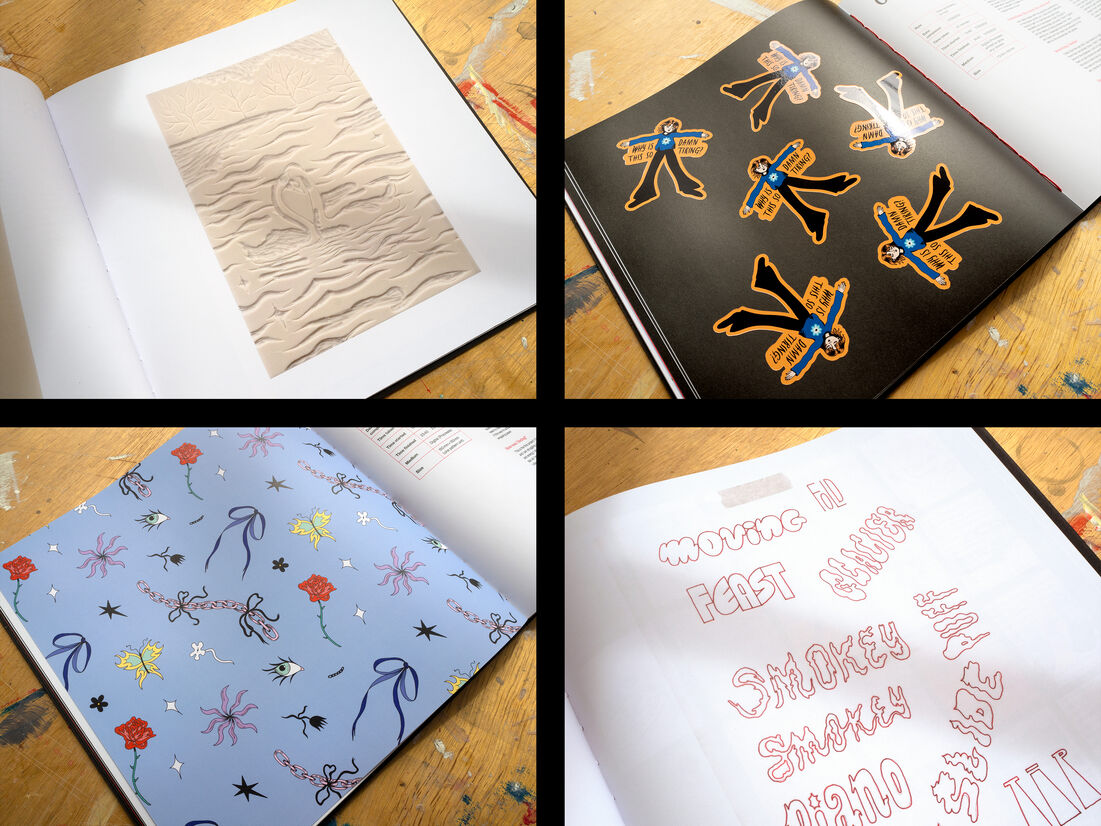 Central to my design approach was the need for the book to feel inviting and accessible. The large, square format lends itself to images of both portrait and landscape orientation, most of which are shown full-size. The images are askew and appear attached by tape to create an intimate scrapbook feel. Process spreads reveal earlier, unrefined stages of projects where relevant. The reflection's layout takes inspiration from logbook entries, making it clear to read and contrasting with the eclectic illustration pages. I created the cover title type myself, inspired by the hand-lettering task I undertook as one of the challenges. Using coptic stitching I have bound the book myself, matching the essence of the project by trying yet another new skill and giving the book an authentic, artistic appearance.