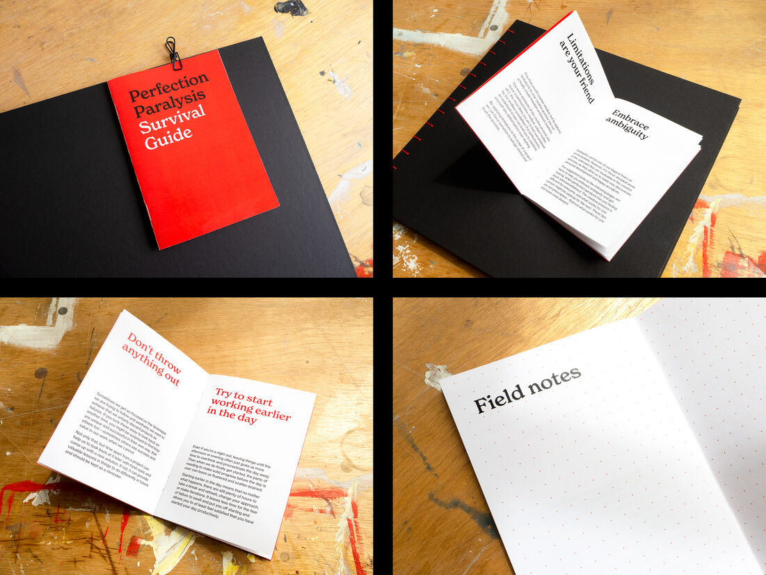The accompanying pocket book ‘Perfection Paralysis Survival Guide’ compiles everything I learned into something concise and easy to use for fellow emerging creative practitioners. The tips and tools are adaptable suggestions so users can take what they want and leave the rest, with the ‘Field notes’ section at the back providing room for personal notes.