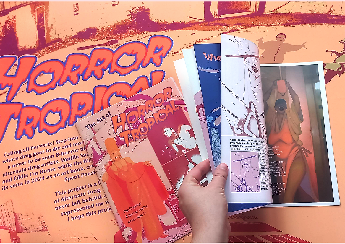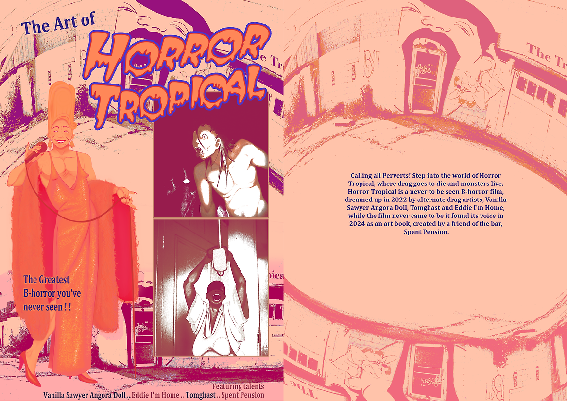 Calling all Perverts! Step into the world of Horror Tropical, where drag goes to die and monsters live. Horror Tropical is a never to be seen B-horror film, dreamed up in 2022 by alternate drag artists, Vanilla Sawyer Angora Doll, Tomghast and Eddie I'm Home, while the film never came to be it found its voice in 2024 as an art book, created by a friend of the bar, Spent Pension.