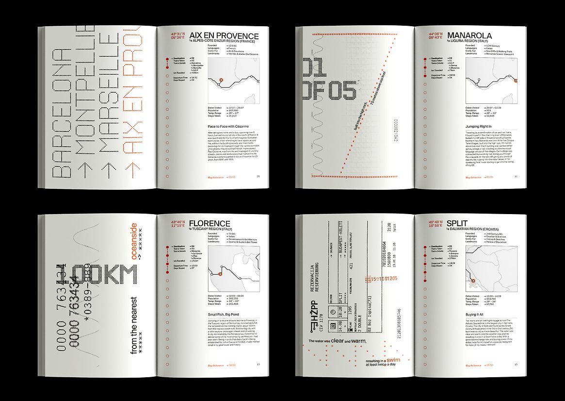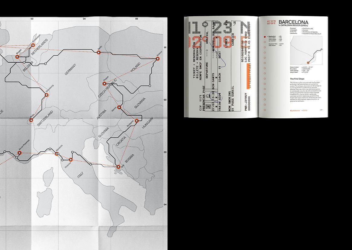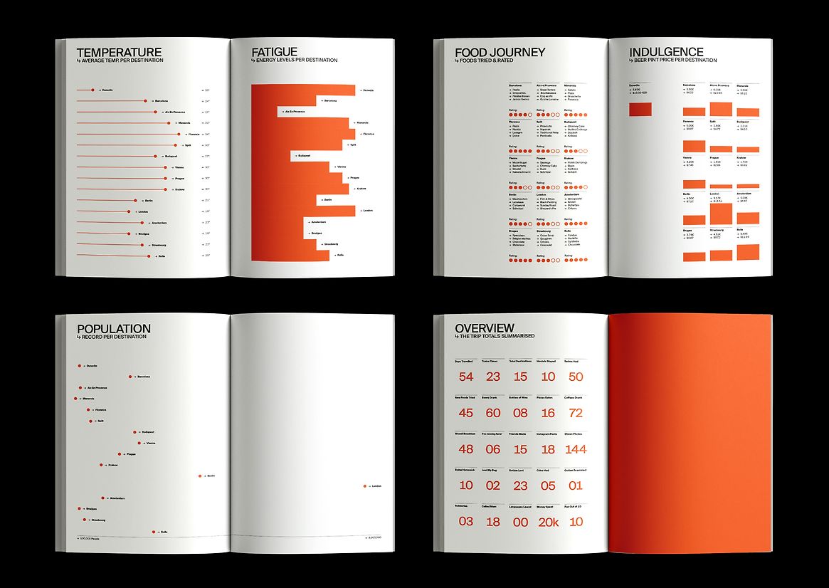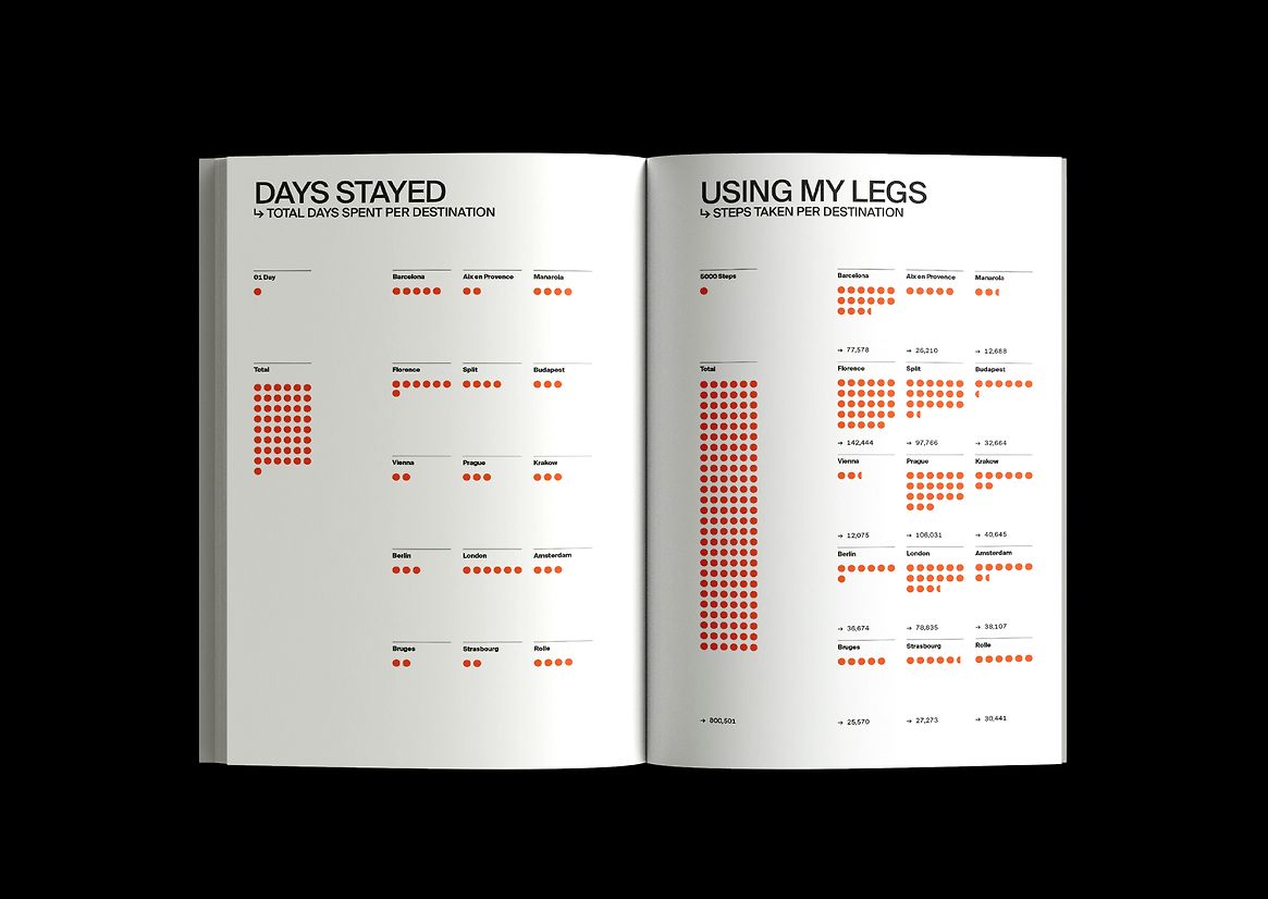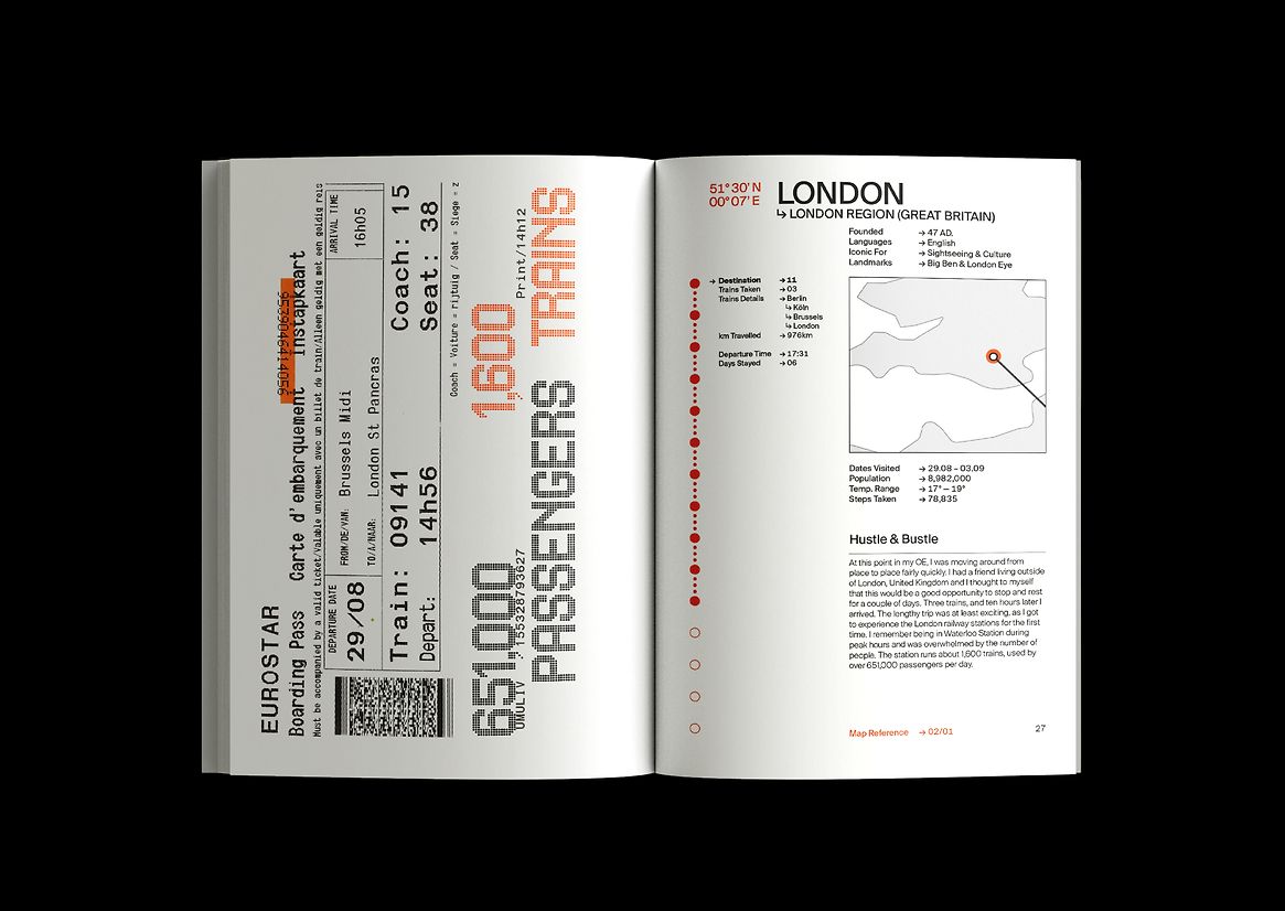 The design embraces a mix of editorial storytelling and typographic exploration. My journey is told chronologically, following the train journeys and my experiences of individual European destinations. Each location is represented by a combination of local train tickets and related typographic elements, personal reflections and statistical data. The narrative focuses on the rich experiences, observations and personal reflections I encountered during my journey. The section at the end of the book is dedicated statistical mapping of my overall experience and a summary of my impressions of each place.