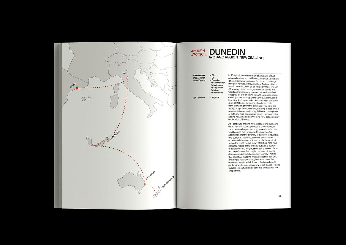 In 2018, I set off on my European overseas experience visiting 14 countries, and 23 cities by train. As I travelled, I kept track of my experiences, creating a visual and statistical representation of my journey. I collected data from all the countries I visited, including the train journeys between them. From this I have created a data-driven representation of my trip. By curating the information and ephemera I had collected, I created The Big OE as a map of my personal journey. The statistical mapping provides a lens through which to view the world, not only exploring the physicality of places, but the cultural and economic landscapes that shape them.