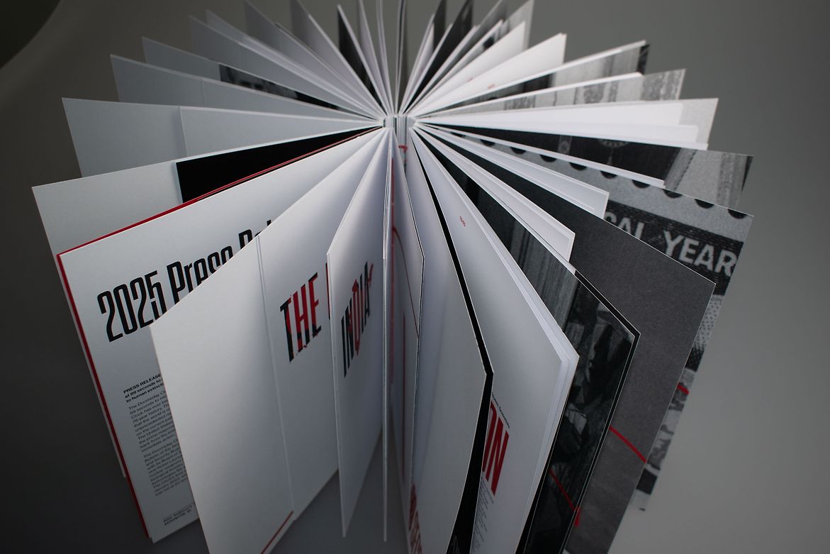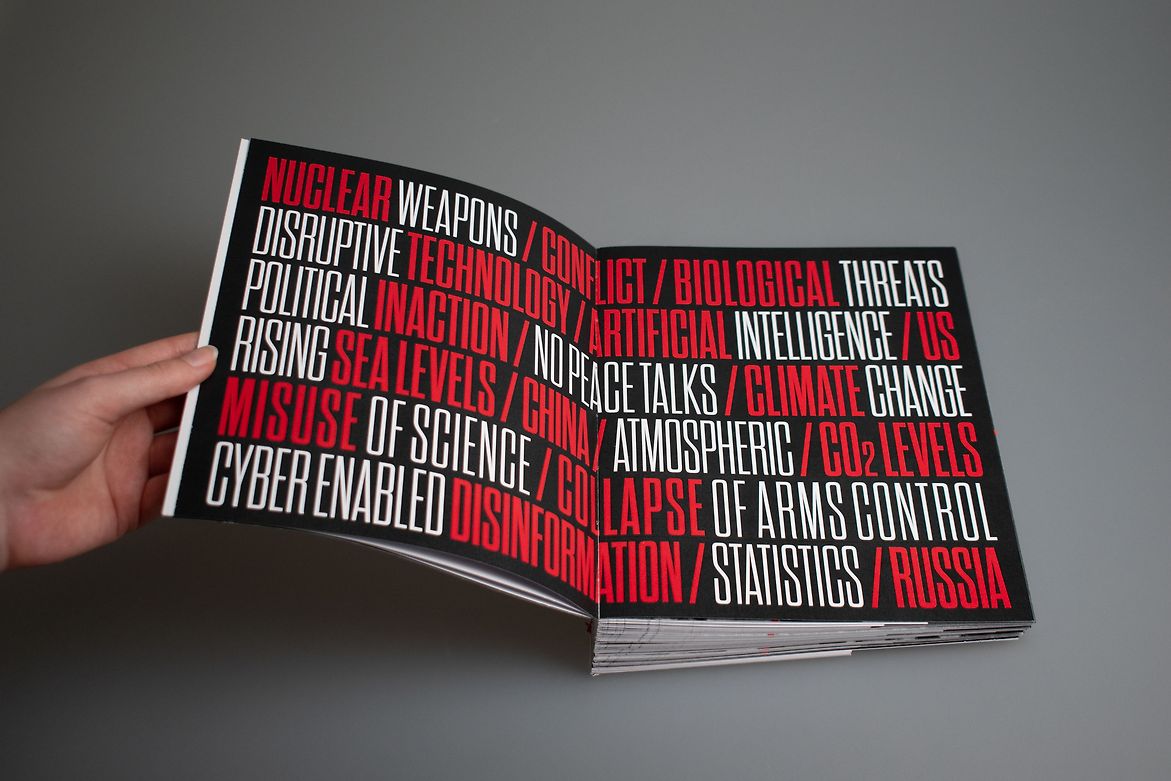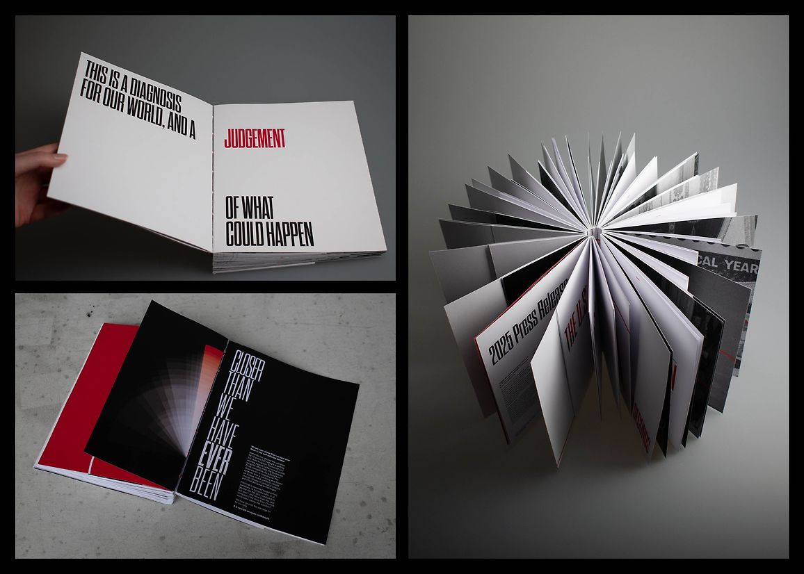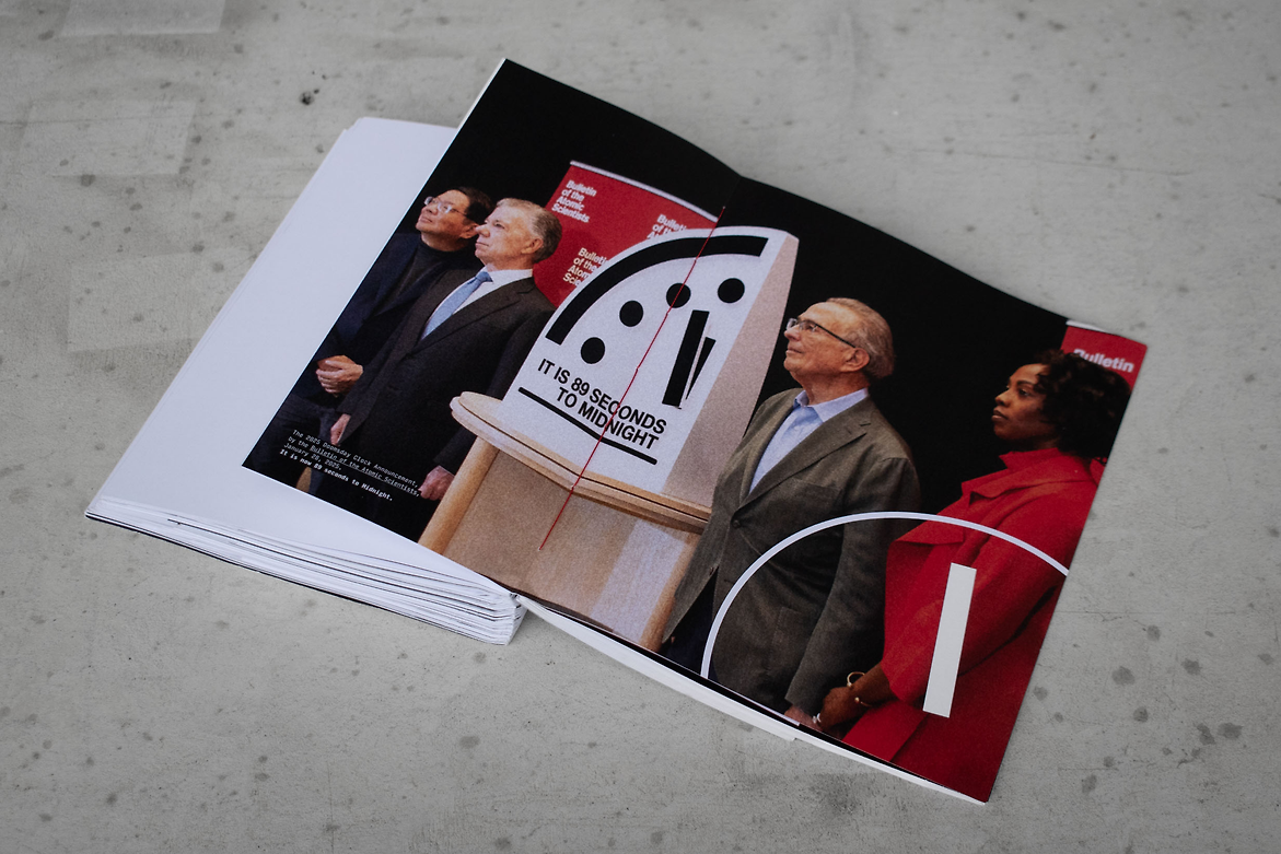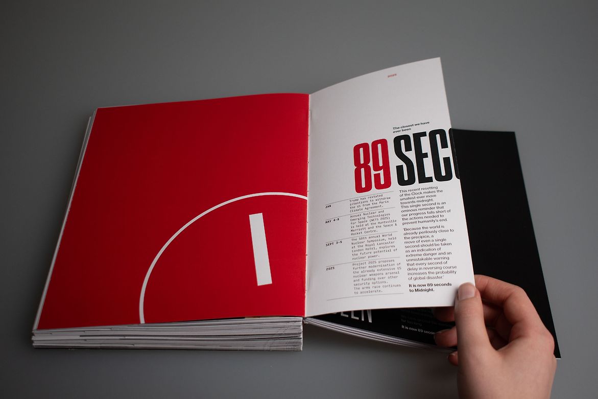 Upon reaching the current milestone, 89 seconds, the publication gives a gloomy reminder of the current state of nuclear risk in 2025 through press releases and statements, and reveals the countries that still maintain an arsenal of nuclear weapons. It closing with the warning: ‘We are running out of time.’ This book was designed to be displayed standing up with its pages flared out, harnessing the motif of a clock. The book takes form as a tangible representation of the movements of the Doomsday Clock since its conception, with the time pages widening as the ‘hand’ moves away from Midnight, and narrower, as it inches closer. The time header on each page is cut off as the body copy and page gets narrower, also reflecting movements of the Clock.