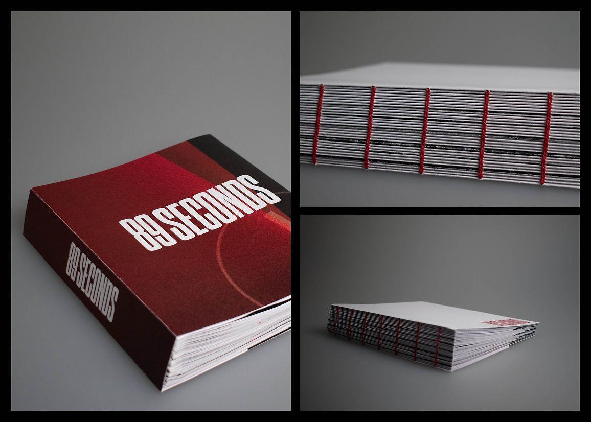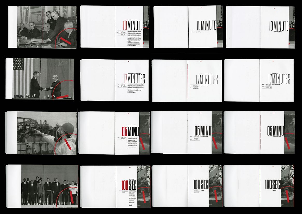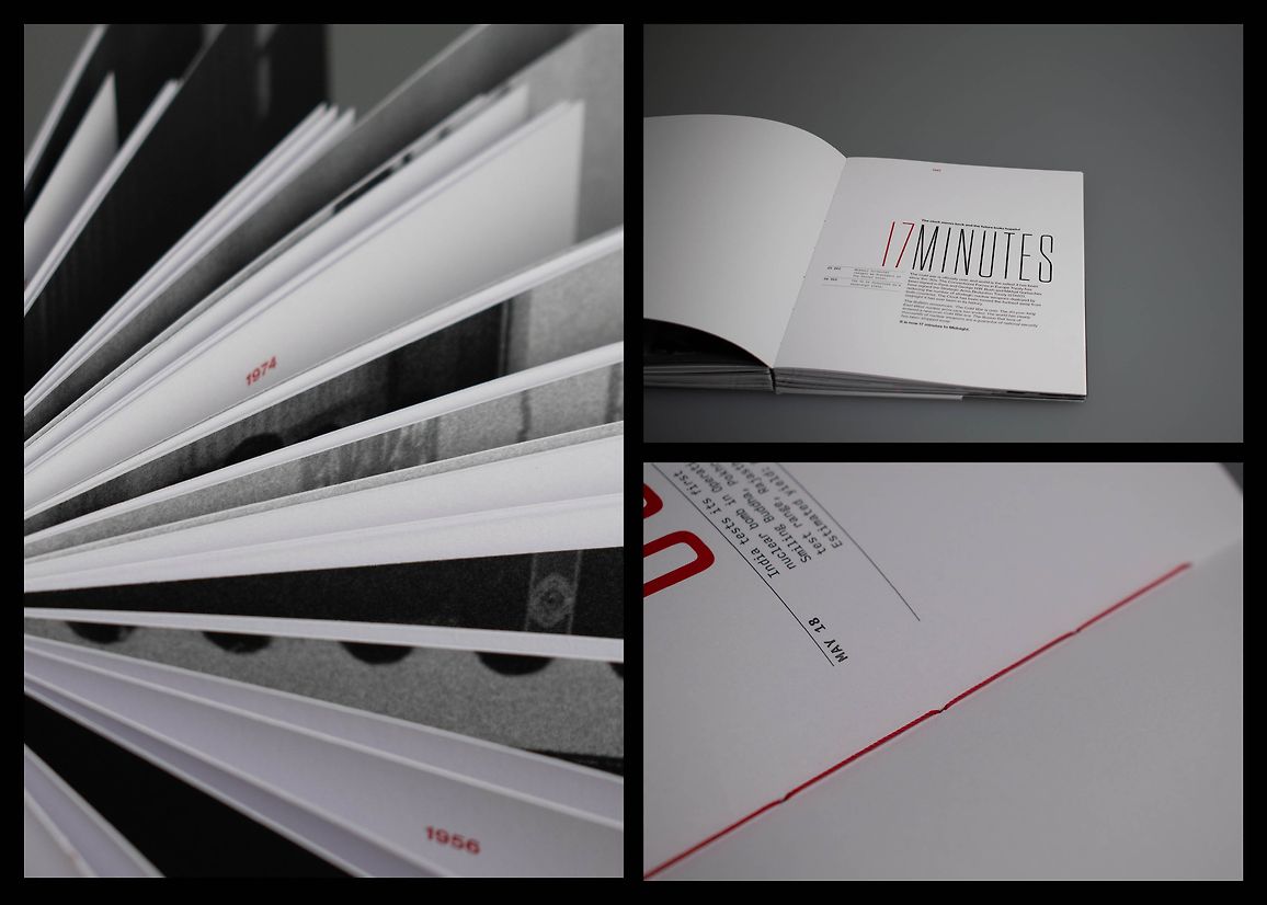 This book was designed to be displayed standing up with its pages flared out, harnessing the motif of a clock. The book takes form as a tangible representation of the movements of the Doomsday Clock since its conception, with the time pages widening as the ‘hand’ moves away from Midnight, and narrower, as it inches closer. The time header on each page is cut off as the body copy and page gets narrower, also reflecting movements of the Clock.