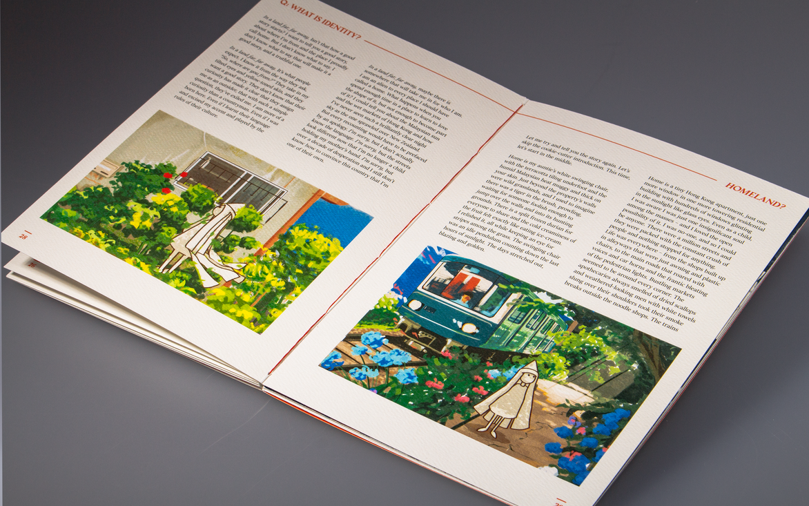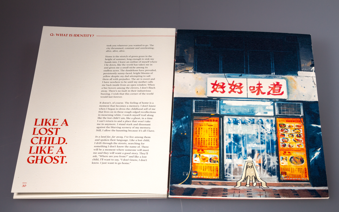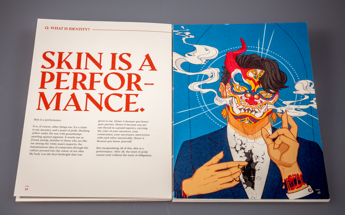 The editorial medium itself is a statement as well – it demands that the articulation of Asian identity deserves to take up space. As such, the project is produced as a tangible book of textured paper stock, hand-bound in an exposed kettle-stitch spine.