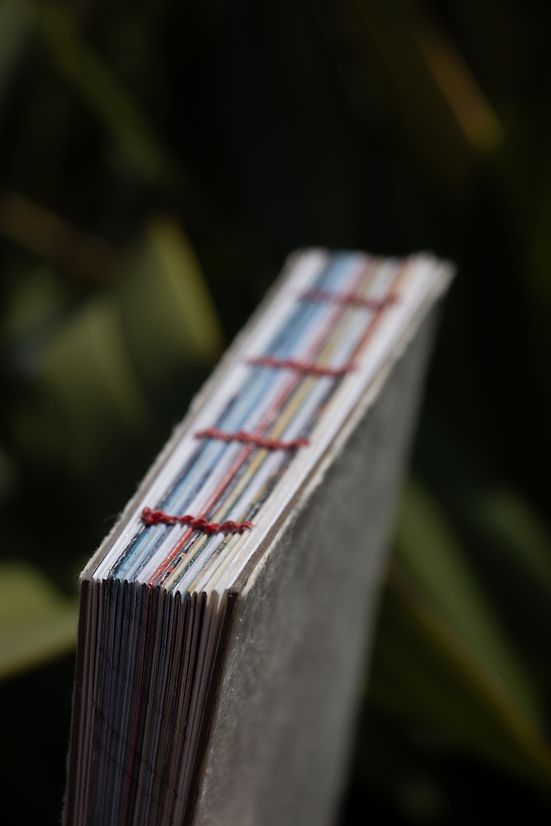 Hand-bound with harakeke paper, the journey begins and ends with te taiao. Exposed binding symbolises unfolding stories through layers, while tracing paper creates physical layers between text and image. A red thread, representing the blood and sinew of Rakinui and Papatūānuku, binds these elements—connecting all aspects of whakapapa.