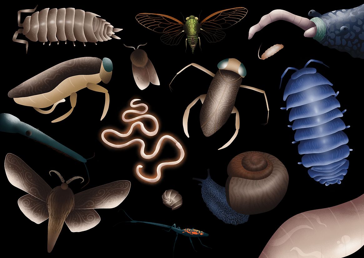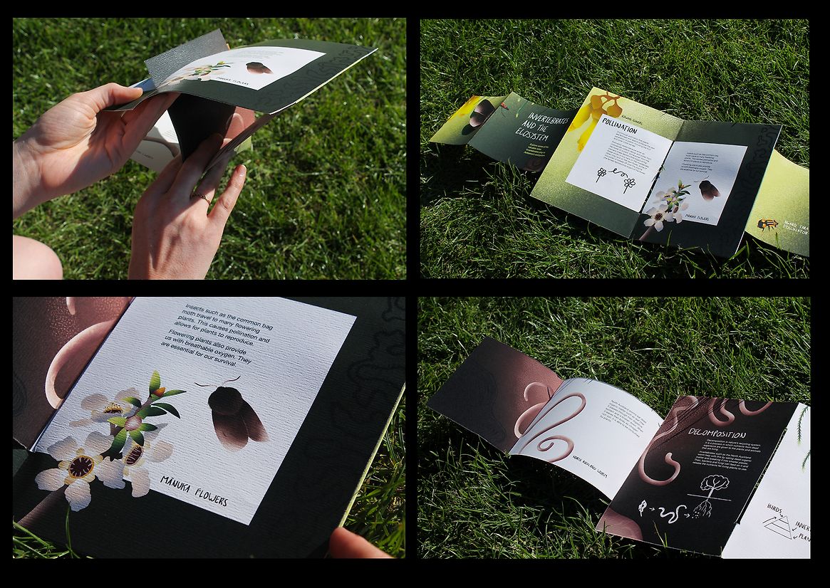 Invertebrates and the Ecosystem is an additional brochure that explains three ecosystem processes referenced in Unearthed — pollination, decomposition and food web contributor. It dives deeper into these processes, how they work and why they’re important. It folds in on itself to reflect the complex and symbiotic nature of an ecosystem. Together, the brochure and Unearthed contribute to enhanced empathy and understanding to support kaitiakitanga and the protection and guardianship of native invertebrates in Aotearoa.