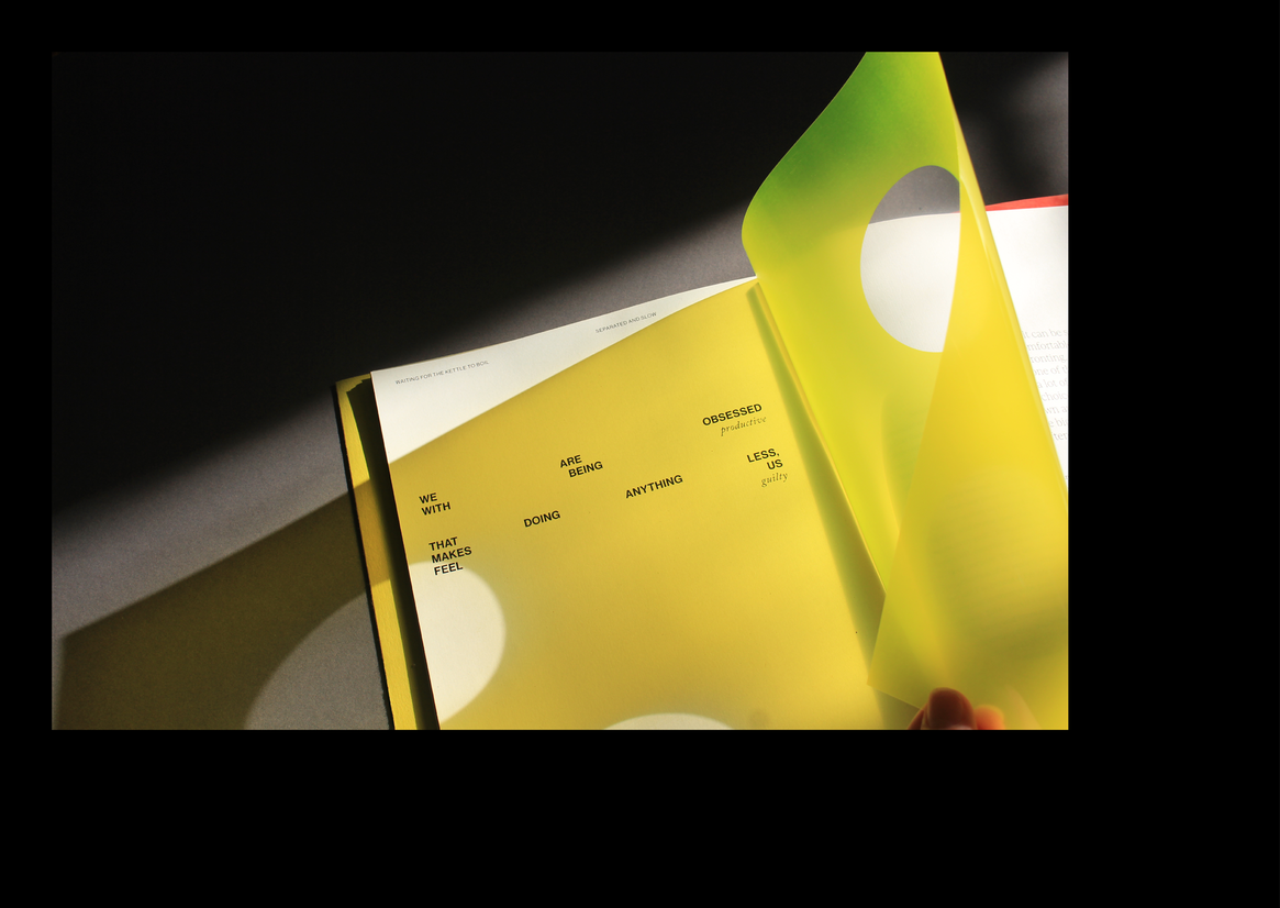 ‘Waiting for the kettle to boil’ is a tactile, poetic publication that explores slowness in a fast world. Through personal experience and an auto-ethnographic approach during isolation, the book explores the good, the challenging, and the vulnerable nature of slowing down when the world is urging you to speed up. This personal project is a response to my fear of time.