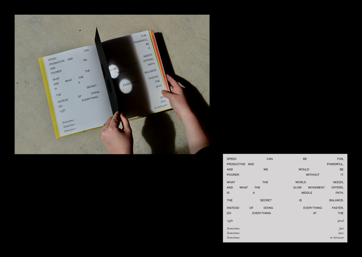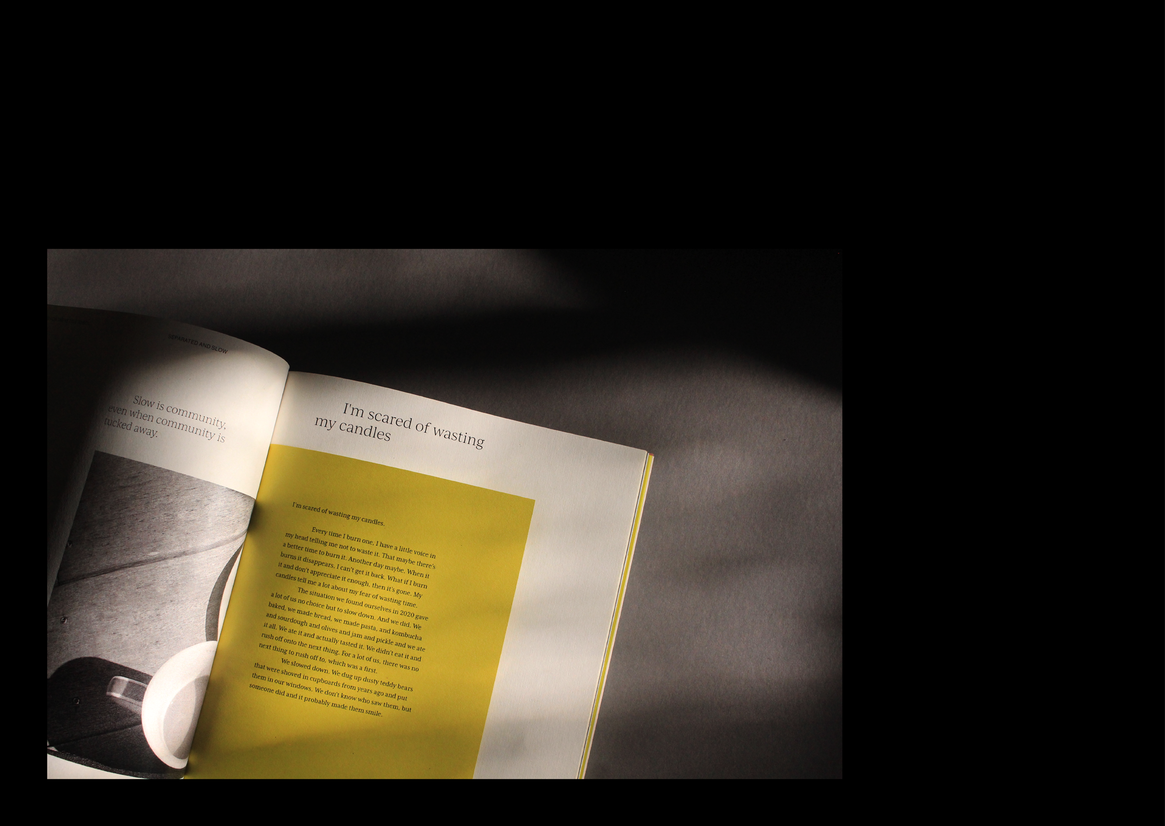 2020 was a year of loss, pain, and anxiety. But at the same time it was one of togetherness, love, and human connection in times of need, highlighting the significance of slowness in the nurturing of human relationships. A homage to 2020, this publication comments on the obligation to live quickly, and how finding balance in the pace of life can nourish relationships, perspective and connectedness.