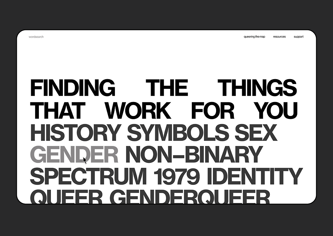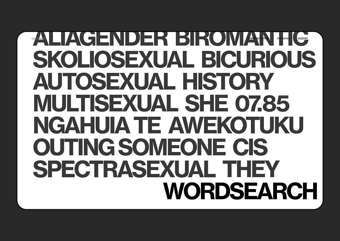 Introducing Wordsearch, an educational resource dedicated to offering queer-centric definitions and historical insights on identity. Designed to reimagine the landscape of heteronormative high school sex education in Aotearoa, Wordsearch creates an inclusive and understanding environment for adolescents.