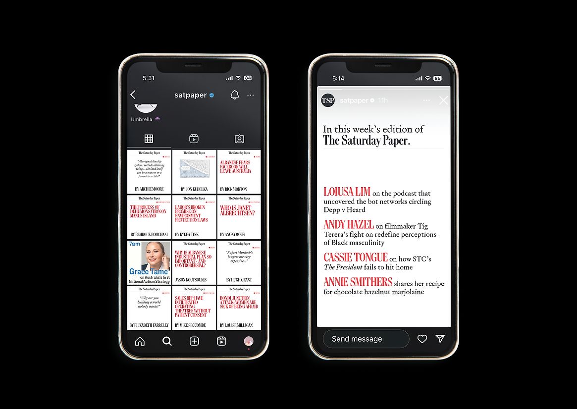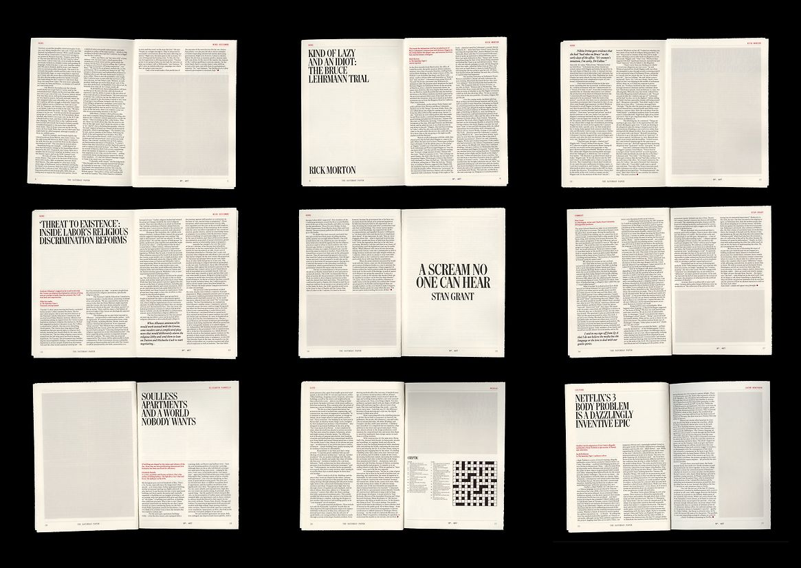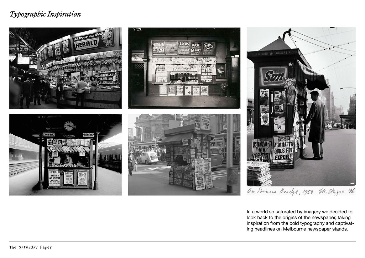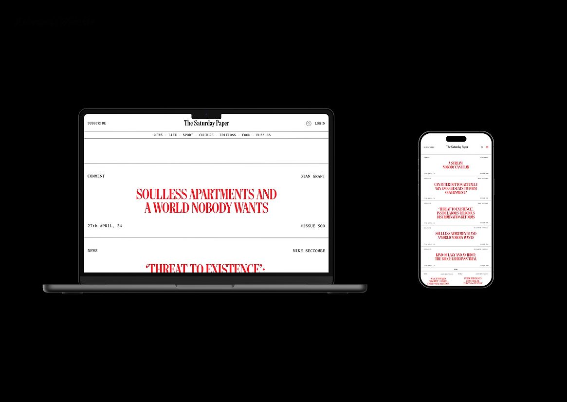 The design draws upon the strong typographic language of headlines on newsstands in Melbourne in the early to mid-20th century. The historical reference was integral to our overall design, drawing on the legacy of newspaper design systems with strong, trustworthy serifs as well as linking it to a local historical context. Bold headlines replace images emphasising the witty and eye-catching headlines and showcasing The Saturday Paper's unique tone of voice.