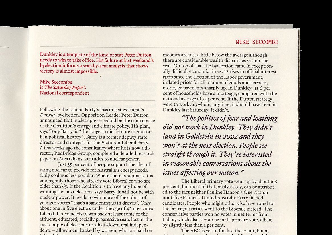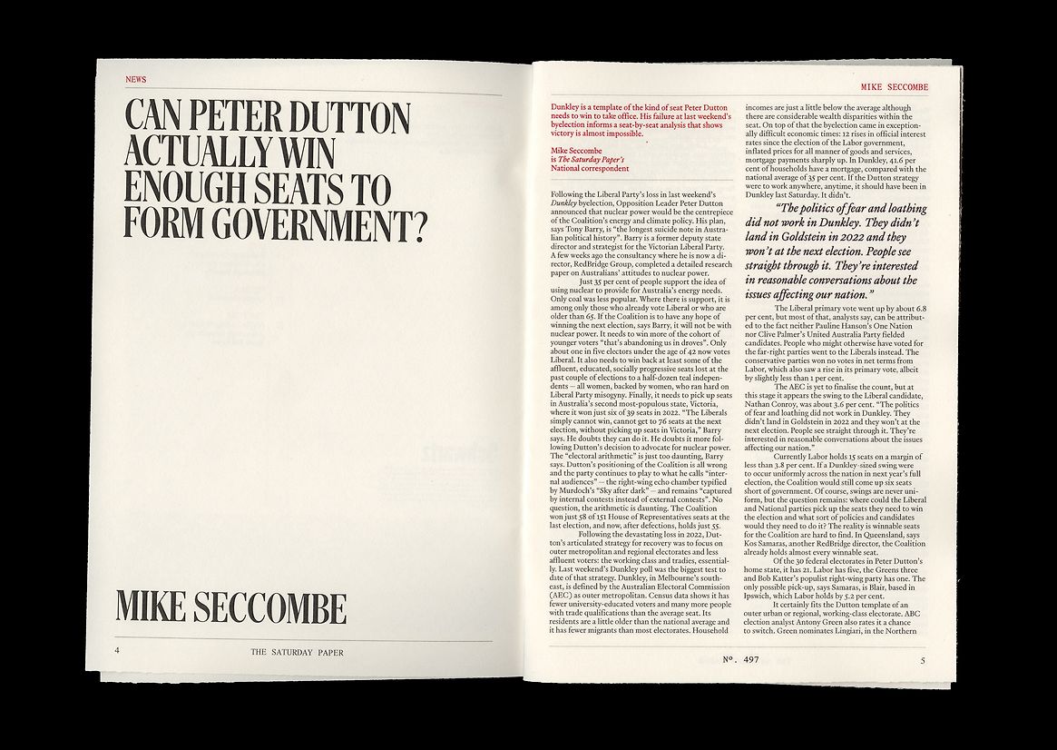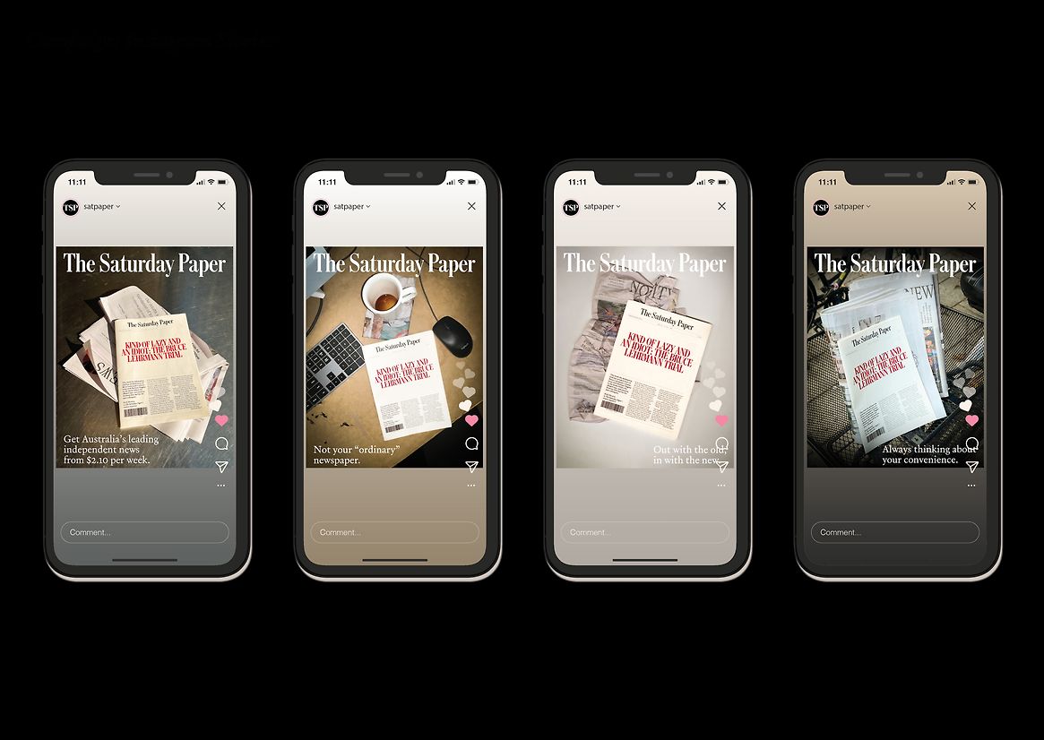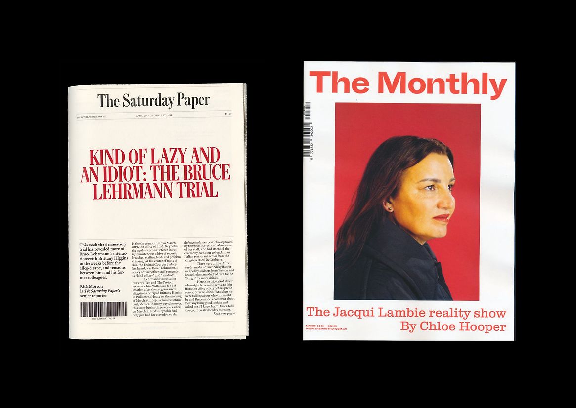 The design draws upon the strong typographic language of headlines on newsstands in Melbourne in the early to mid-20th century. The historical reference was integral to our overall design, drawing on the legacy of newspaper design systems with strong, trustworthy serifs as well as linking it to a local historical context. Bold headlines replace images emphasising the witty and eye-catching headlines and showcasing The Saturday Paper's unique tone of voice.