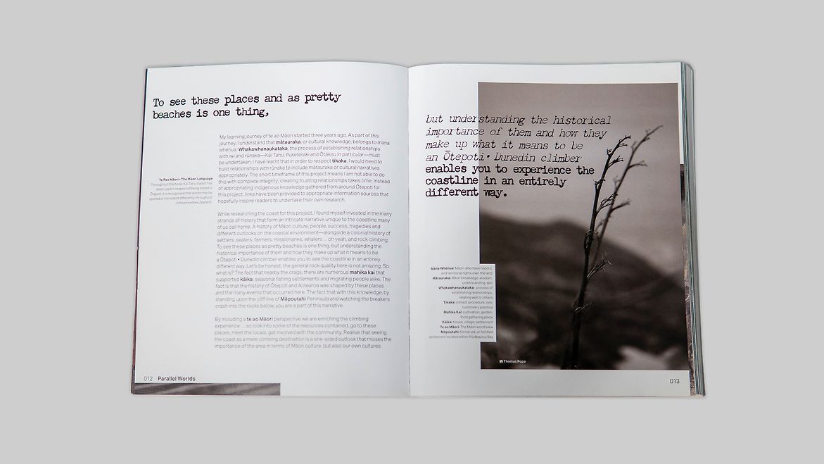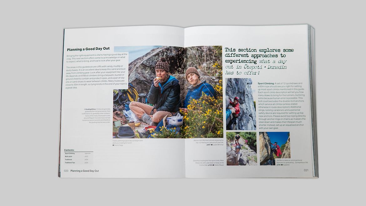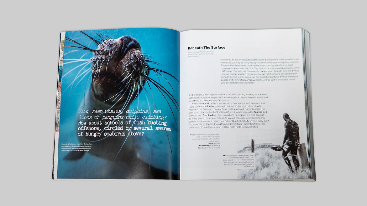 Southern Faces responds to a 25-year absence of a dedicated climbing guidebook for Ōtepoti Dunedin - a region known for its dramatic sea cliffs, lush forest crags, and passionate local climbing community. But rather than simply filling a gap in information, this project saw an opportunity to redefine what a guidebook could be. The aim was to create a publication that not only guides climbers to routes, but fosters a deeper connection to the land, its histories and its people.