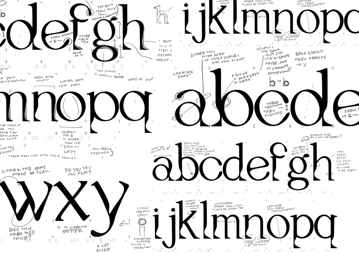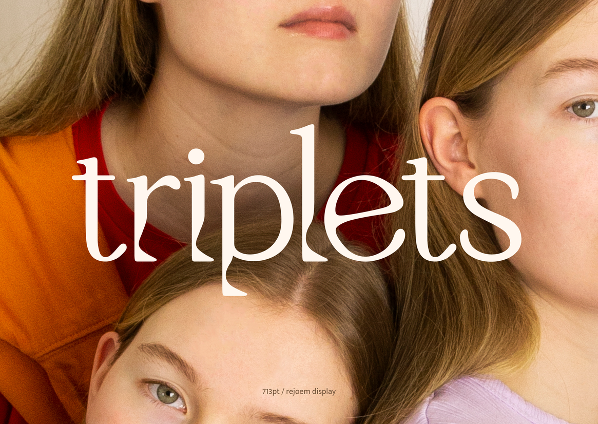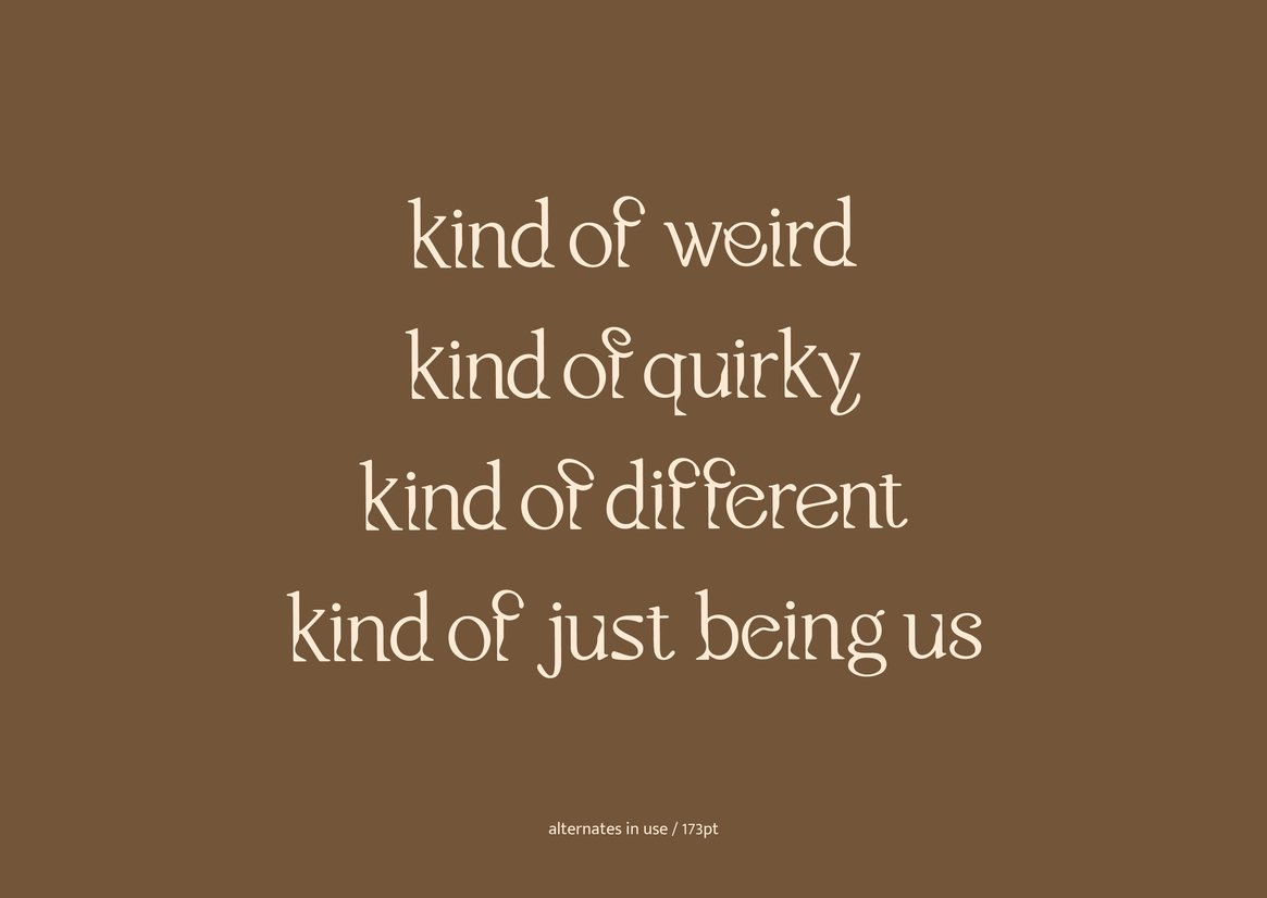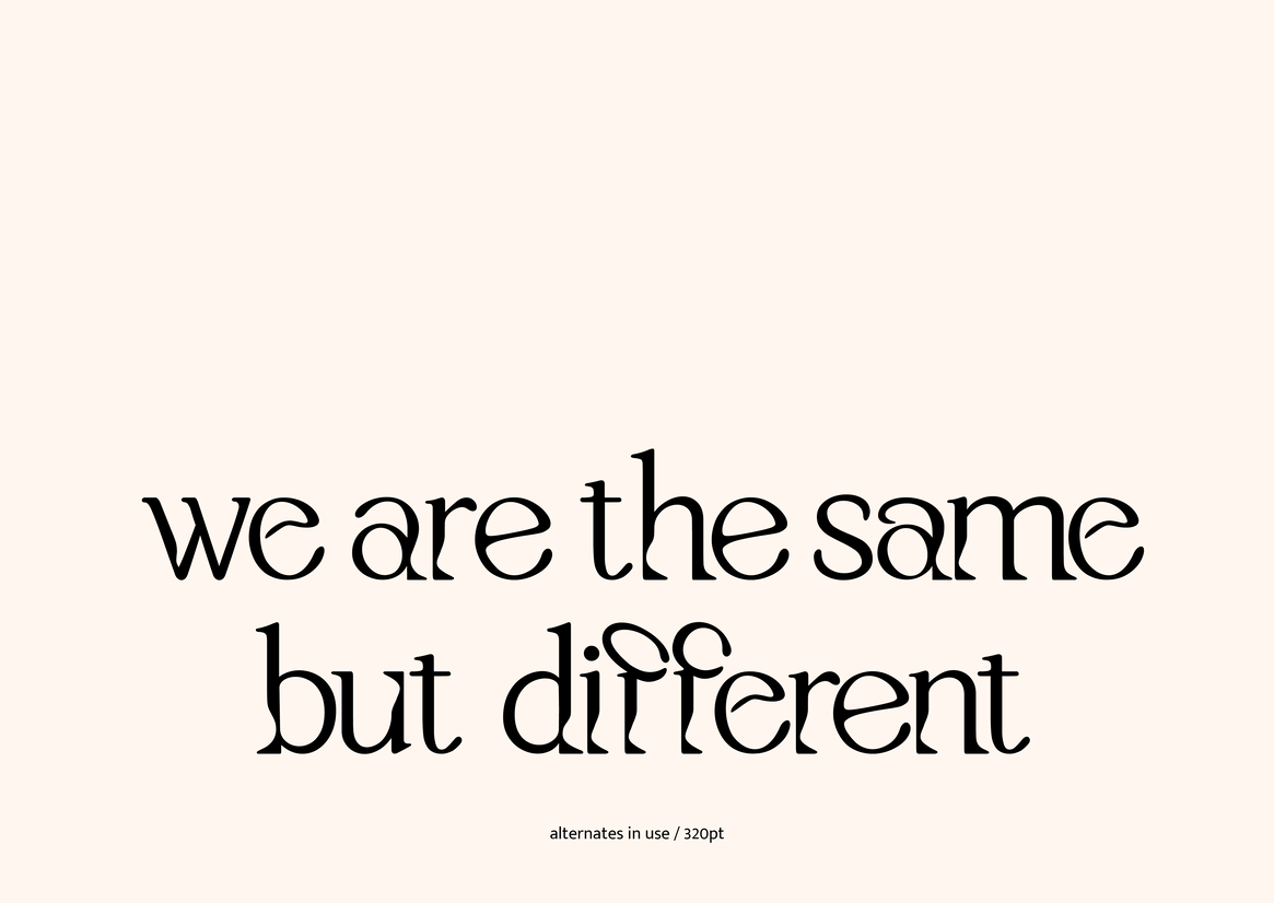It also references the notion of being the 'same but different' with each letter itself being different, but all having an indented stem or curved edge, which therefore makes them similar. The alternates and ligatures are an important extension of this theme as they directly reference triplets. With two alternate characters for a select amount of letters, the letterset can be used to showcase three different letters in slightly different styles. The ligature set leans towards ‘connection’ and can be used to create links across a maximum of three letters.