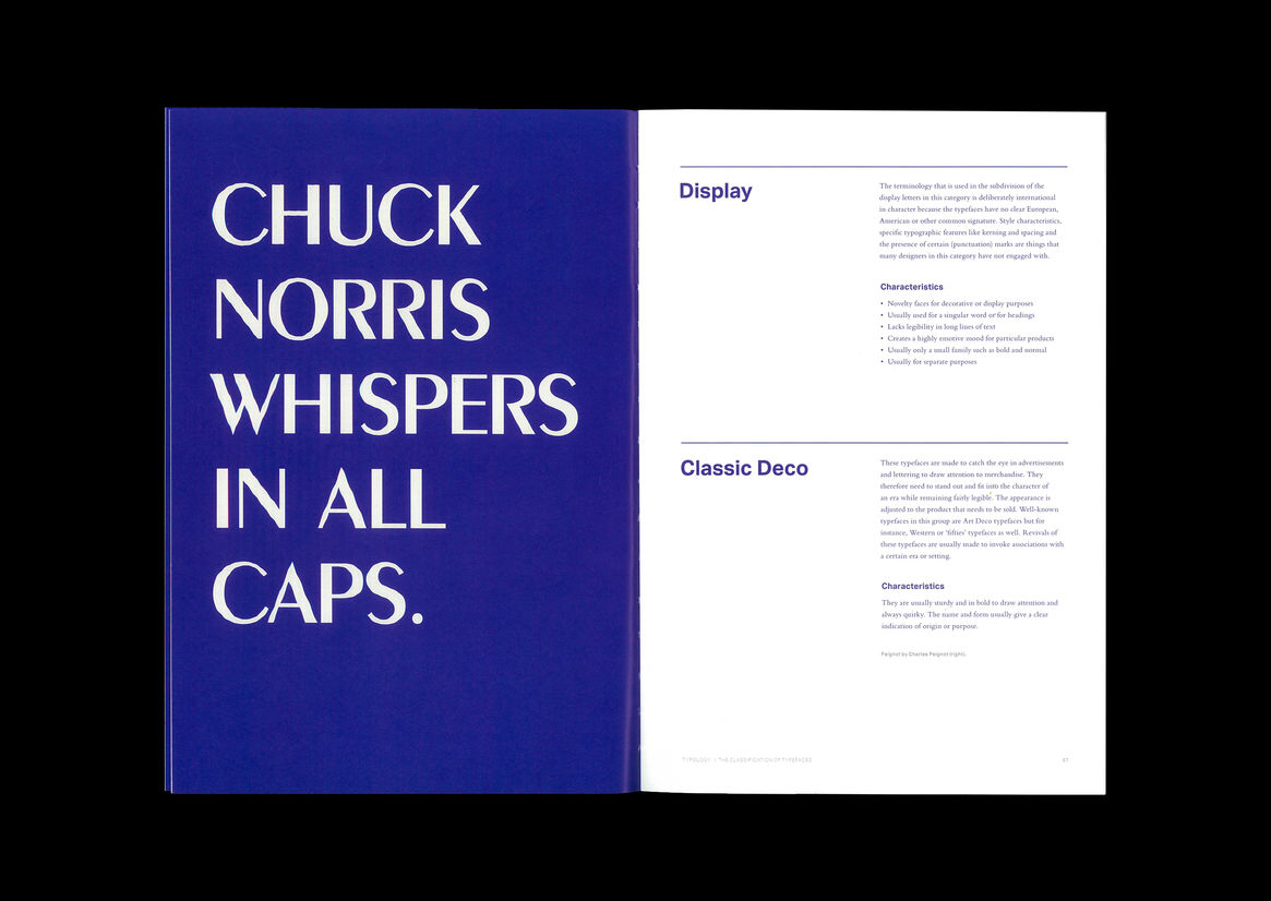 Graphic Business Communication Colour Award Graphics Design Communication Design Craft Editorial and Books Environmental Graphics Large Brand Identity Packaging Self Promotion Small Brand Identity Student & Academic Graphics Animation Digital Film Graphic Moving Image (archived 2025) Product Social Good Award Spatial Toitanga Value of Design Award User Experience Award (archived 2019) All categories Business Communication Colour Award Graphics Design Communication Design Craft Editorial and Books Environmental Graphics Large Brand Identity Packaging Self Promotion Small Brand Identity Student & Academic Graphics All years 2025 2024 2023 2022 2021 2020 2019 2018 2017 2016 2015 2014 2013 2012 2011 2010 Studio A-Z Rosamund Chen 2 Typology: The Classification of Typefaces Finalist 2017 Student & Academic Graphics Credits Kaiako / Lecturer Fay McAlpine & Jo Bailey School Massey University College of Creative Arts